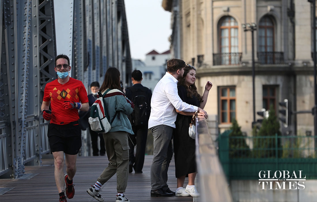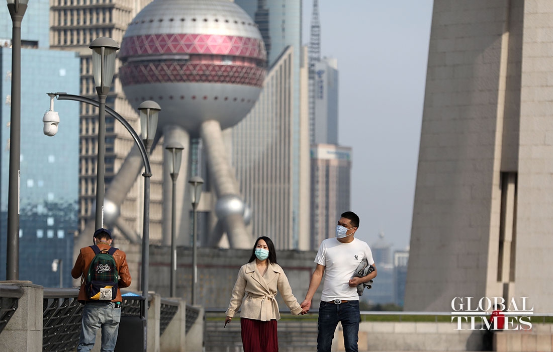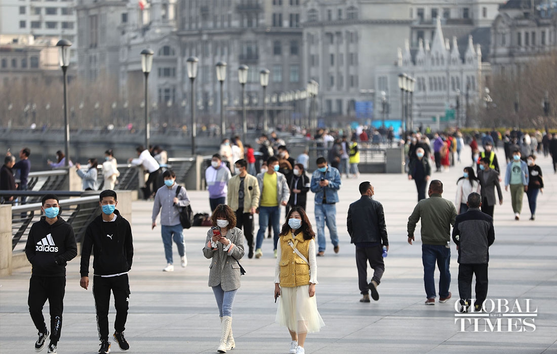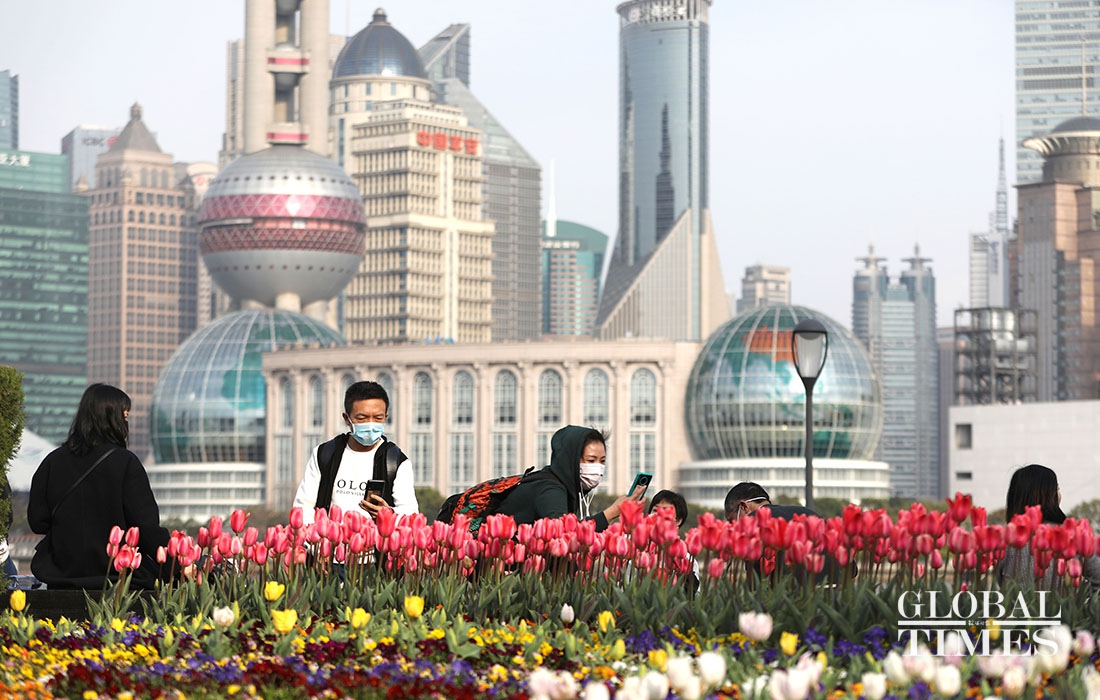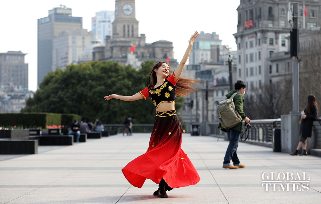 Temperature in Shanghai reached 20 degrees Celsius on Tuesday. Many visitors were seen strolling at the city's popular tourist spots like Nanjing West Road and The Bund in Shanghai. Residents took off their heavy winter coats and basked under the soothing sunshine. In some spacious public places, some people even took off their masks and danced to express their joy amid a refreshing gust of wind. (Photos: Yang Hui/GT)