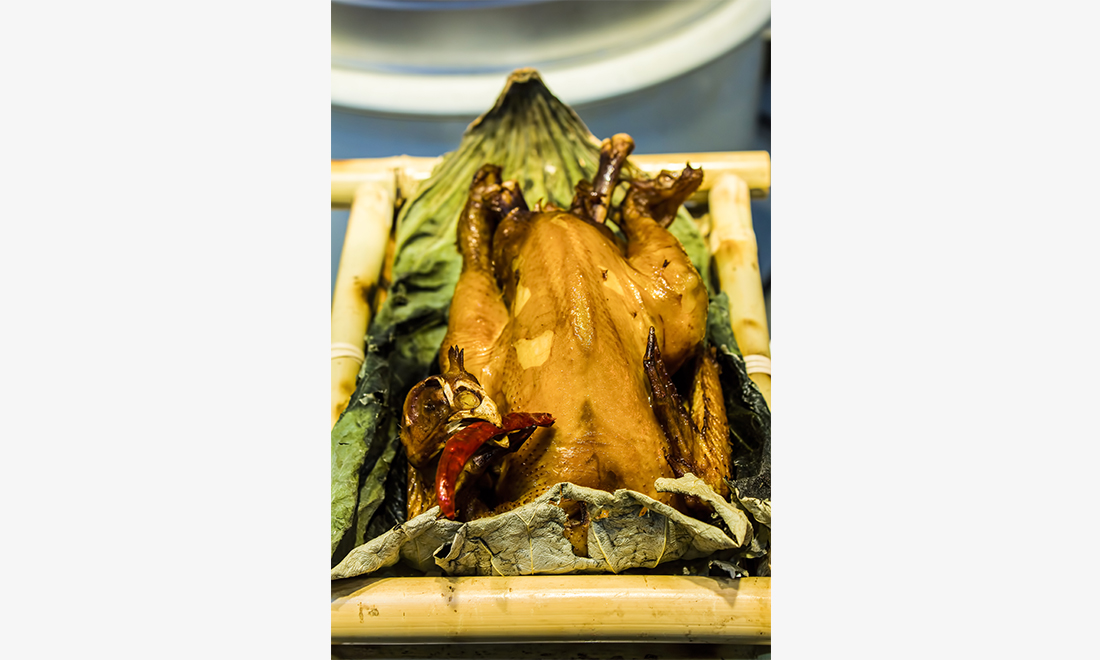 Beggar’s chicken, or stuffed roast chicken wrapped in lotus leaves, gets its name from a folktale. Back in the Qing dynasty (1644-1911), a hungry beggar was caught stealing a chicken, and was chased by its rightful owner. In order to hide his loot, the beggar wrapped the chicken with lotus leaves, and buried it in the mud before running away. The beggar later returned and roasted the muddy package directly over his fire. When he unwrapped the leaves, he discovered a delicious tender chicken hidden within. Photo: IC