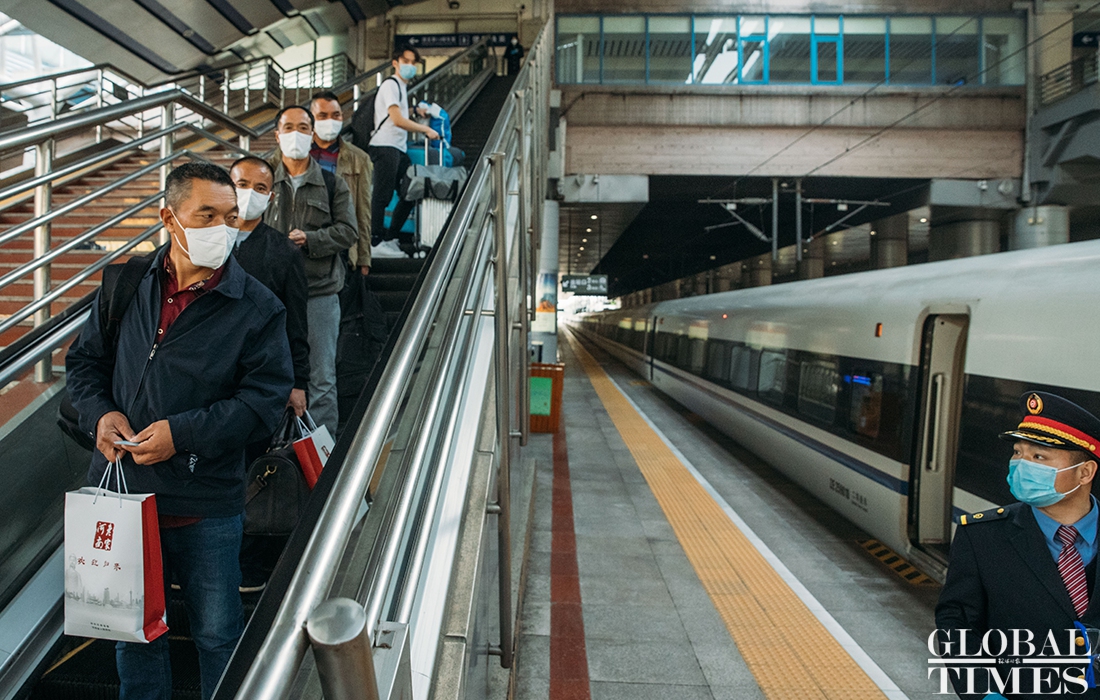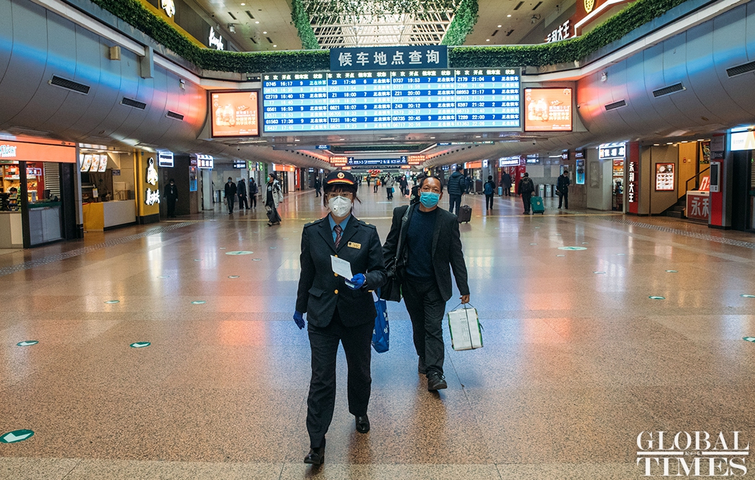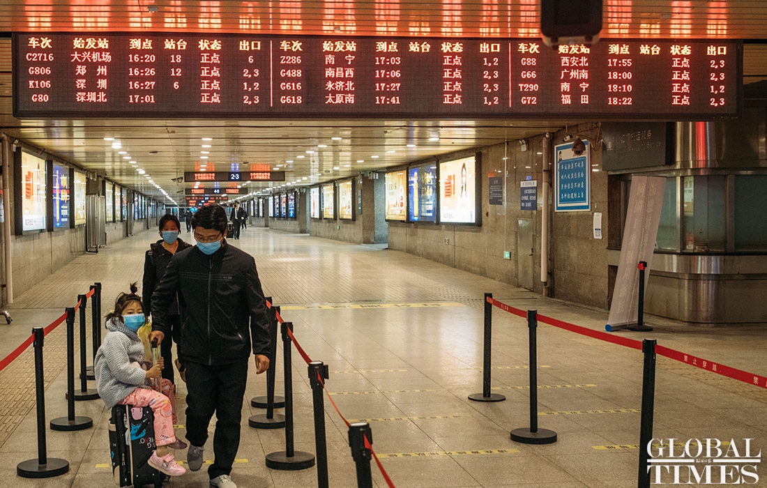 Overseas arrivals in Beijing were ushered into a special waiting room in Beijing West Railway Station as they left for their respective destinations, sitting on designated isolated seats on the train. 156 passengers were transferred Tues. The station recorded 12000 and 17000, outbound and inbound commuters, respectively, on Tues.