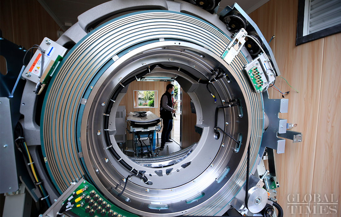 Workers from MinFound Medical Systems Co, a CT manufacturer based in Shaoxing, East China's Zhejiang Province, produce CTs in the workshops that are used to combat the coronavirus. More than 30 mobile CT systems, named CT Ark, manufactured by the company have been used in Wuhan to diagnose COVID-19, and many CTs will be shipped to foreign countries like Italy and Germany to help fight against the pandemic. Photos: Yang Hui/GT