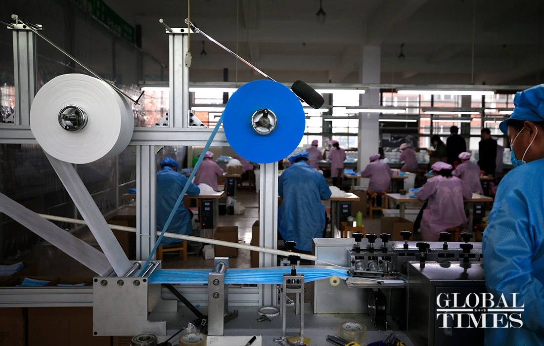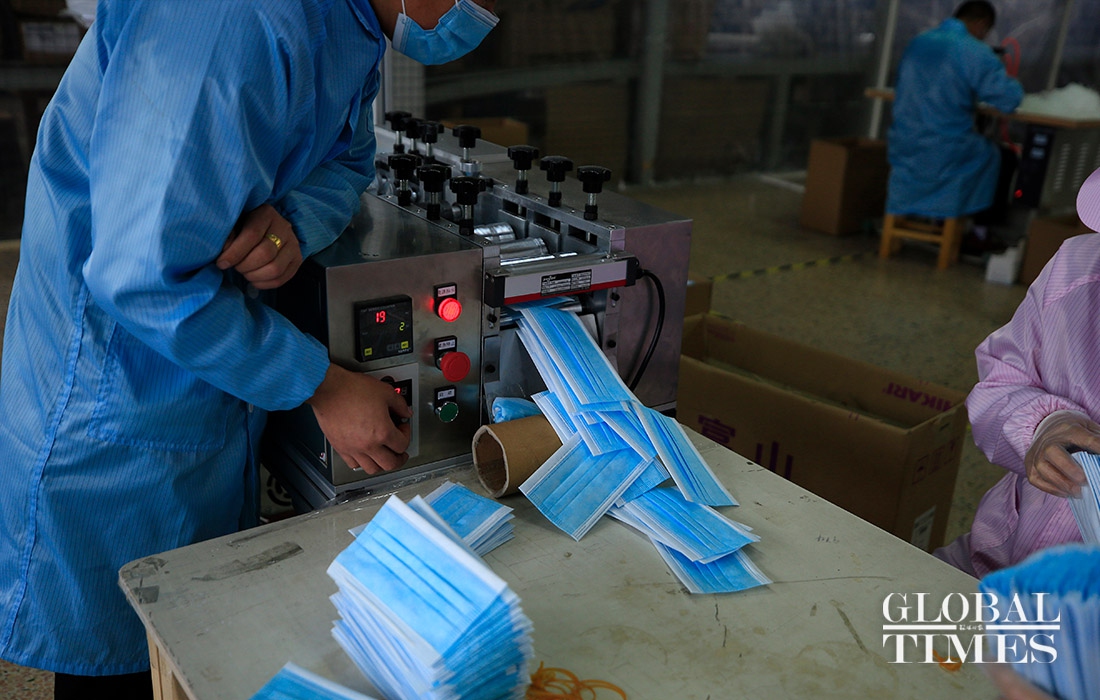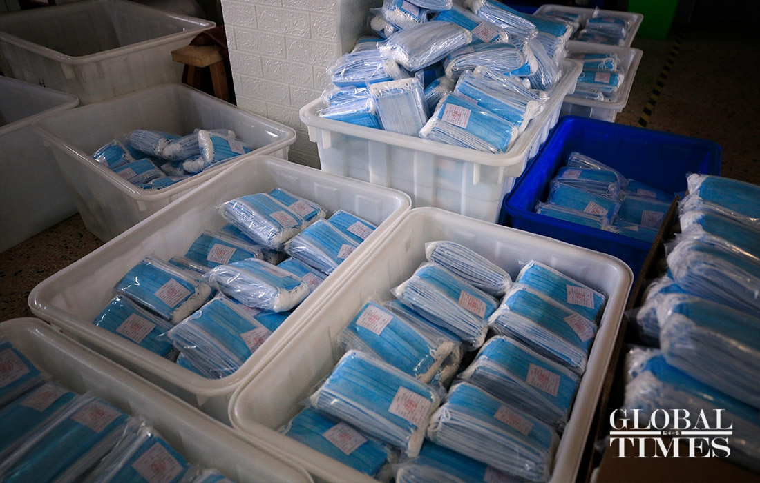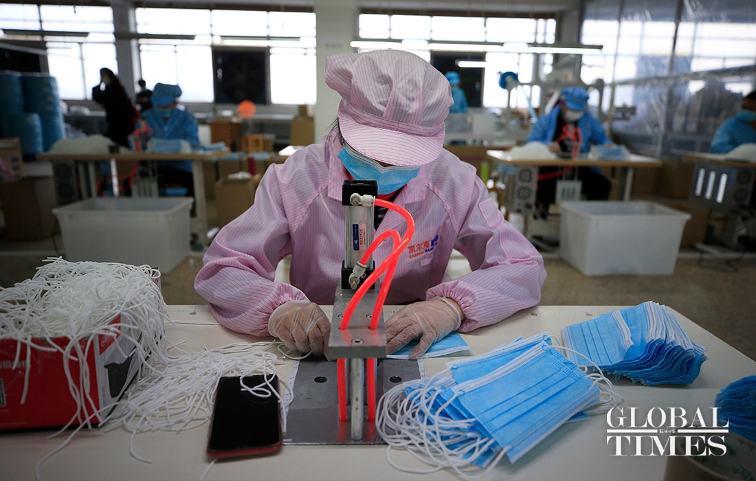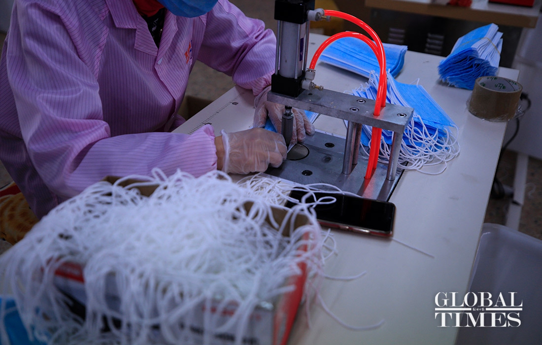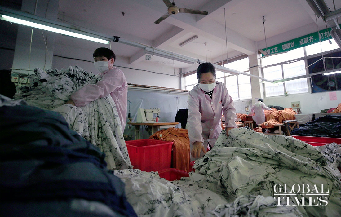 KAIERHAI, a clothing company in East China’s Zhejiang Province are striving to shift its production to mask manufacturing to offset the loss caused by declined orders amid the coronavirus outbreaK. Their workshop is split into garment manufacturing and mask production now. (Photos: Yang Hui/GT)