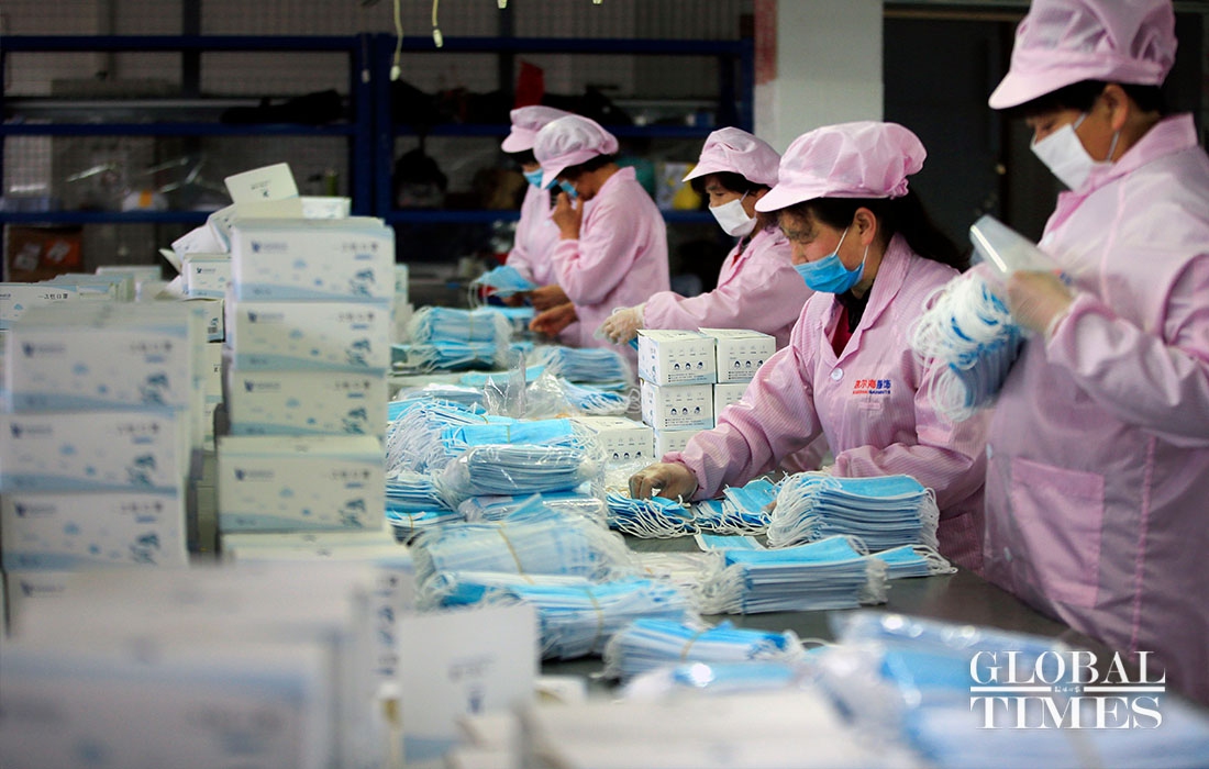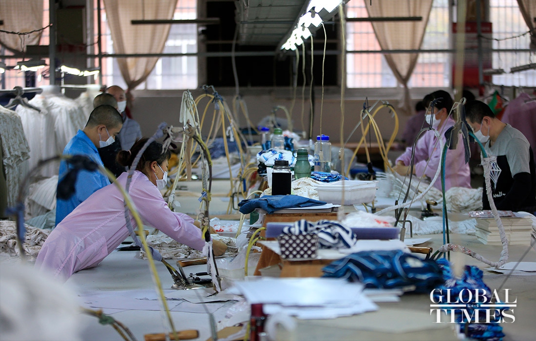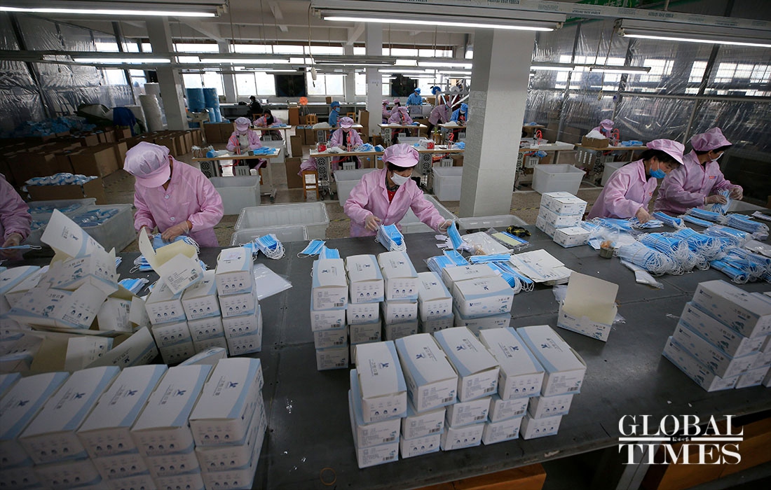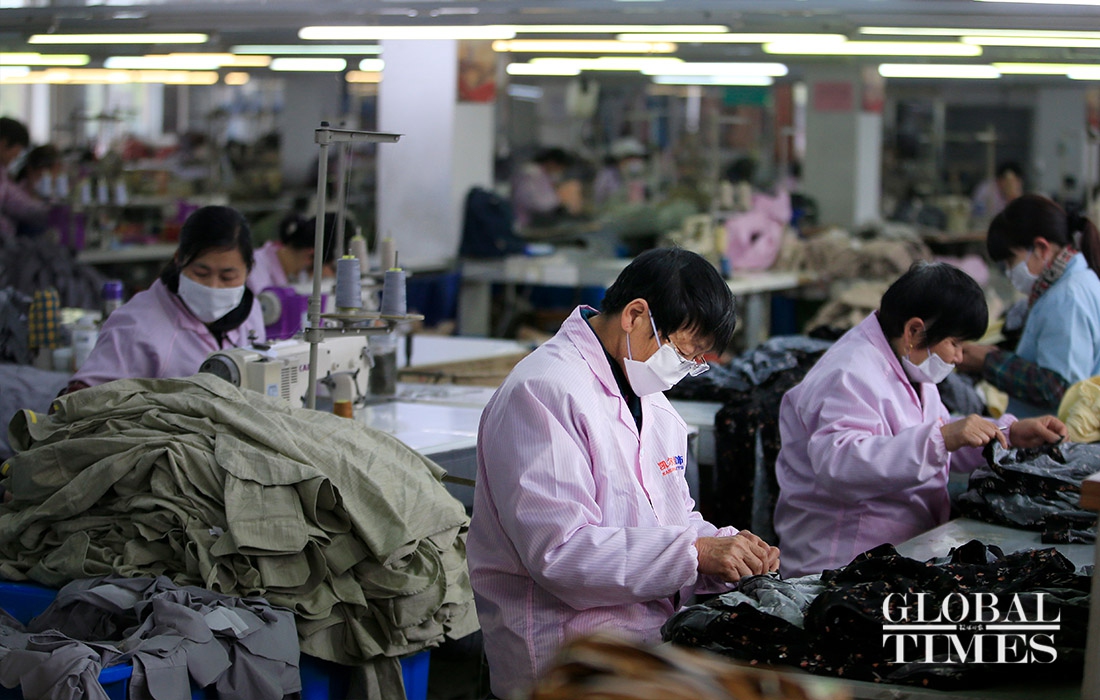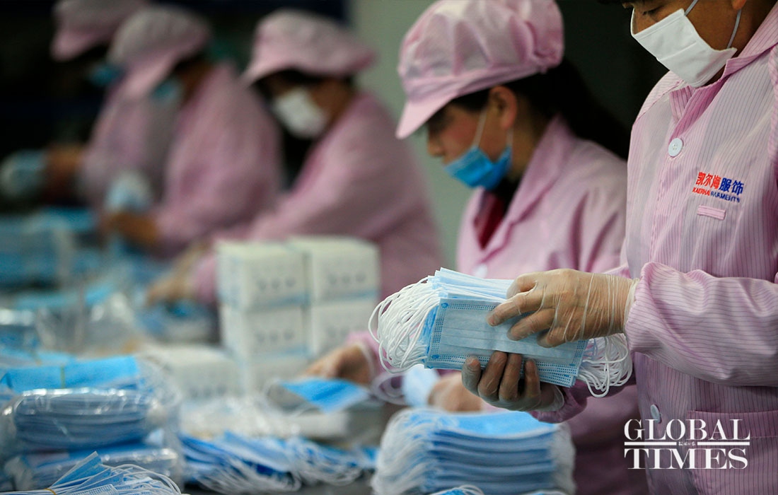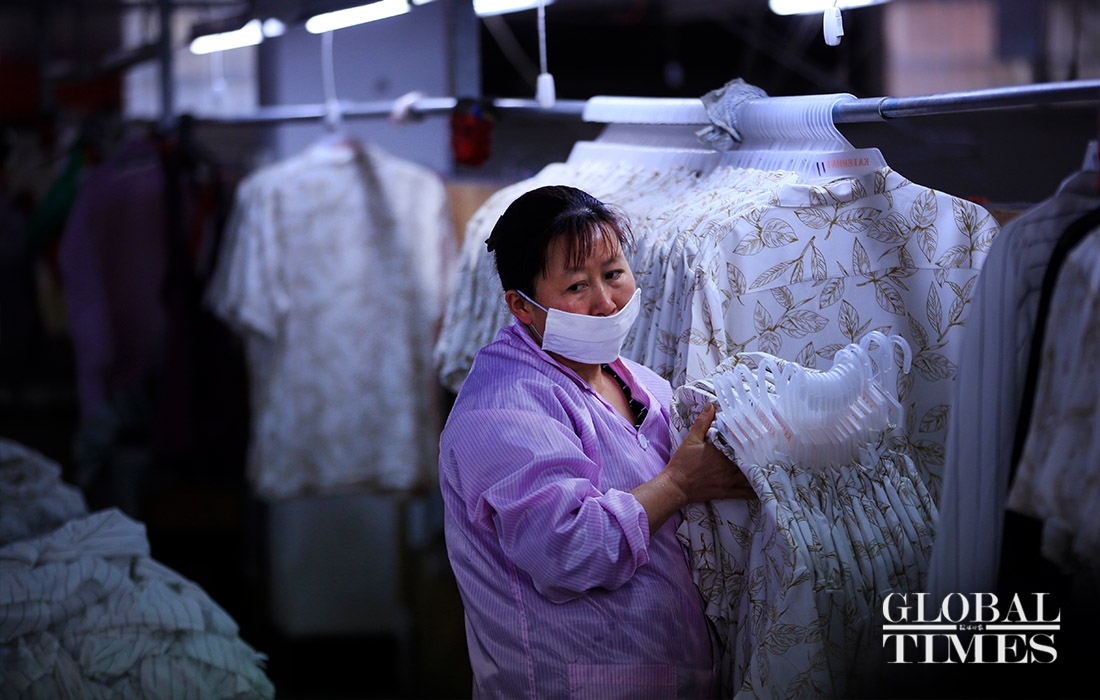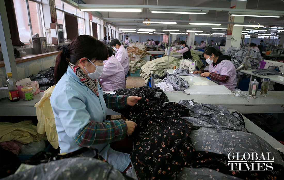 KAIERHAI, a clothing company in East China’s Zhejiang Province are striving to shift its production to mask manufacturing to offset the loss caused by declined orders amid the coronavirus outbreaK. Their workshop is split into garment manufacturing and mask production now. (Photos: Yang Hui/GT)