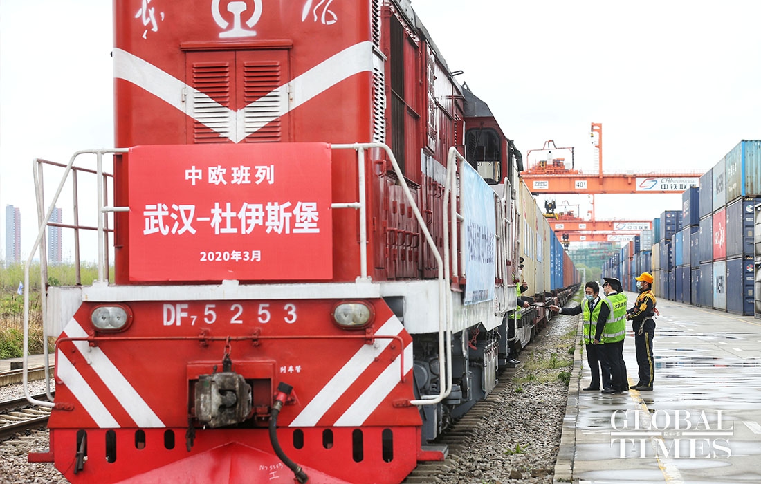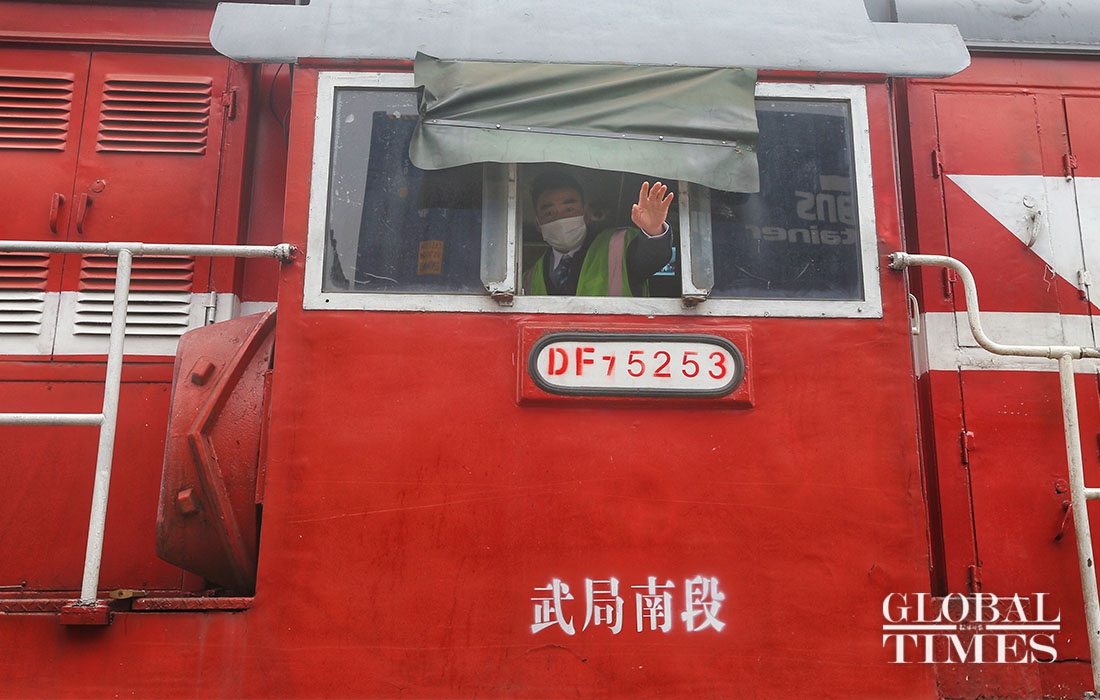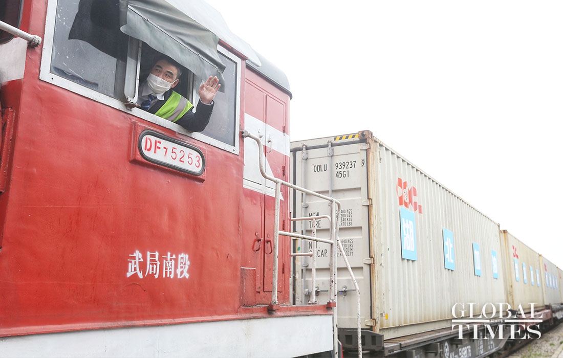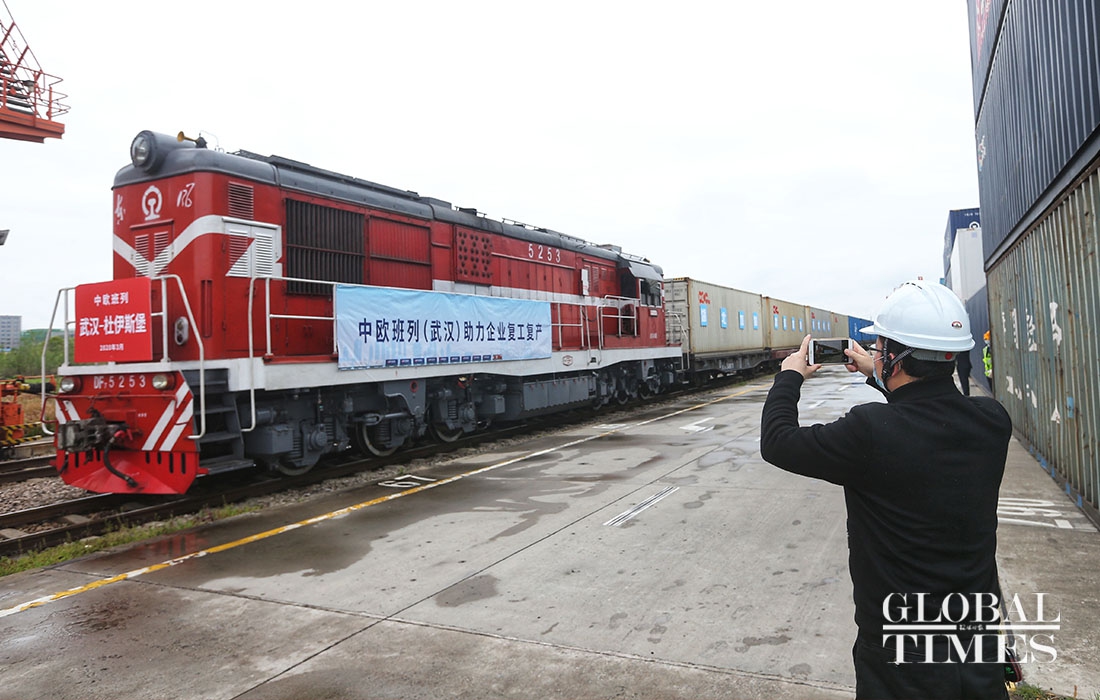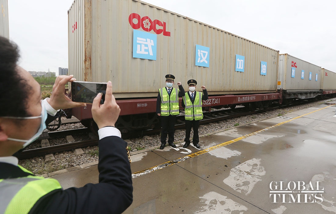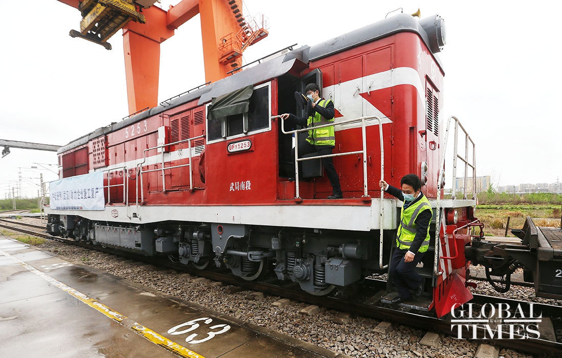 A cargo freight train, X8015/6, departed from Wuhan, Hubei Province on Saturday, carrying 50 containers of supplies to Europe, signaling the resumption of China-EU freight transport. This is the first China-EU cargo freight train service after the city was locked down due to the outbreak of COVID-19 in January. 90 percent of the supplies are from the local companies in Wuhan, including 166.4 tons of medical (textiles) supplies. The train will arrive in Germany a fortnight later, thereafter, the supplies will be dispatched to France, Germany, Poland, Czech and other European countries. (Photos: Cui Meng/GT)
