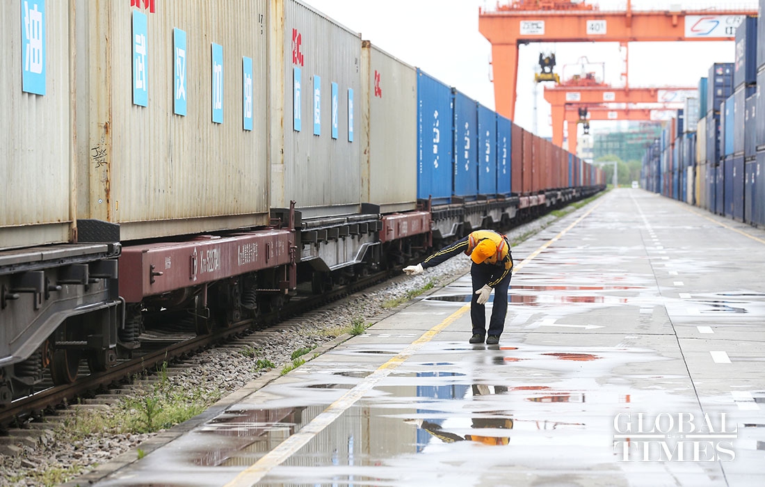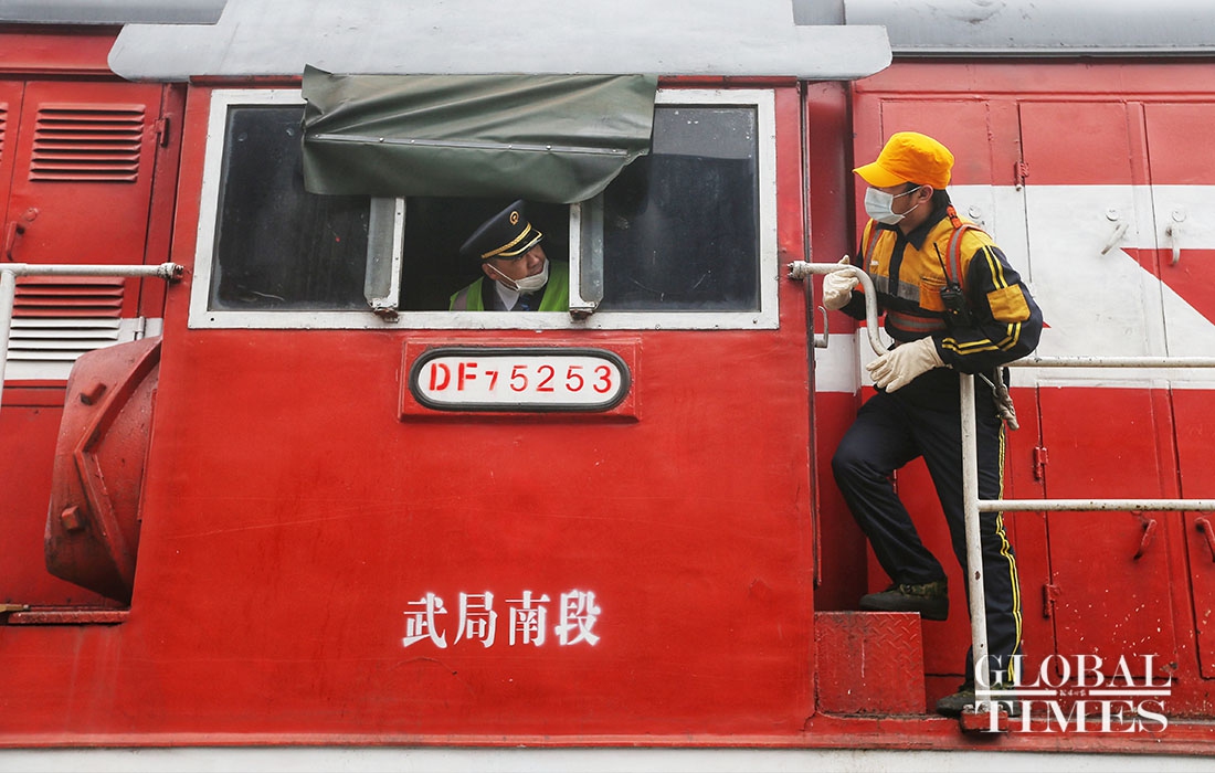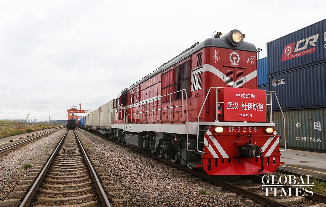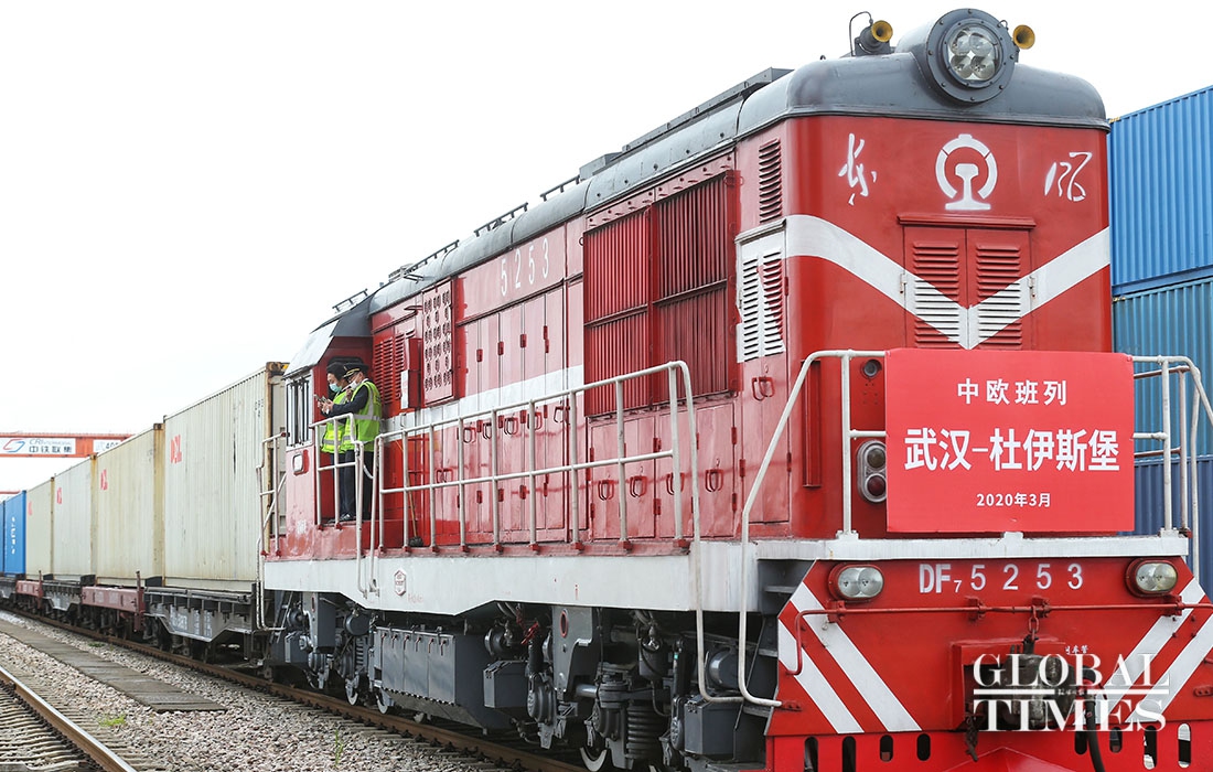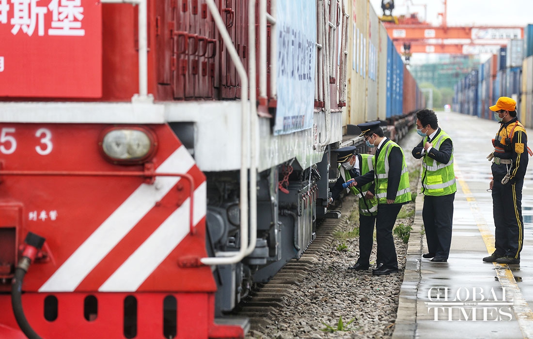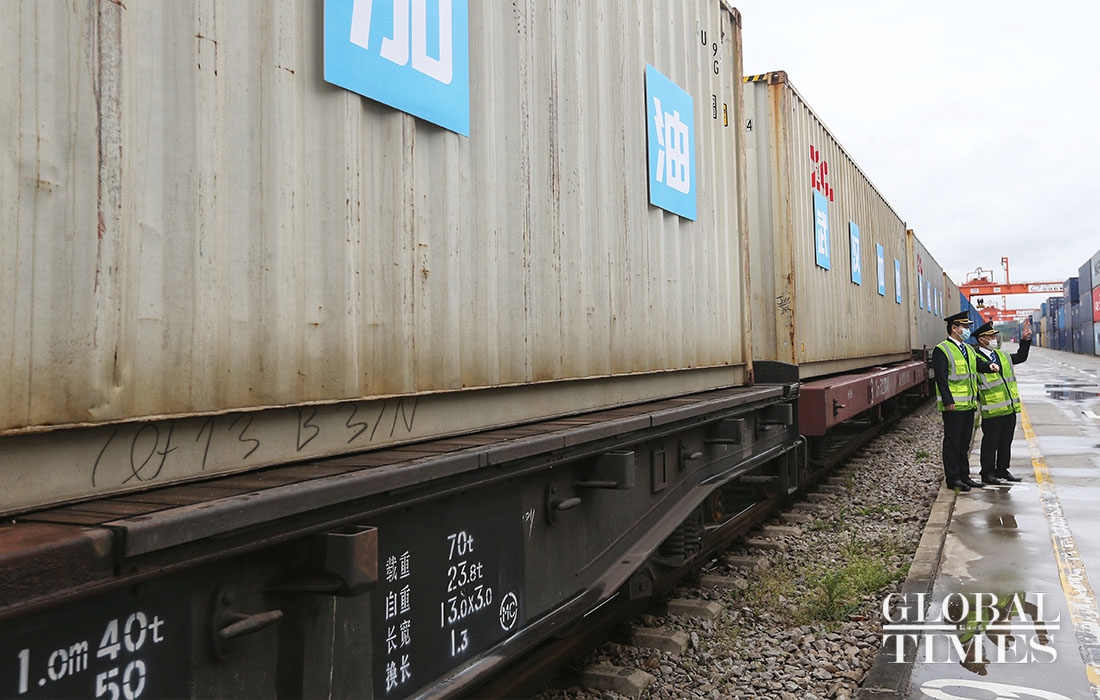 A cargo freight train, X8015/6, departed from Wuhan, Hubei Province on Saturday, carrying 50 containers of supplies to Europe, signaling the resumption of China-EU freight transport. This is the first China-EU cargo freight train service after the city was locked down due to the outbreak of COVID-19 in January. 90 percent of the supplies are from the local companies in Wuhan, including 166.4 tons of medical (textiles) supplies. The train will arrive in Germany a fortnight later, thereafter, the supplies will be dispatched to France, Germany, Poland, Czech and other European countries. (Photos: Cui Meng/GT)