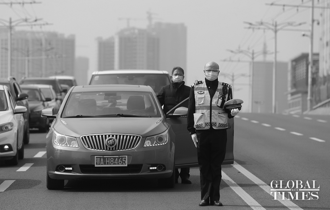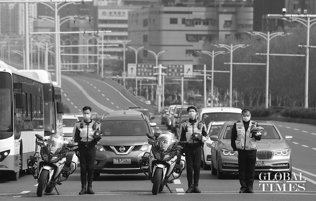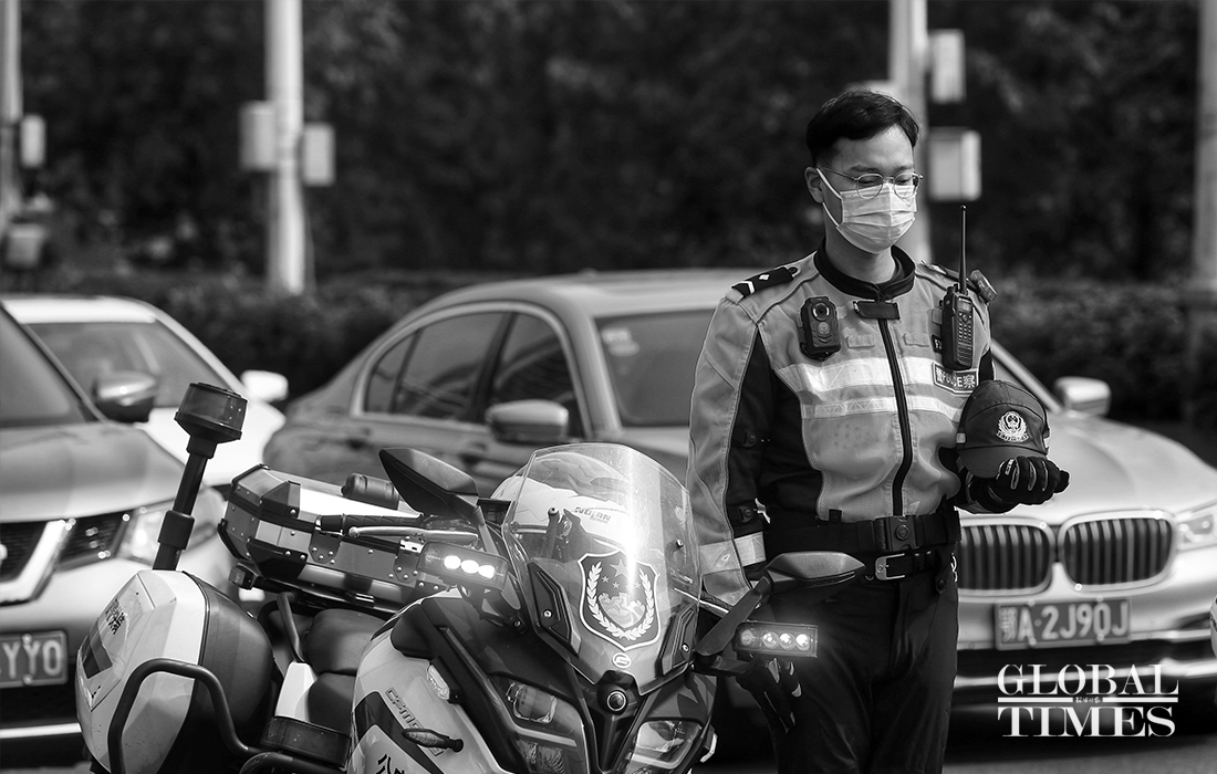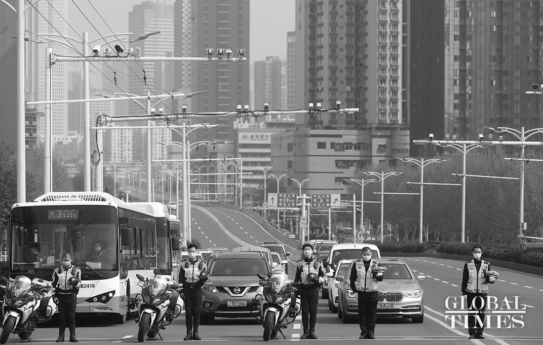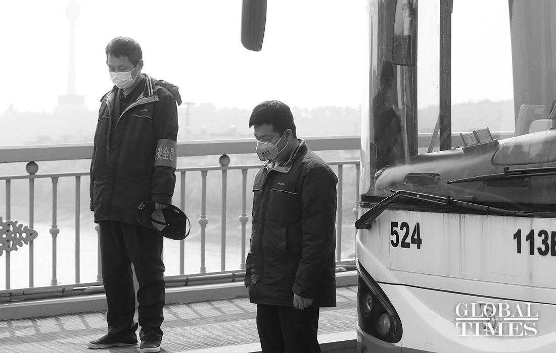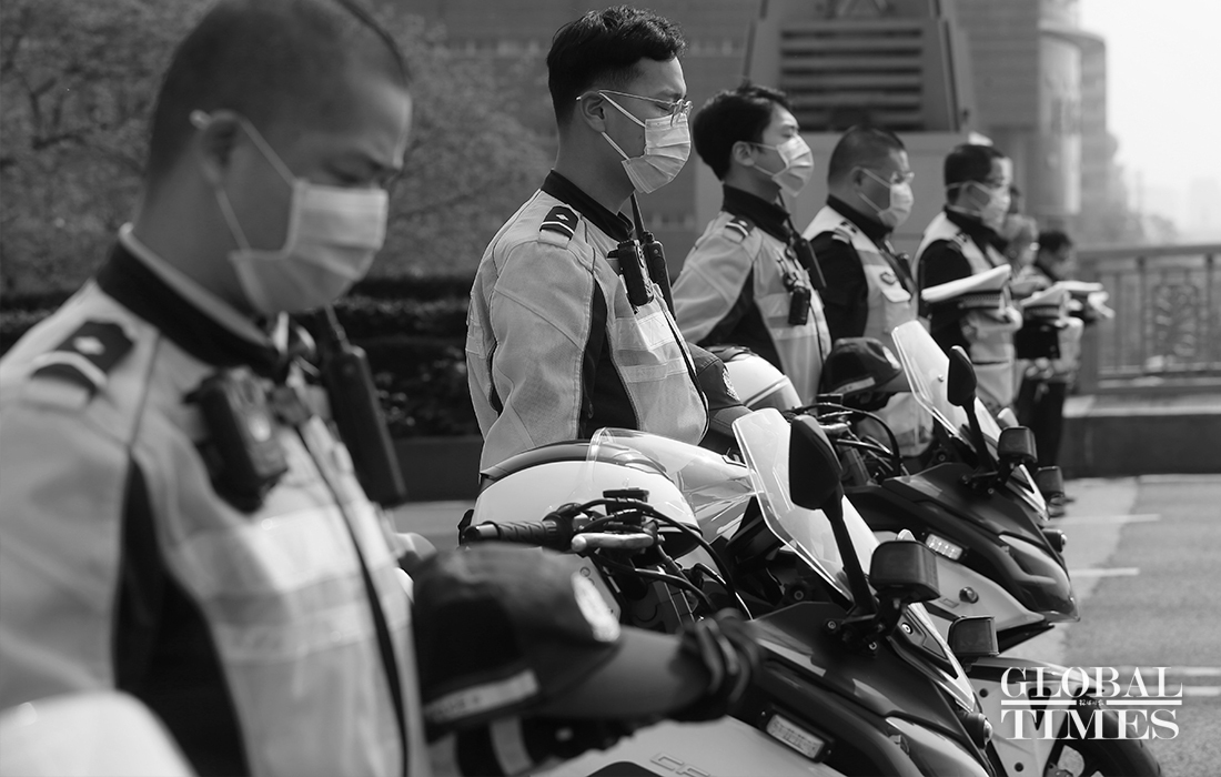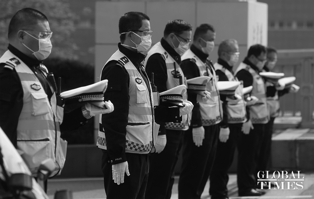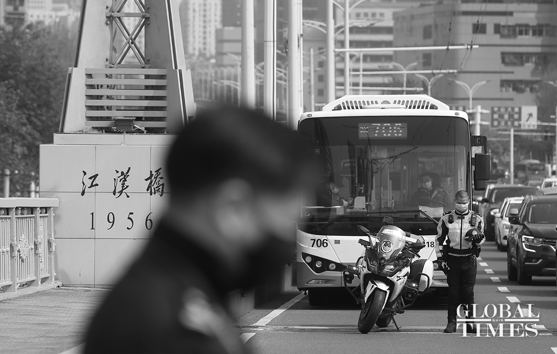 At 10 am, April 4, Wuhan Qiaokou police station traffic brigade's officers mourn COVID-19 victims on Yangtze River Bridge (Photos: Cui Meng/GT)