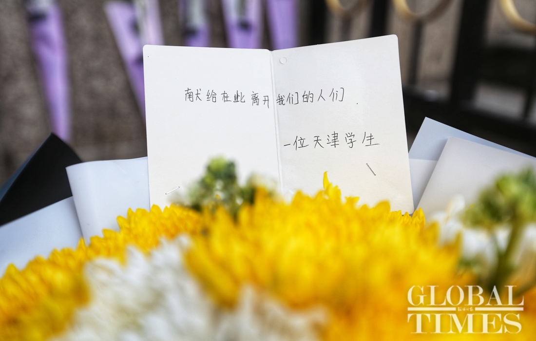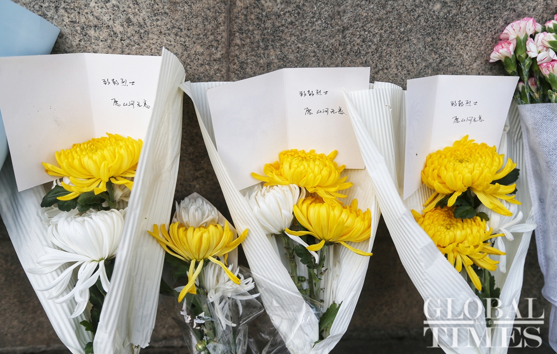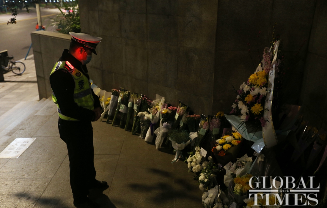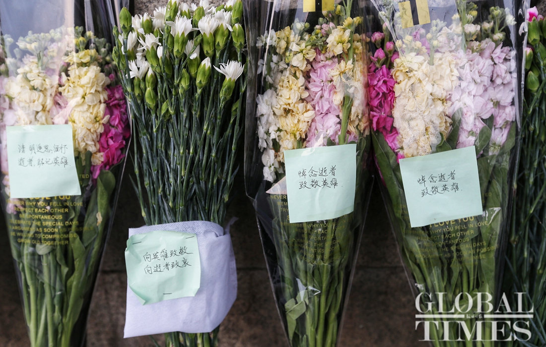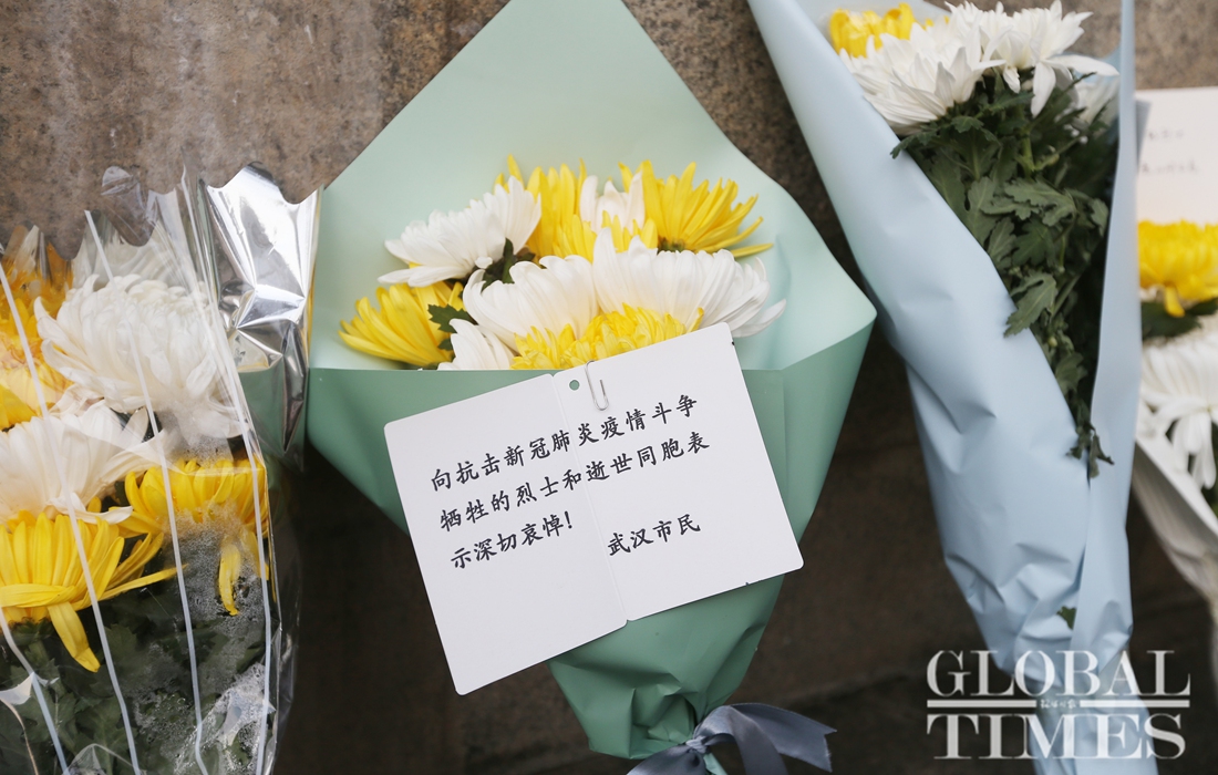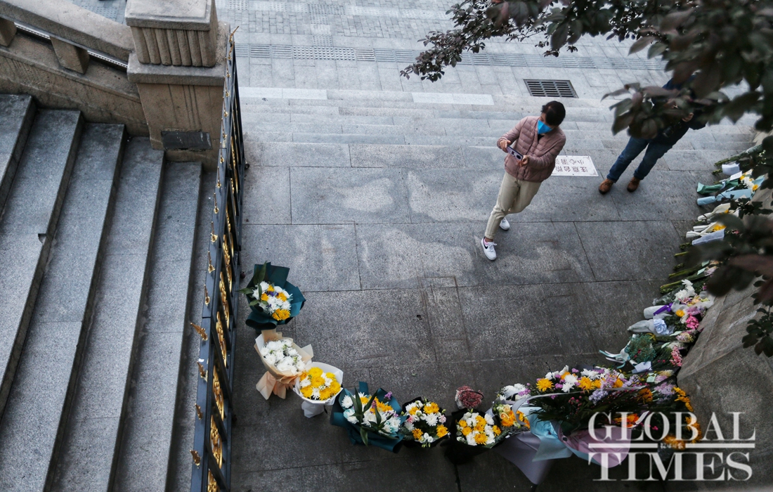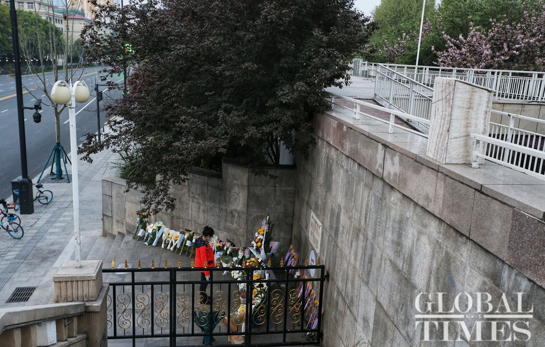 Wuhan residents lay flowers near the Hankou River beach to pay tribute to COVID-19 victims on Saturday. China held a nationwide mourning to commemorate the 3,335 victims since the COVID-19 outbreak. Photos: Cui Meng/GT