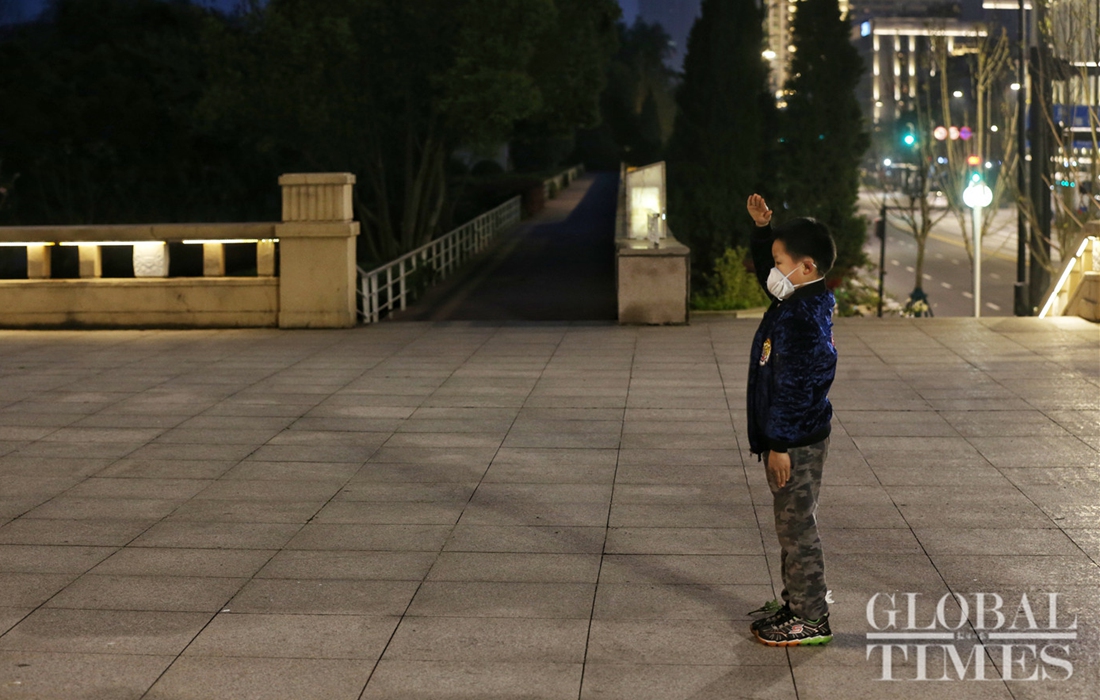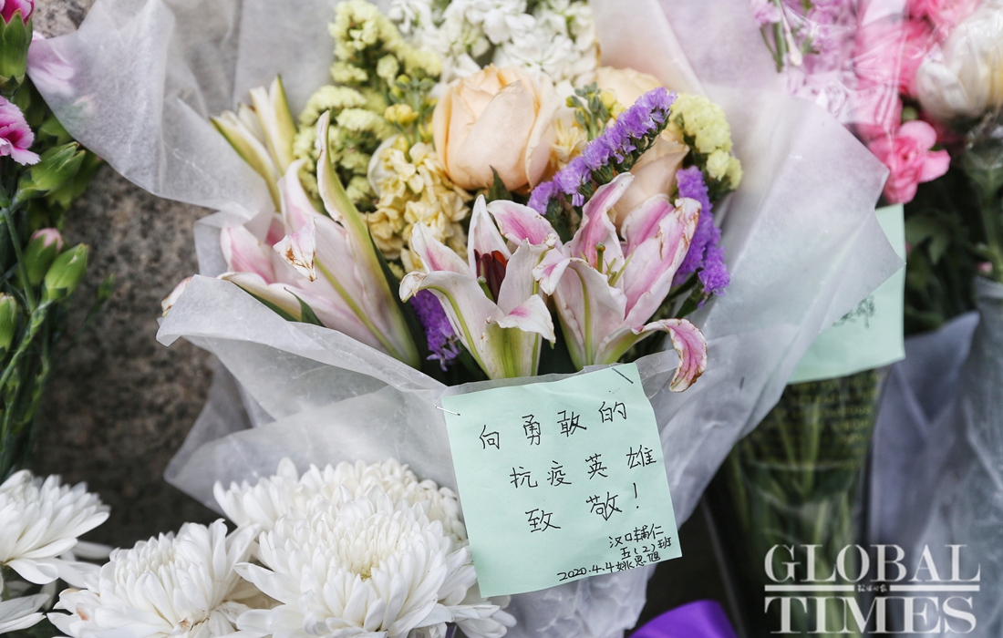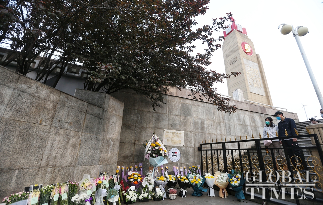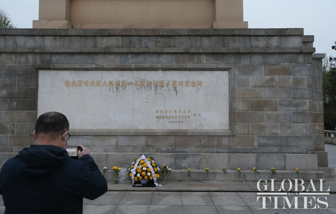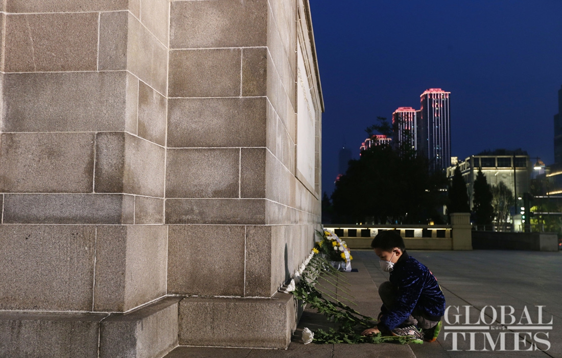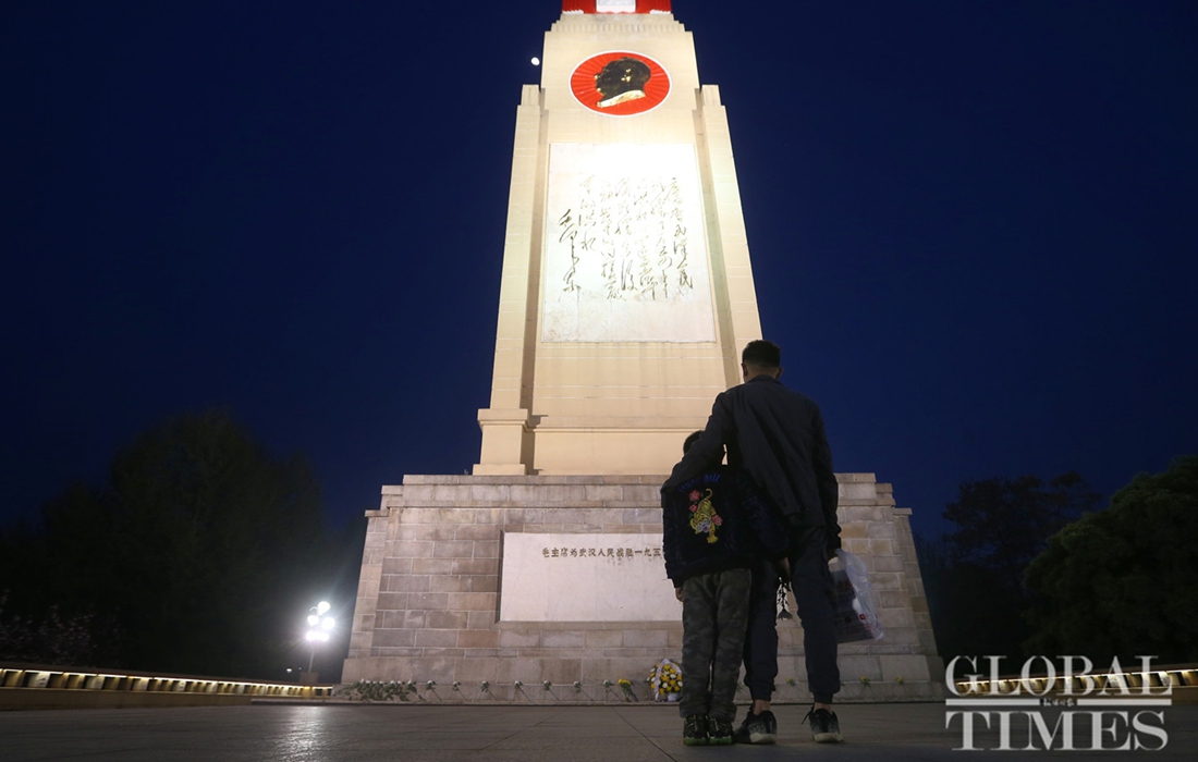 A father took his 8-year-old son to present flowers to heroes who sacrificed during the fight against the COVID-19 in front of a monument near the Hankou River beach in Wuhan on April 4. The father said he wanted his son to remember this special day. Photo: Cui Meng/GT figcaption >
