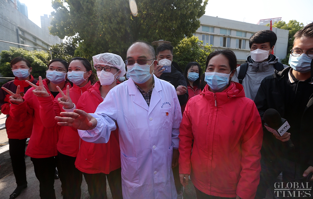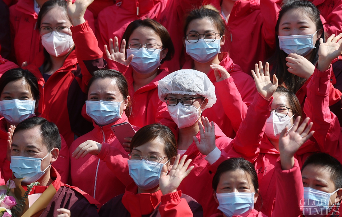 Medical personnel from Jiangsu Provincial Hospital wave goodbye in Wuhan on April 12, 2020. Photo: Cui Meng/GT figcaption >