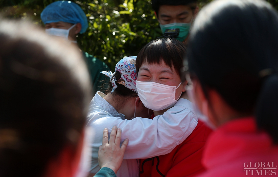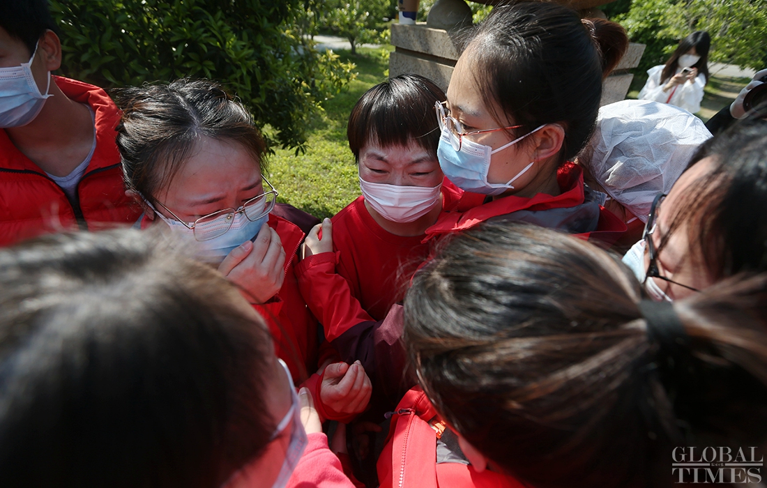 Medics from both hospitals cried and hugged each other during the farewell ceremony in Wuhan on April 12, 2020. Photo: Cui Meng/GT figcaption >