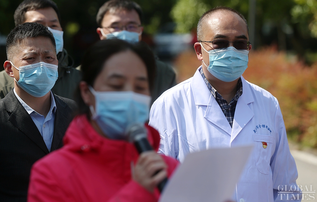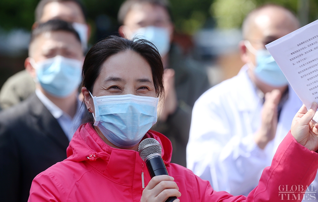 Liu Yun, lead of the medical support team and vice president of Jiangsu Provincial Hospital, expresses her gratitude to the medical personnel at Jinyintan Hospital in Wuhan on April 12, 2020. Photo: Cui Meng/GT figcaption >