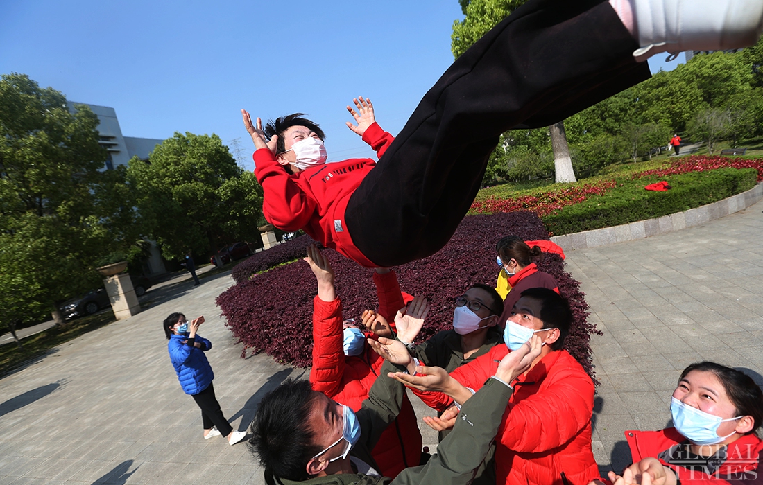 Liu Ying, head nurse of the medical support team from Jiangsu Province, is thrown in the air by her joyful colleagues in Wuhan on April 12, 2020. Photo: Cui Meng/GT figcaption >