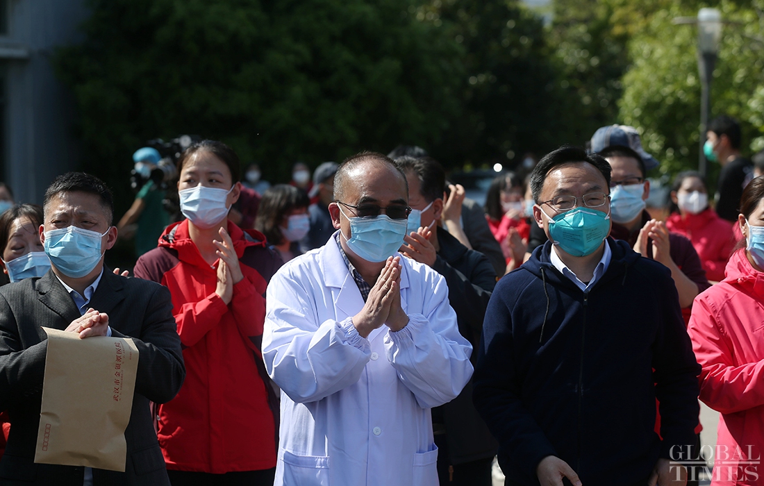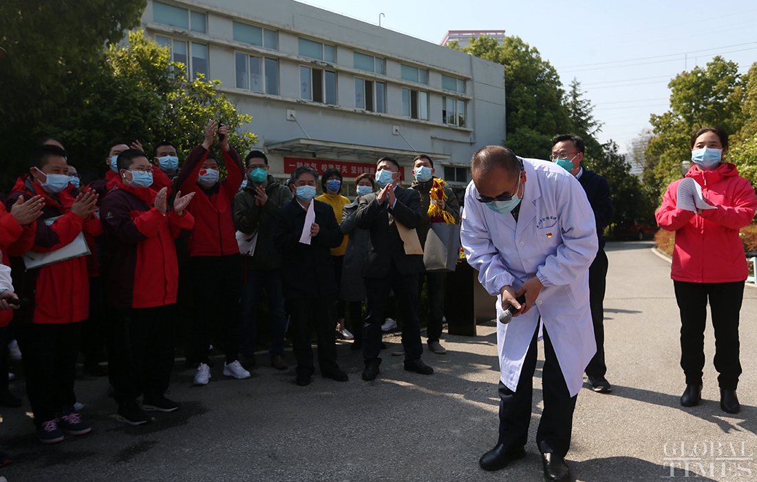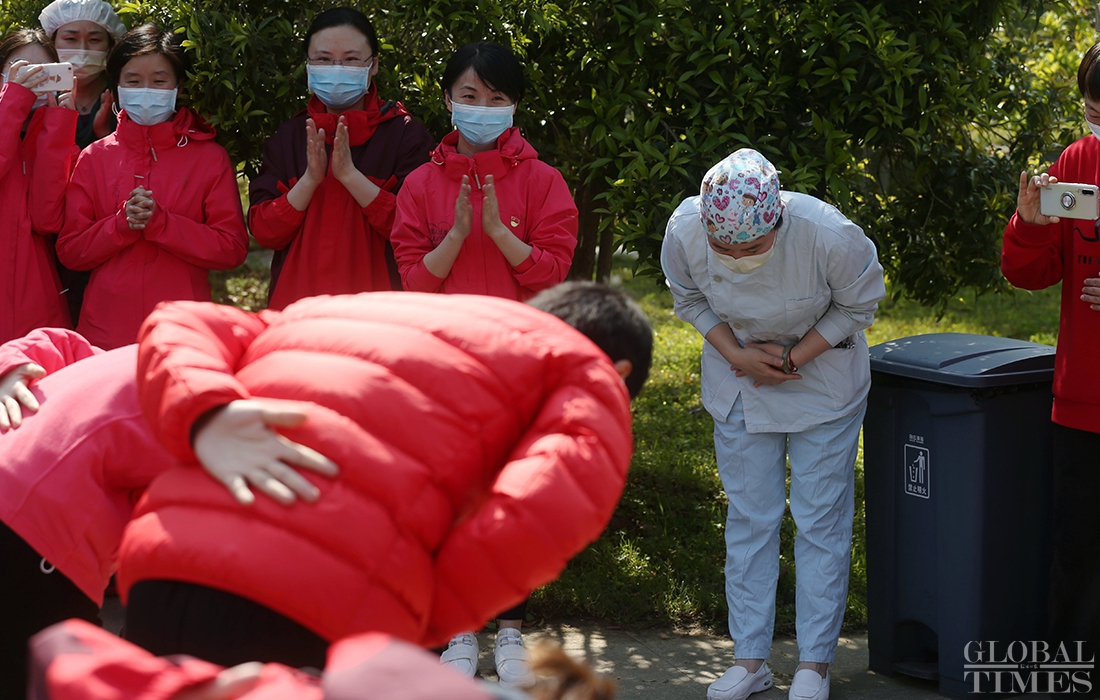 Medics from Jiangsu Provincial Hospital bow to Qu Zhaohui, head nurse of Jinyintan Hospital’s ICU, to show their gratitude in Wuhan on April 12, 2020. Photo: Cui Meng/GT figcaption >