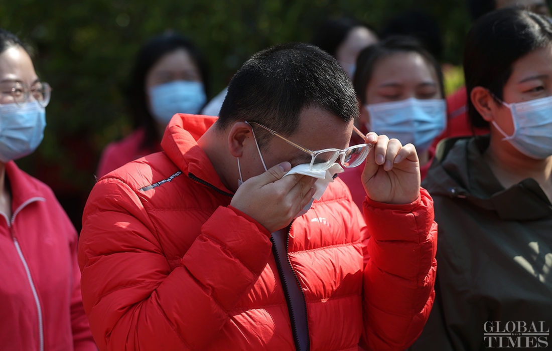 A member of the medical team from Jiangsu Provincial Hospital cries during the farewell ceremony at Jinyintan Hospital in Wuhan on April 12, 2020. Photo: Cui Meng/GT figcaption >