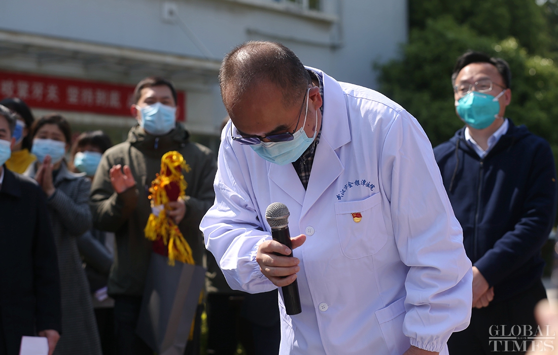 Zhang Dingyu, head of Jinyintan Hospital, bows to the medical team members from Jiangsu Provincial Hospital to show his gratitude in Wuhan on April 12, 2020. Photo: Cui Meng/GT figcaption >