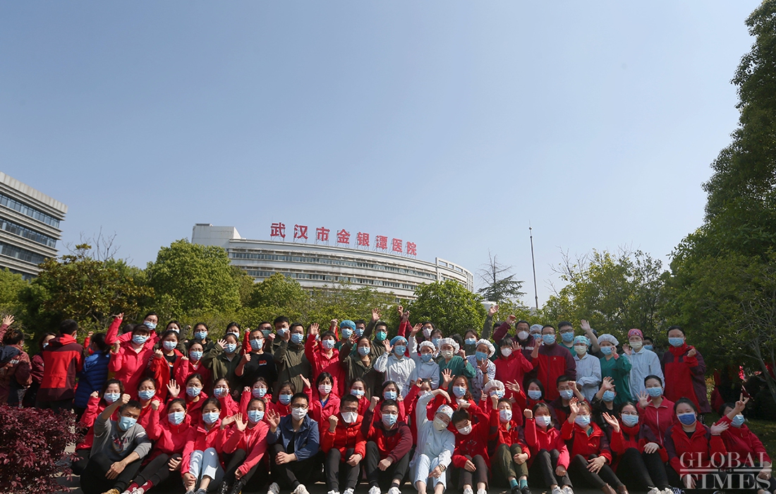 Medics from Jiangsu Provincial Hospital and Jinyintan Hospital pose for a group photo in Wuhan on April 12, 2020. Photo: Cui Meng/GT figcaption >
