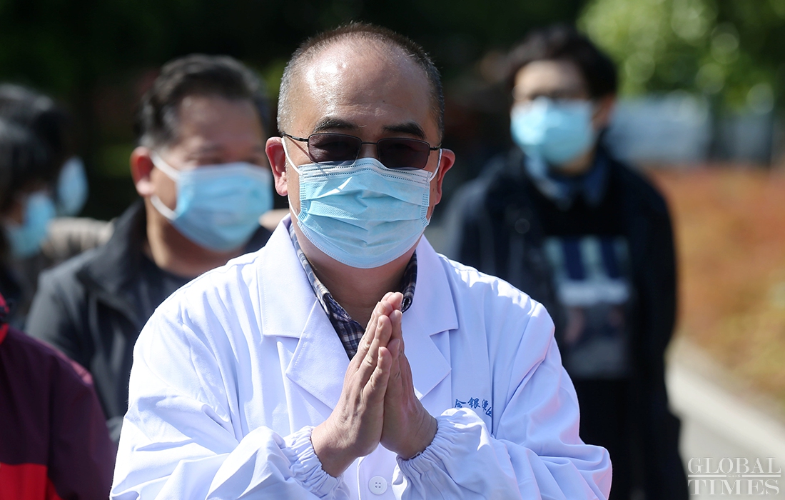 With hands folded, Zhang expresses his gratitude to the medical team from Jiangsu Provincial Hospital in Wuhan on April 12, 2020. Photo: Cui Meng/GT figcaption >