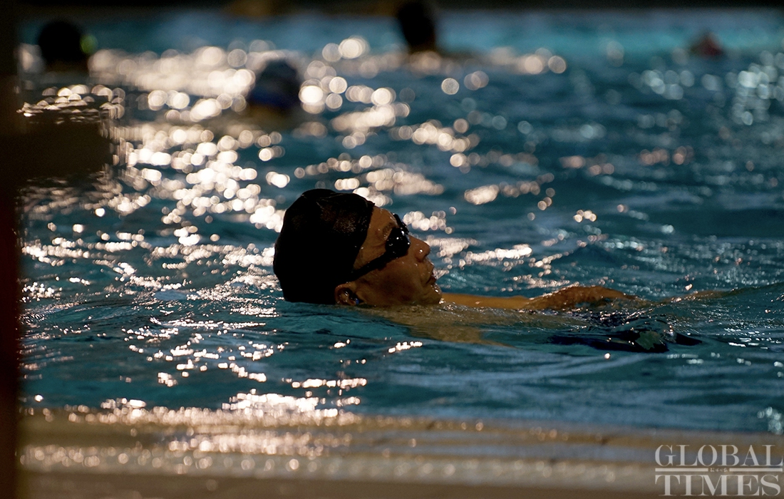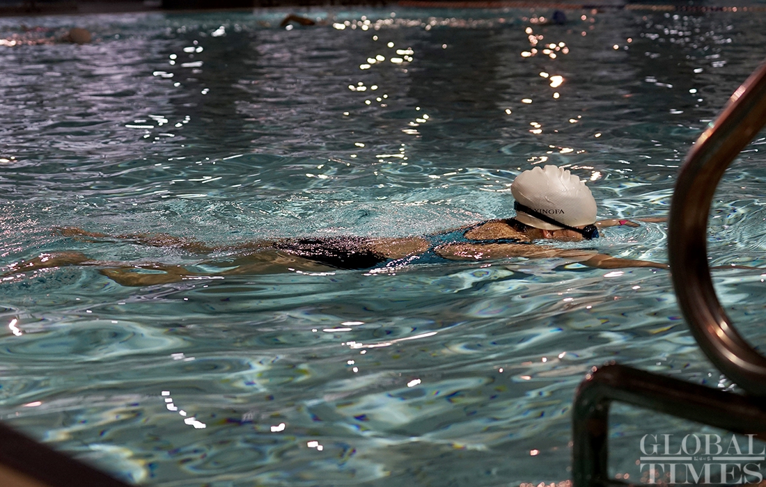 Residents enjoy a long-awaited swim at the Oriental Sports Center, Shanghai’s landmark swimming venue, on Monday. The venue has a limit on the number of visits and is only open twice a day, for 2.5 hours each time, in a bid to contain COVID-19. Visitors are required to make an appointment in advance.