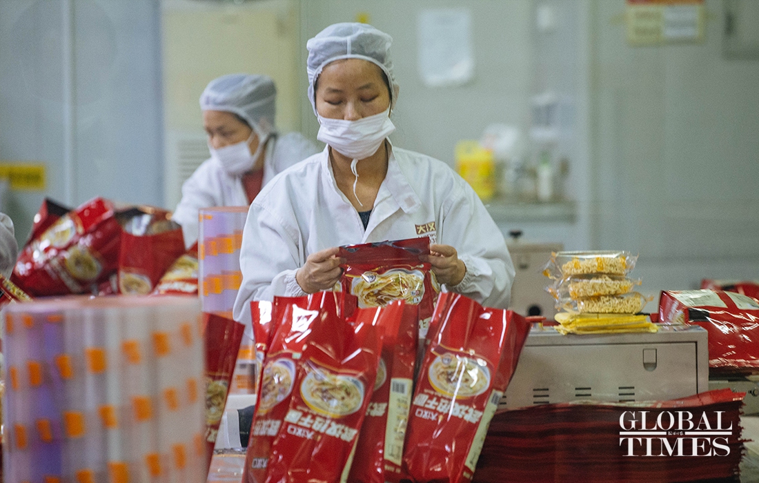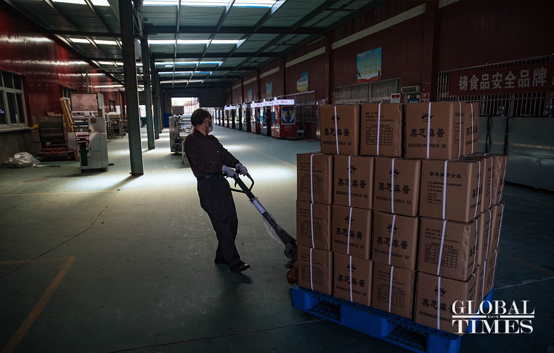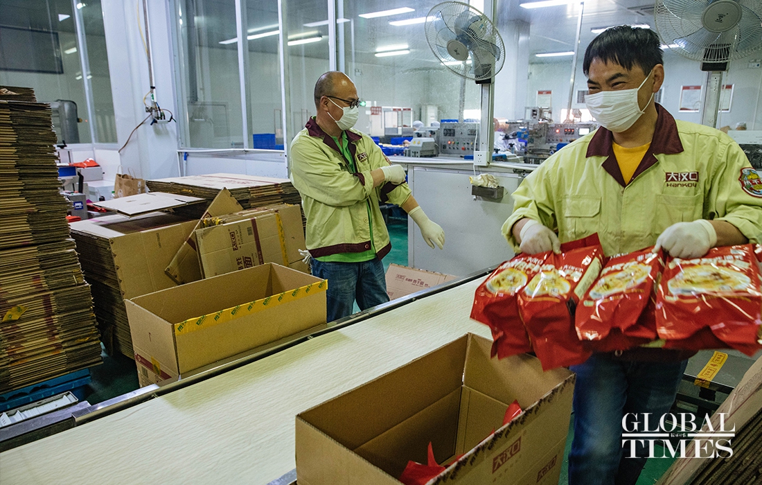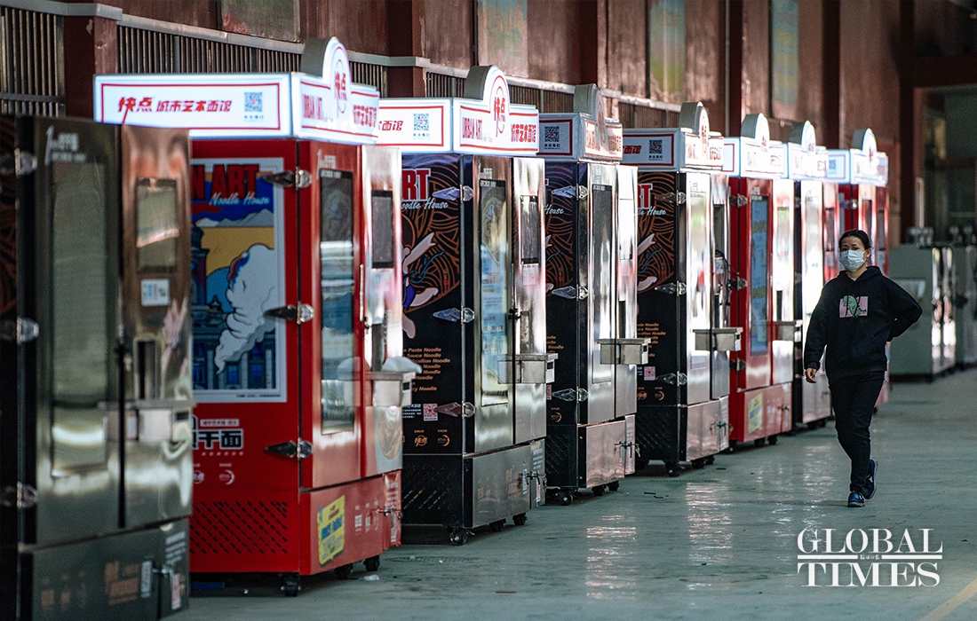 Wuhan Dahankou food, a local hot dry noodle delicacy, has seen orders skyrocketing after the city lifted its coronavirus lockdown. Orders from North American and European markets grew by two-three times. After using the live streaming platform to promote the product, orders in the Chinese mainland surged three times from last year's level. According to the food maker, due to growing orders, the inventories have run out and clients need to wait for eight days before replenishments are shipped. To cut communication barriers, the company has built a vending machine for the hot dry noodles, which will be launched soon. (Photos: Li Hao/GT)