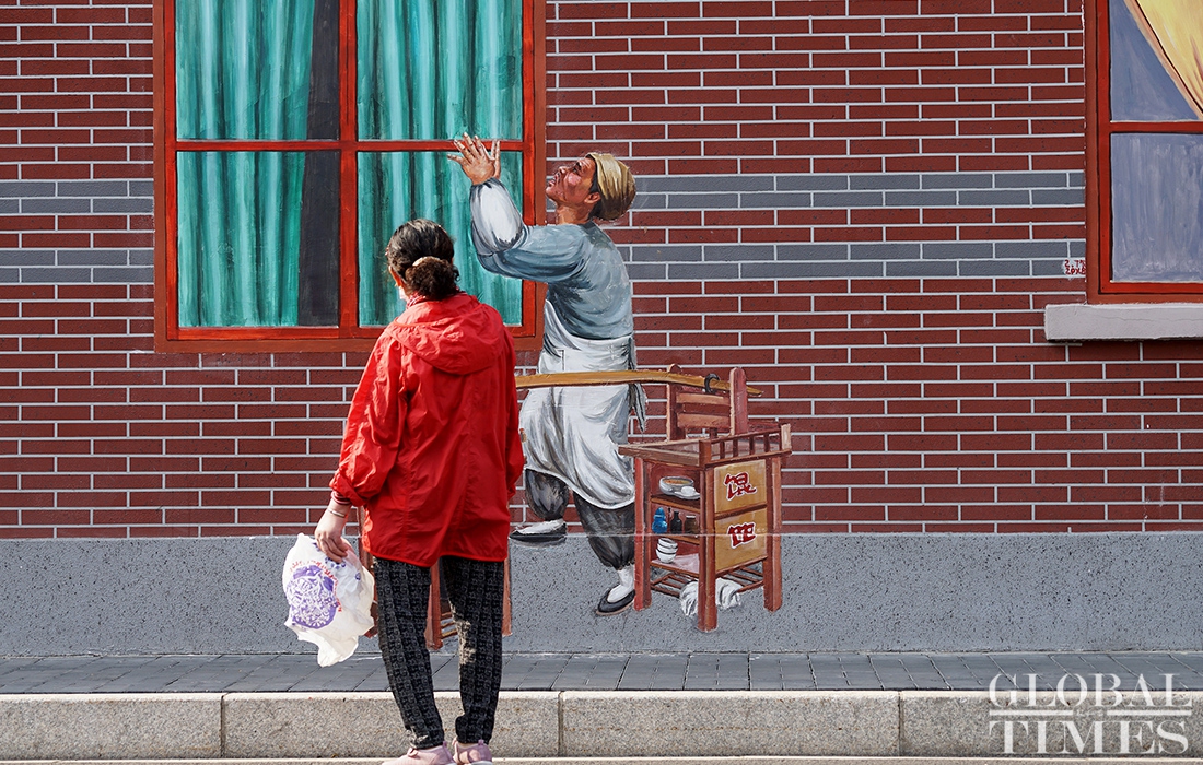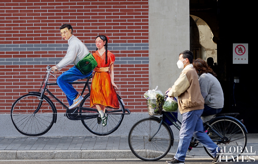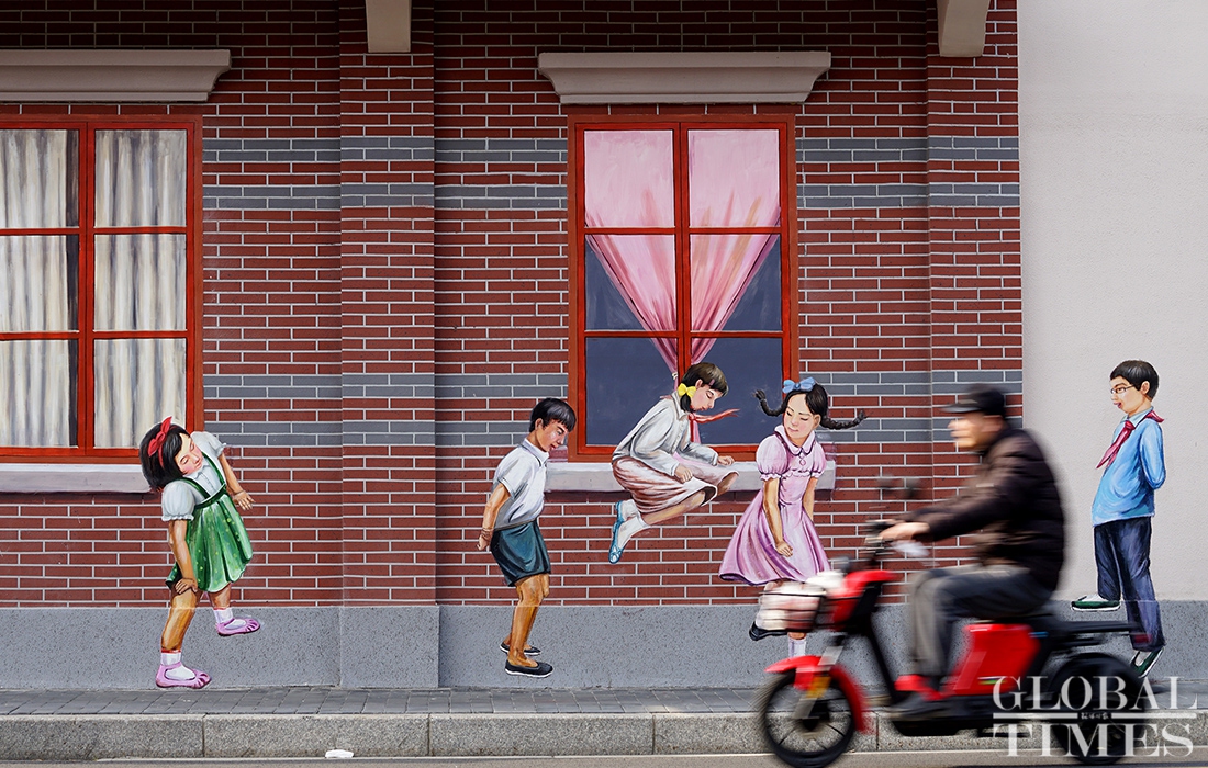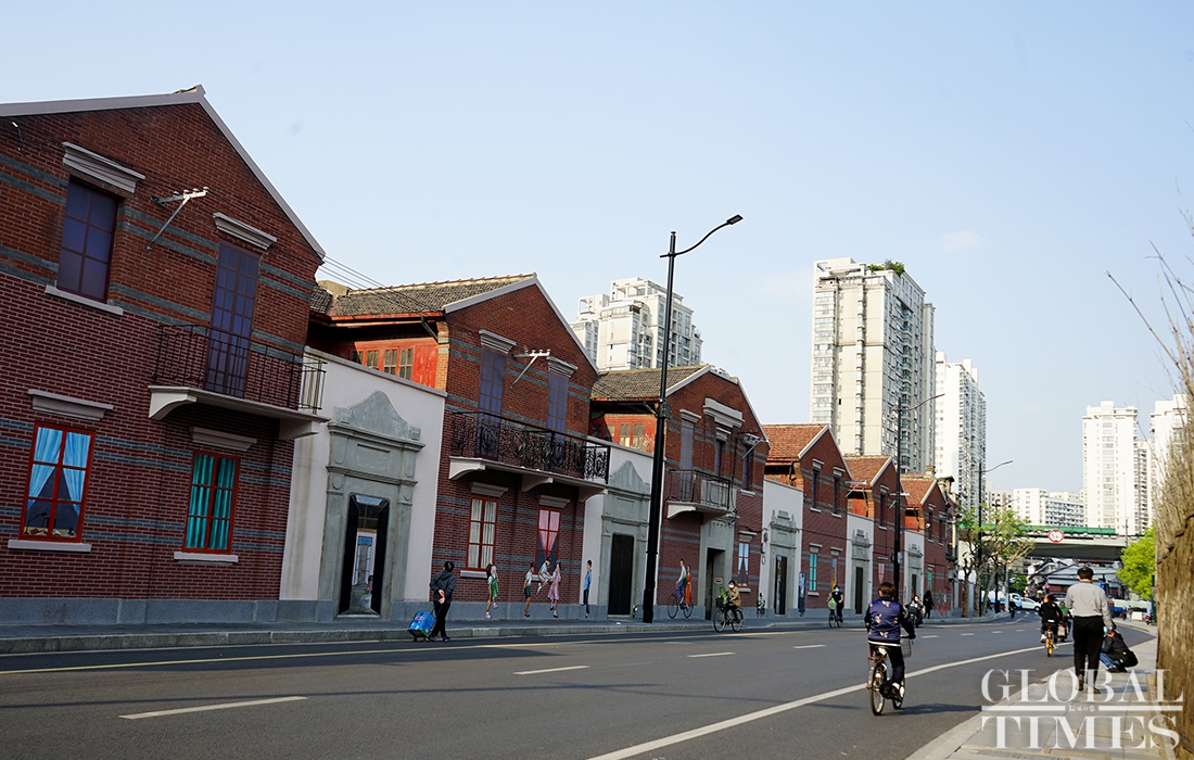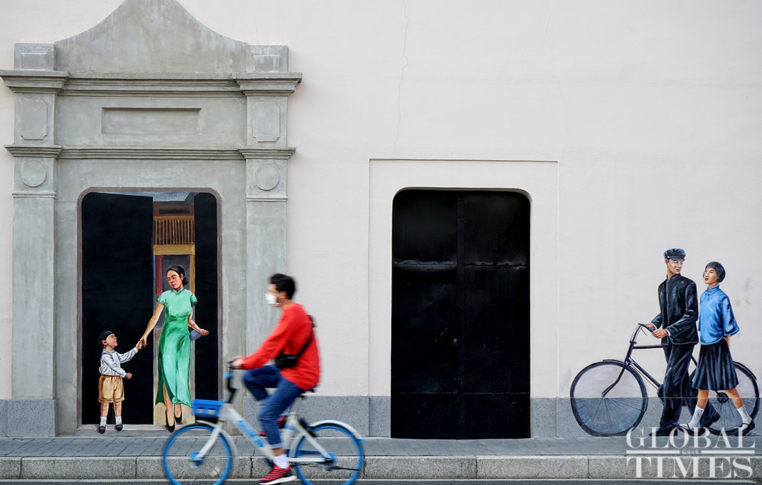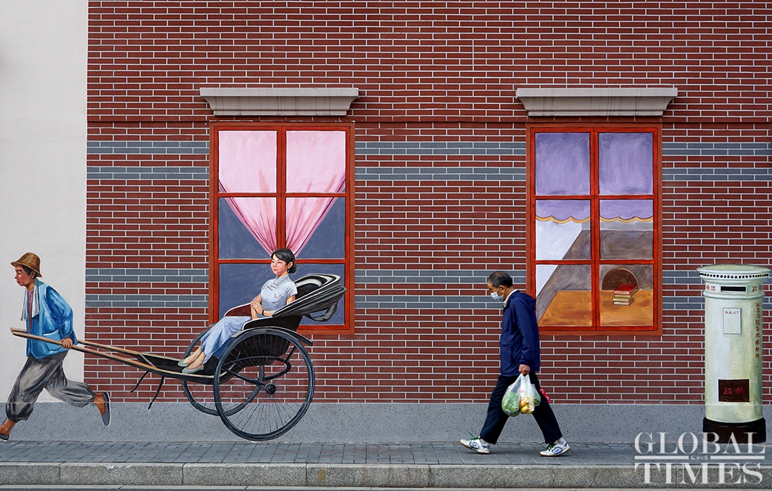 Artists are working on murals on the traditional shikumen buildings along Shanhaiguan road in Shanghai. The nostalgic murals depict different life scenes of the city in the old days.