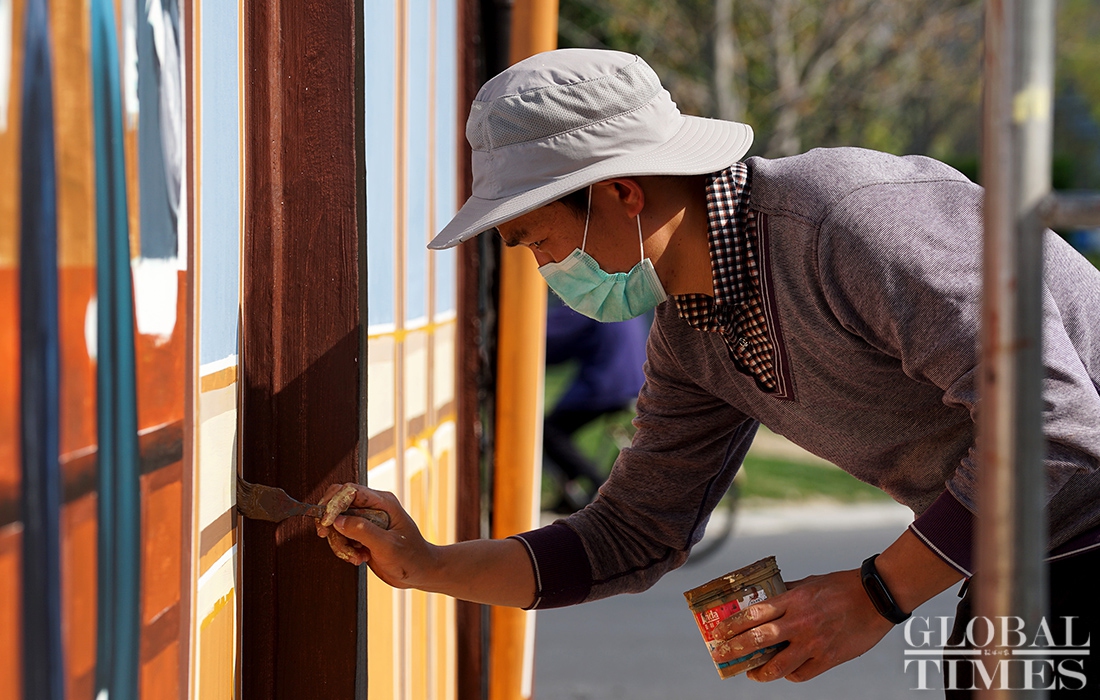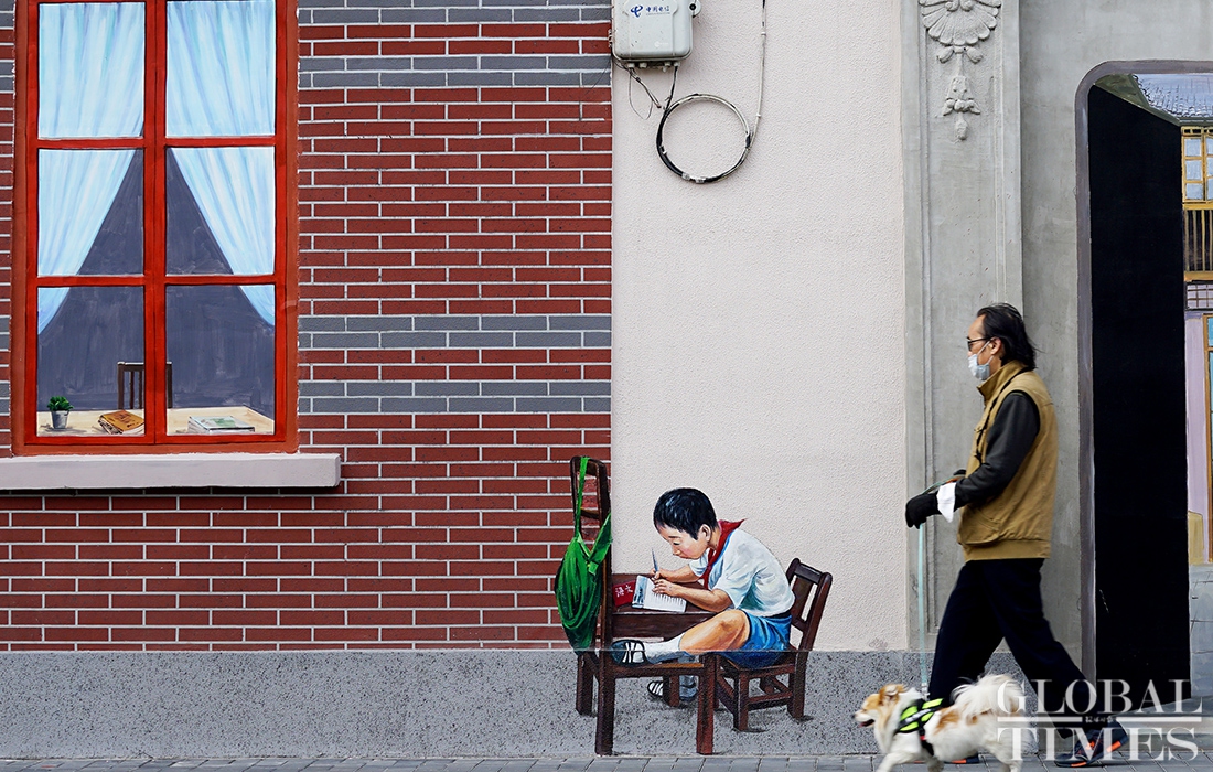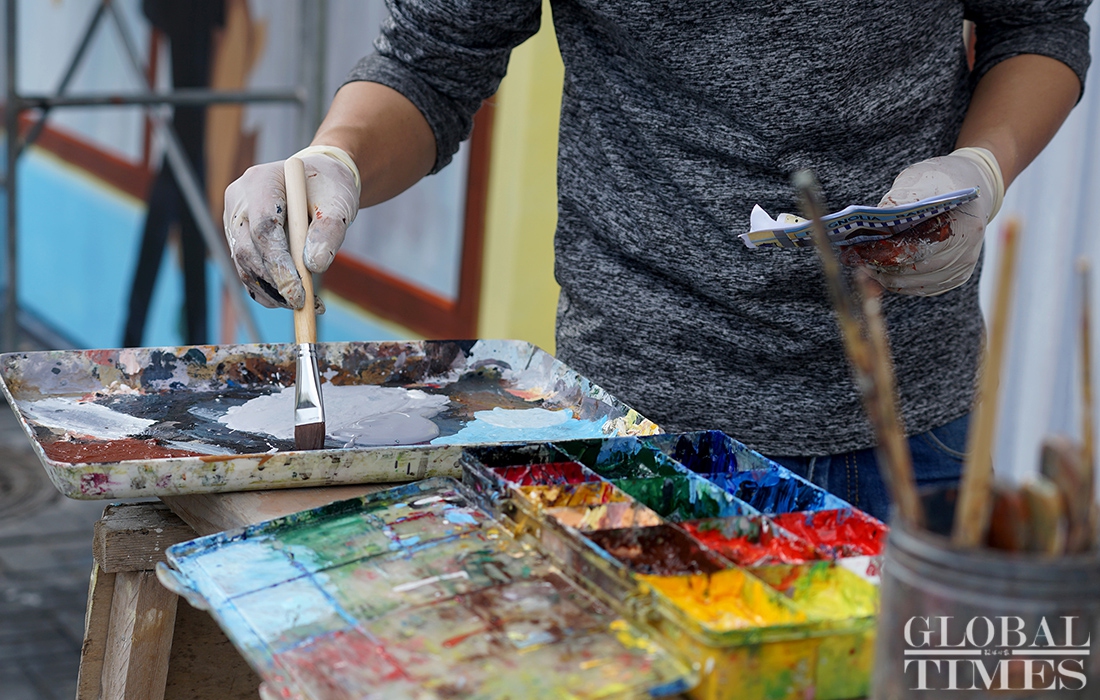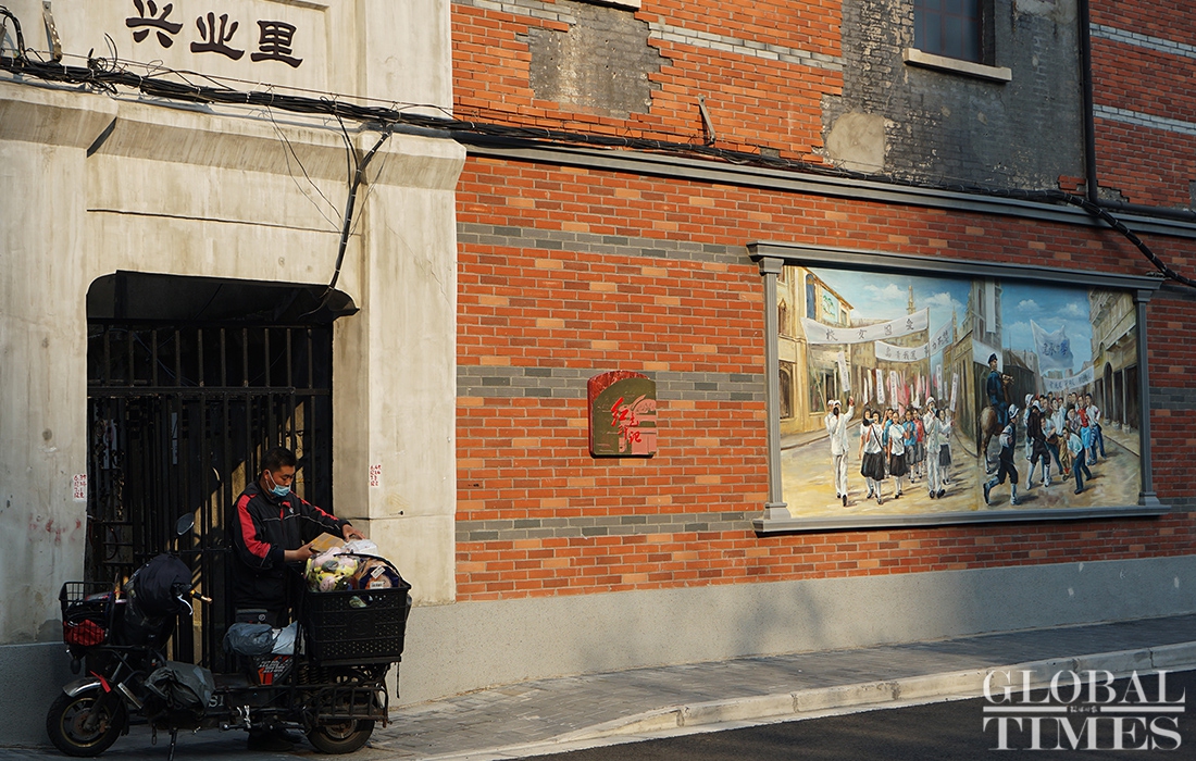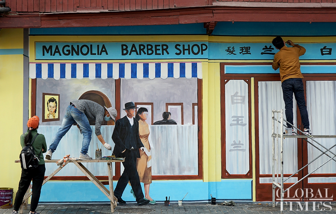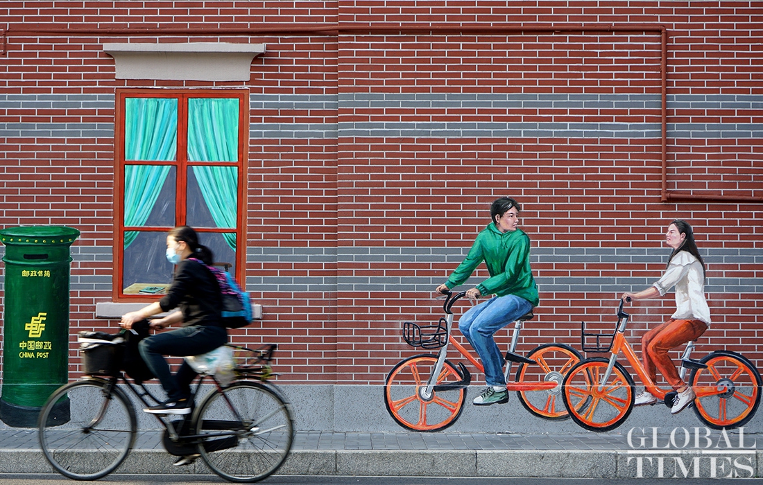 Artists are working on murals on the traditional shikumen buildings along Shanhaiguan road in Shanghai. The nostalgic murals depict different life scenes of the city in the old days.