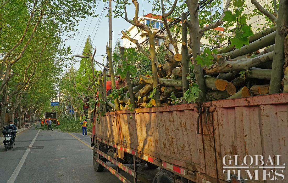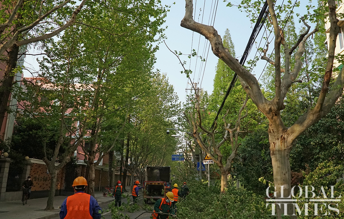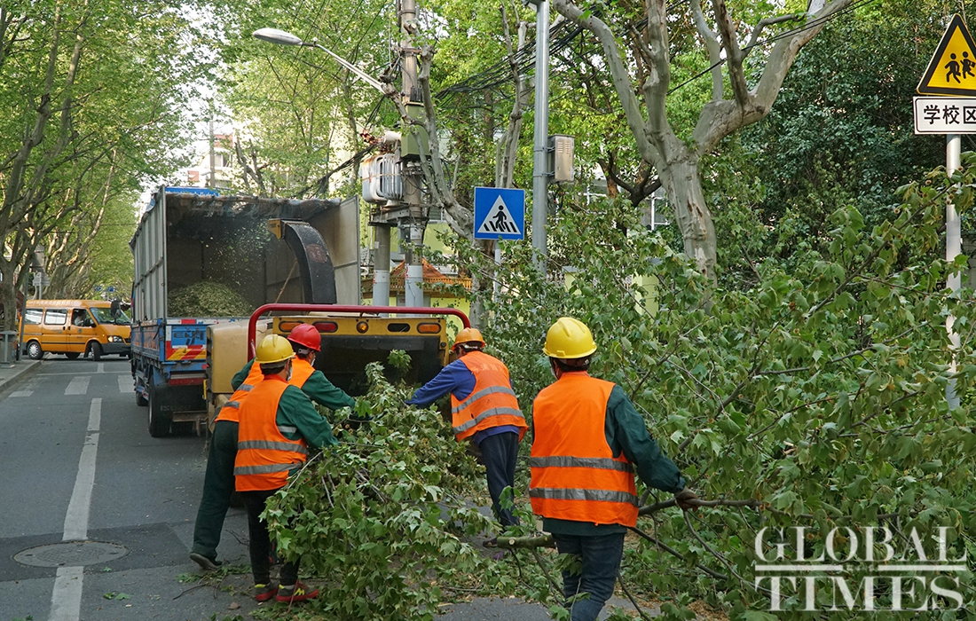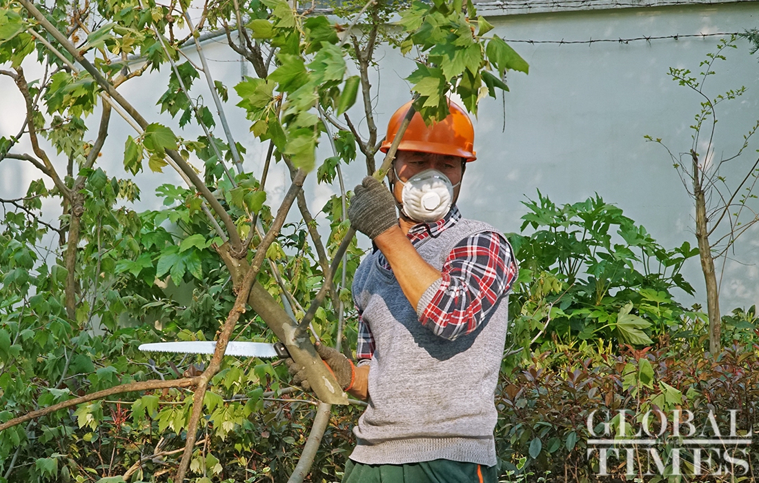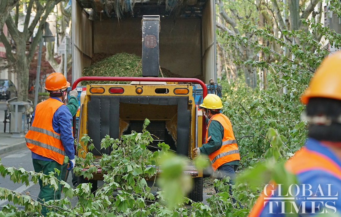 In spring, the green belt and landscape maintenance workers in Shanghai trim redundant leaves and branches of platanus to maintain the beauty and cleanliness of Shanghai's streets.