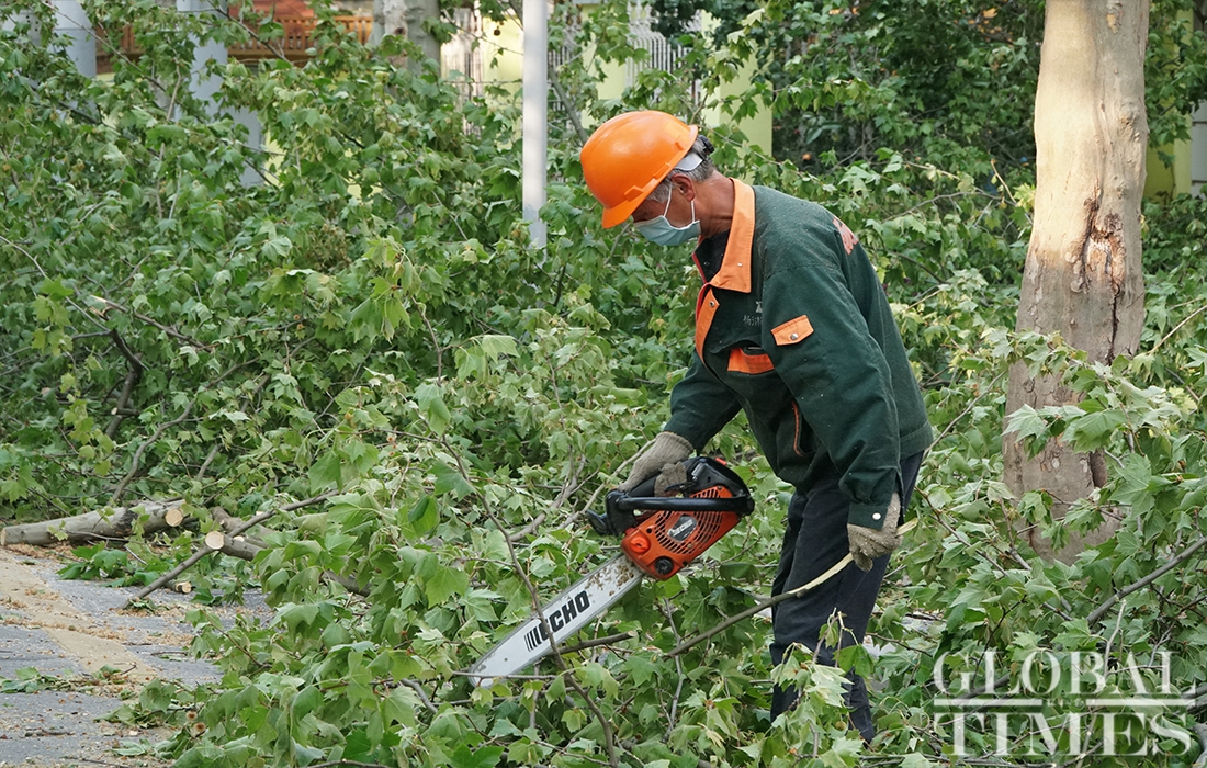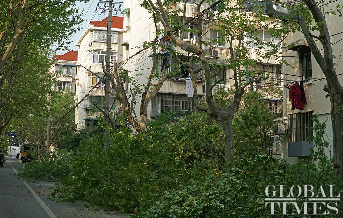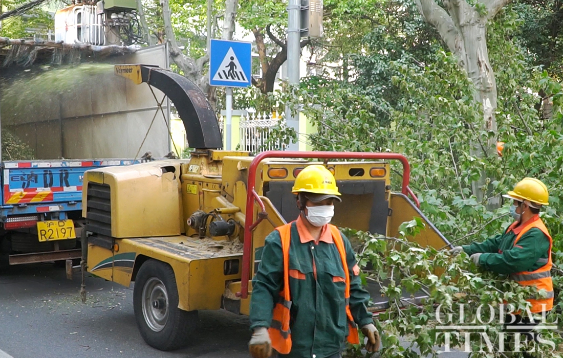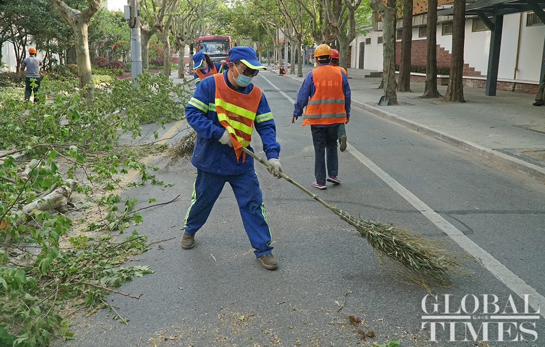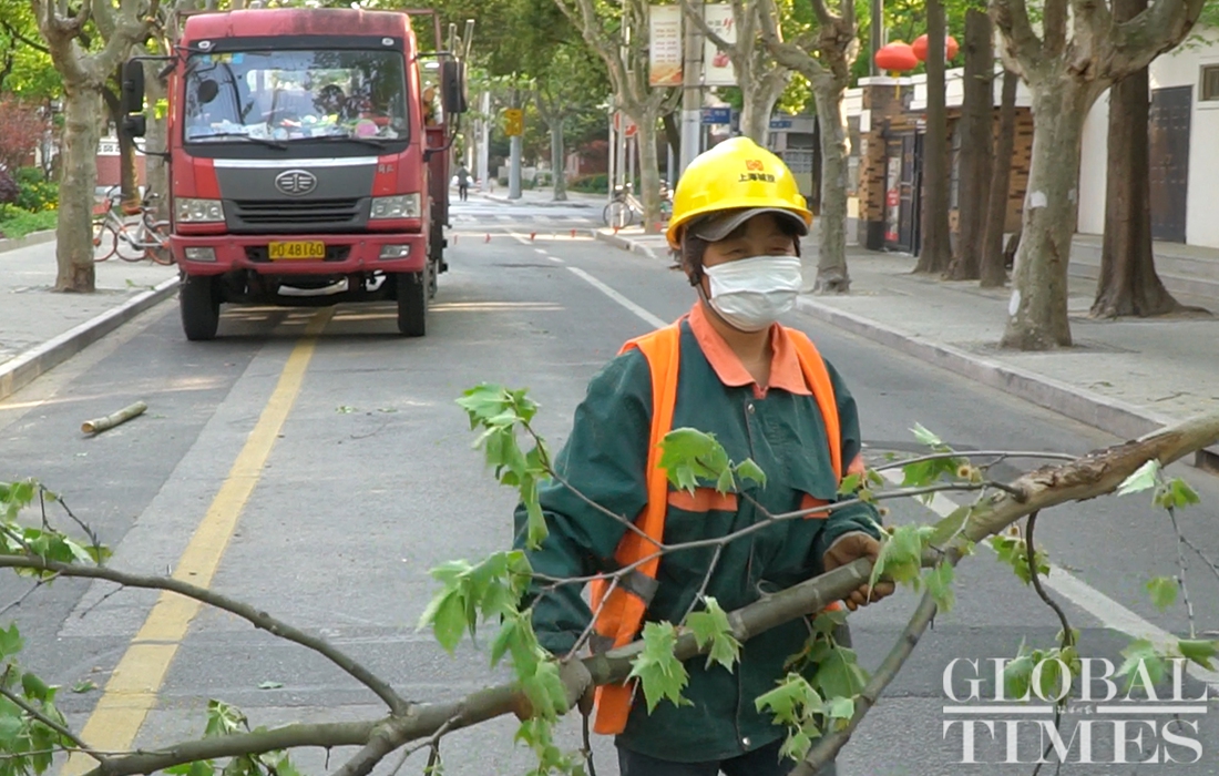 In spring, the green belt and landscape maintenance workers in Shanghai trim redundant leaves and branches of platanus to maintain the beauty and cleanliness of Shanghai's streets.