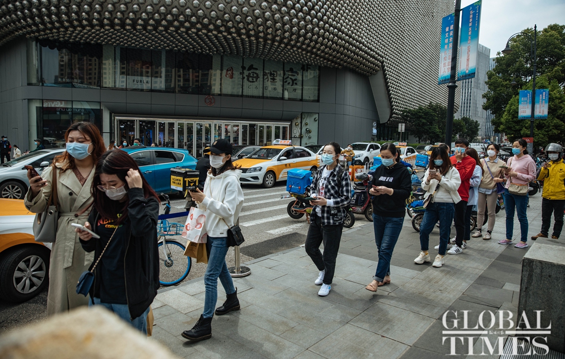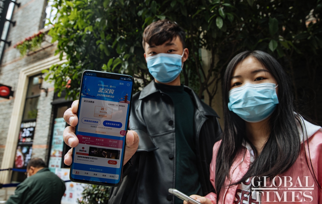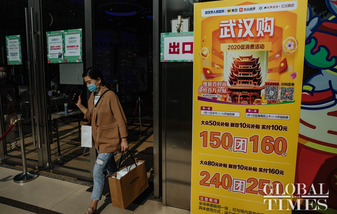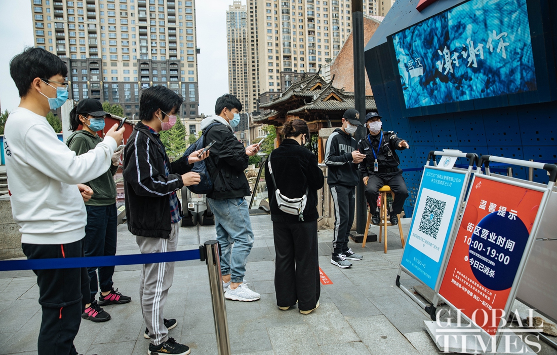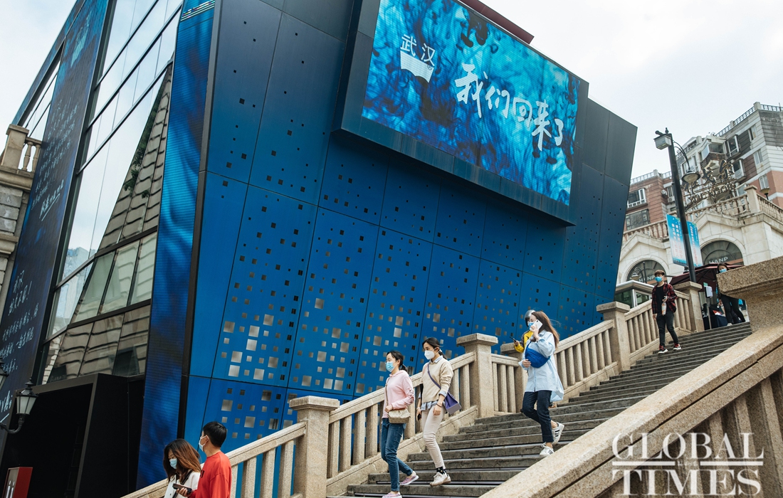 Wuhan residents spent the day shopping outside on Sunday after the city was determined to be a low-risk area for the novel coronavirus (COVID-19). Wuhan has issued $2.3 billion yuan ($325 million) worth of coupons to stimulate consumption. Malls and brands also issued vouchers to attract shoppers. (Photos: Li Hao/GT)