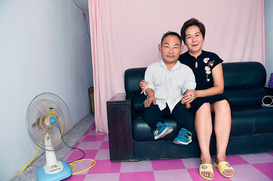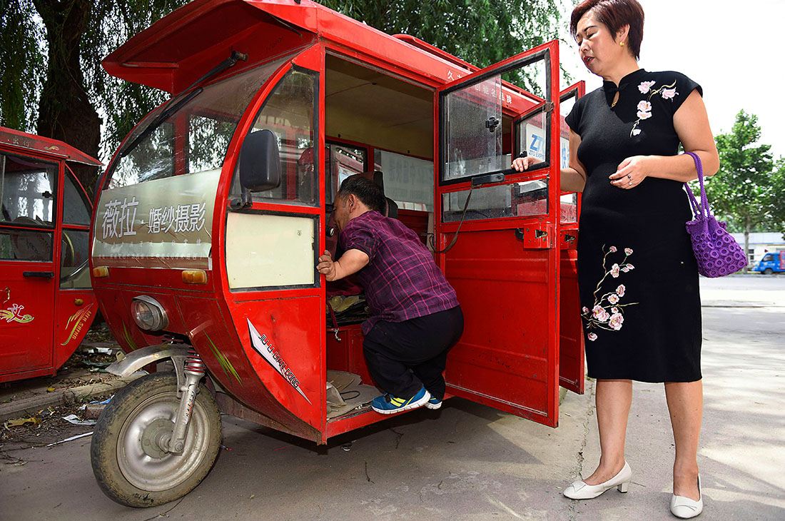 Chen helps her husband into his three-wheeler. The couple met back in 2003 when Chen accidentally sat on Lin in a taxi after failing to notice her diminutive future husband. After this chance meeting, the pair became good friends. Chen had previously felt she would never trust or love another man after suffering through a divorce, but Lin moved her with his sincerity and persistence. figcaption >