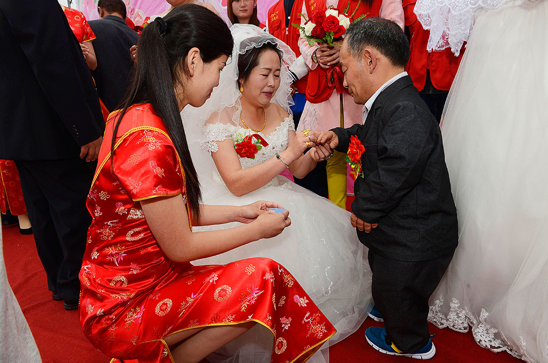 Lin and Chen exchange wedding rings. In 2016, the Disabled Persons’ Federation of Juxian county organized a collective wedding for all of its local disabled couples. In the company of their family and friends, Lin and Chen finally realized their dream of having a wedding, more than 10 years after first tying the knot. figcaption >