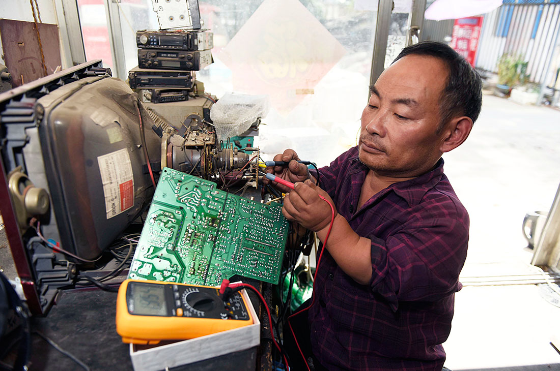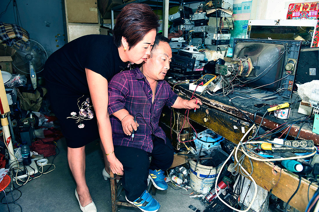 Lin repairs an electrical appliance. Though Lin was born with his condition, he has never let his disability get in the way of his success. After years of hard work, today he owns and runs an electrical appliance repair shop. figcaption >