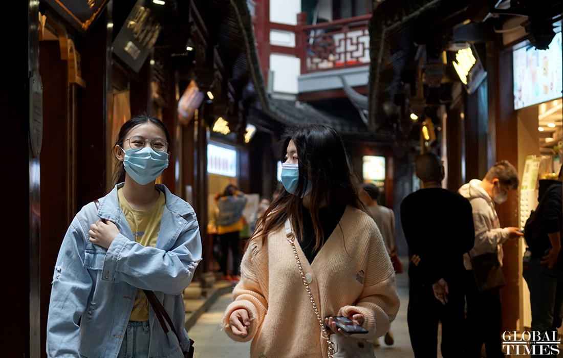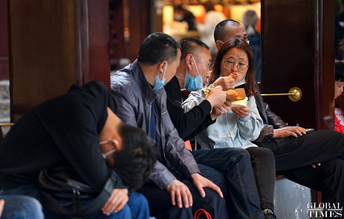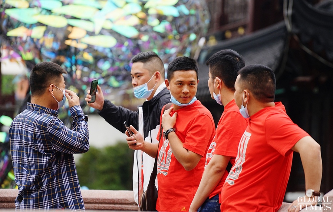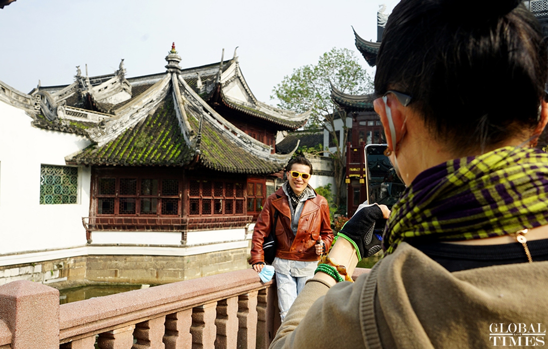Visitors take photos and appreciate the fish in the lake along the bridge in the ancient Yuyuan Garden of Shanghai on Monday. The garden and business in the neighborhood are returning to vitality as COVID19 wanes in the city. (Photos: Chenxia/GT)