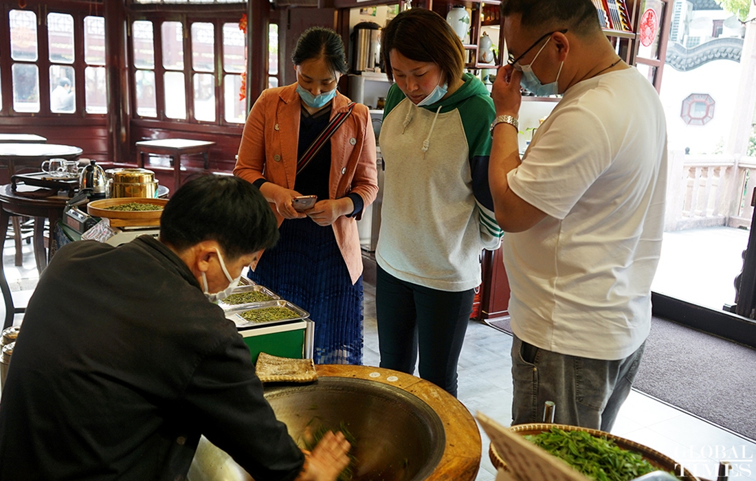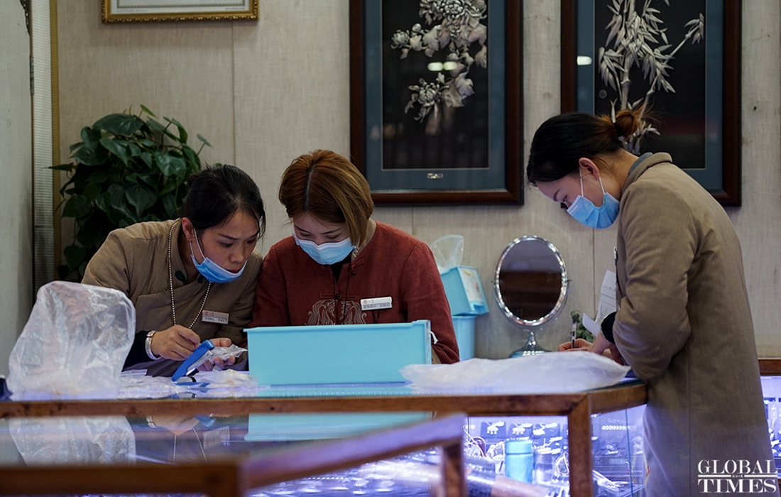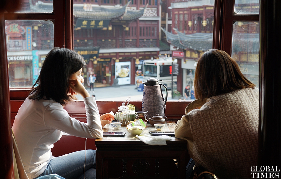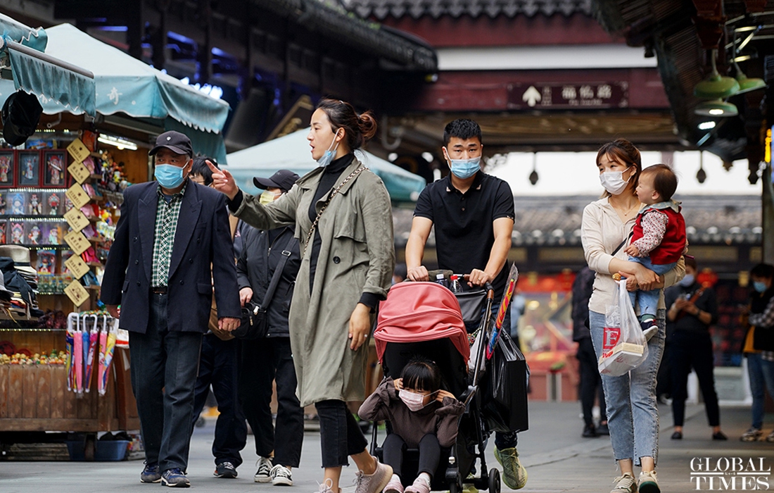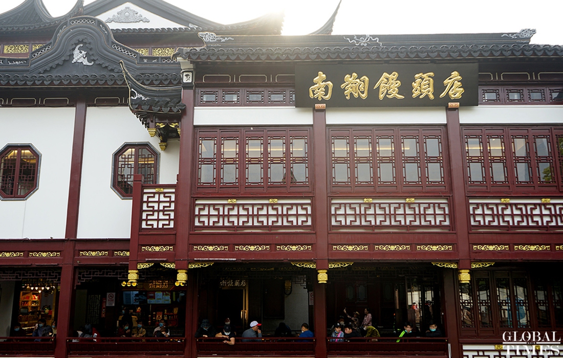 Visitors take photos and appreciate the fish in the lake along the bridge in the ancient Yuyuan Garden of Shanghai on Monday. The garden and business in the neighborhood are returning to vitality as COVID19 wanes in the city. (Photos: Chenxia/GT)