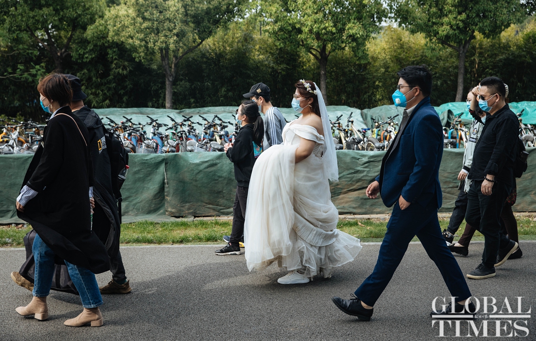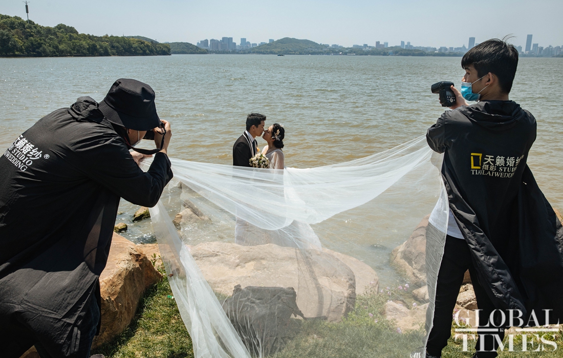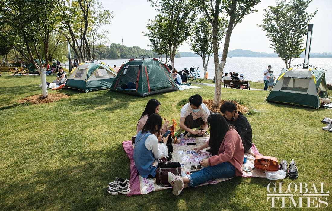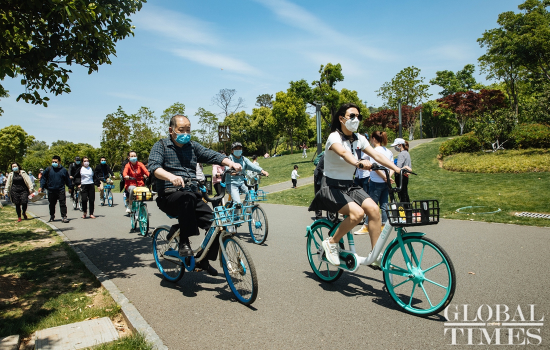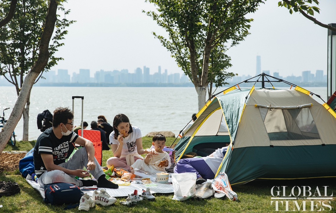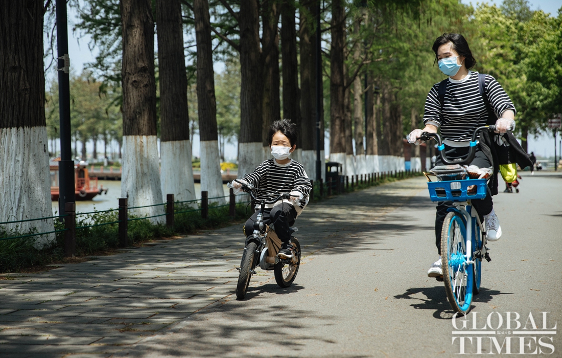 People engage in outdoor activities at Wuhan's East Lake on Saturday. Livelihoods among Wuhan residents have gradually returned to normal after the city was classified as a low-risk area. Wuhan also reported the number of hospitalized COVID-19 patients had dropped to zero as of Sunday.