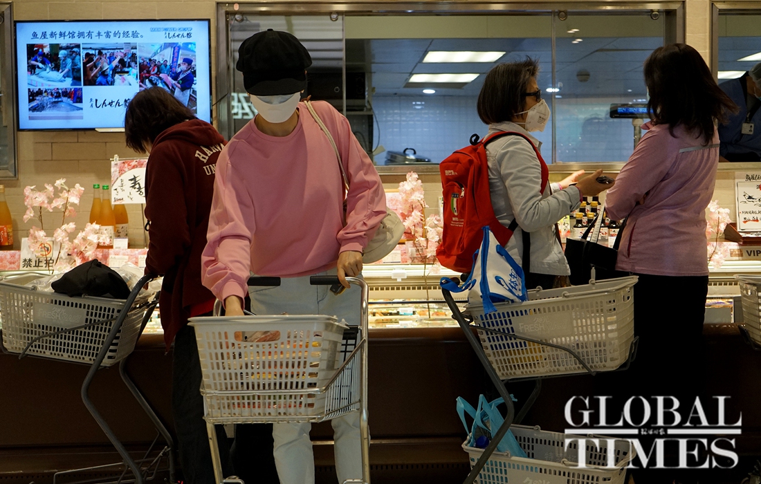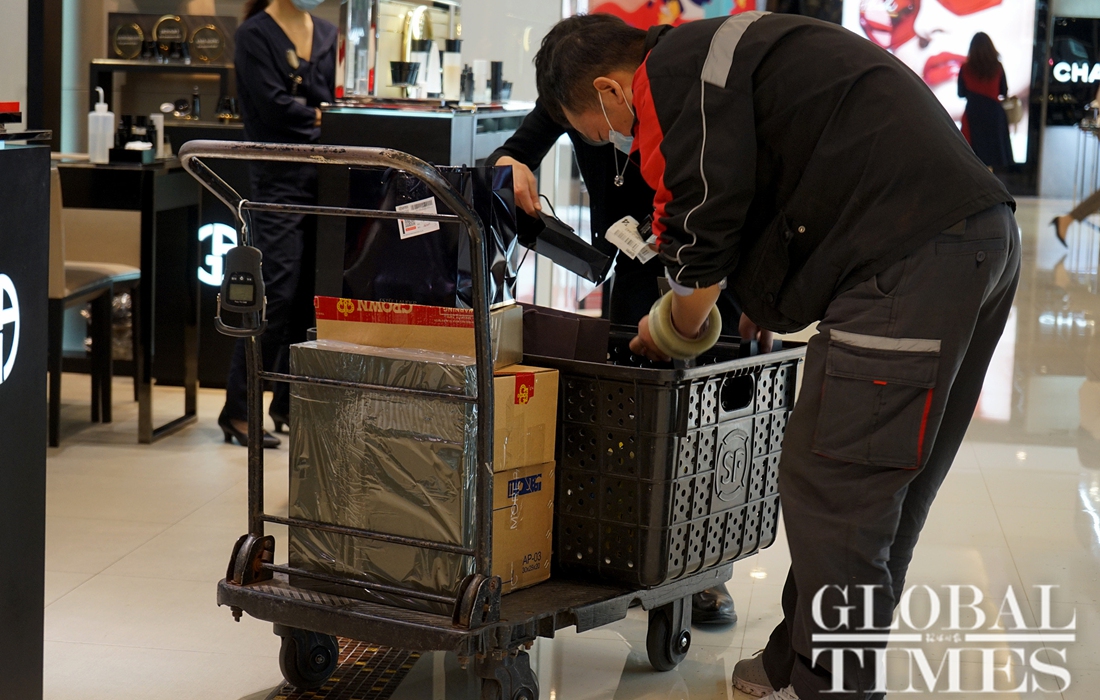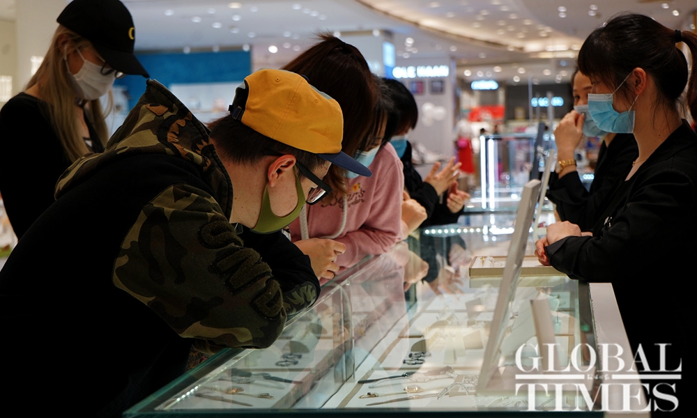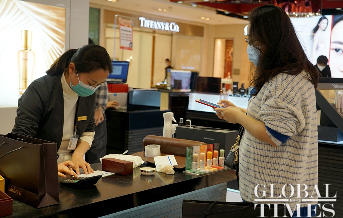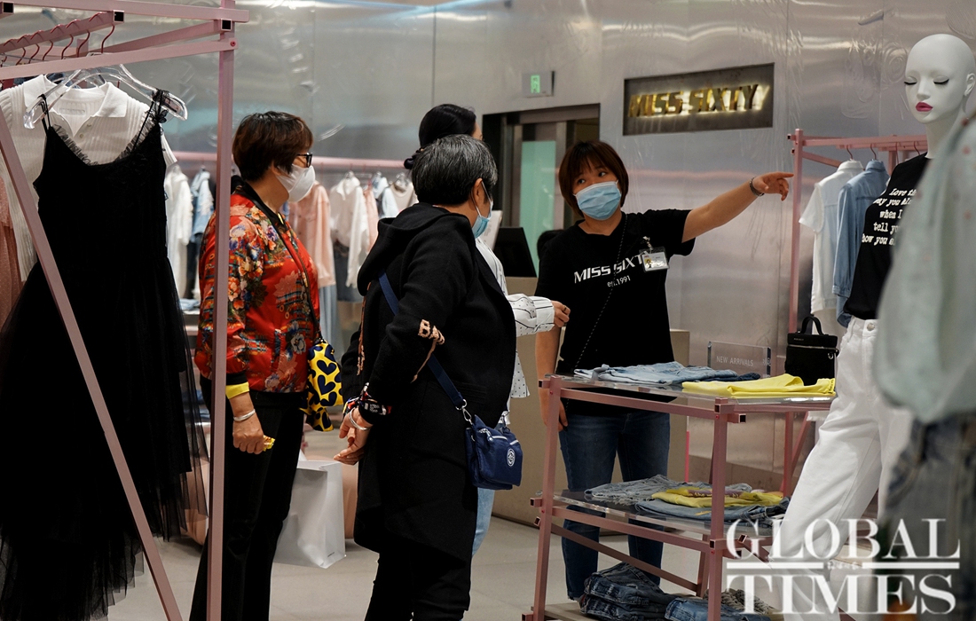Shanghai residents wearing masks hang out at supermarkets and shopping malls in Jing’an district on Tuesday. To boost both online and offline consumption amid COVID-19, the city kicked off a shopping festival recently. Business owners are soliciting customers by giving shopping vouchers and discounts. Livestreaming has been warmly welcomed among them to sell products amid the pandemic.