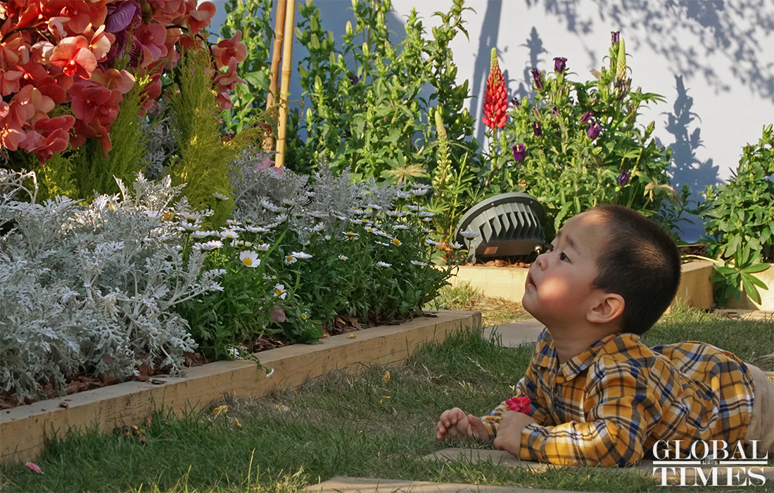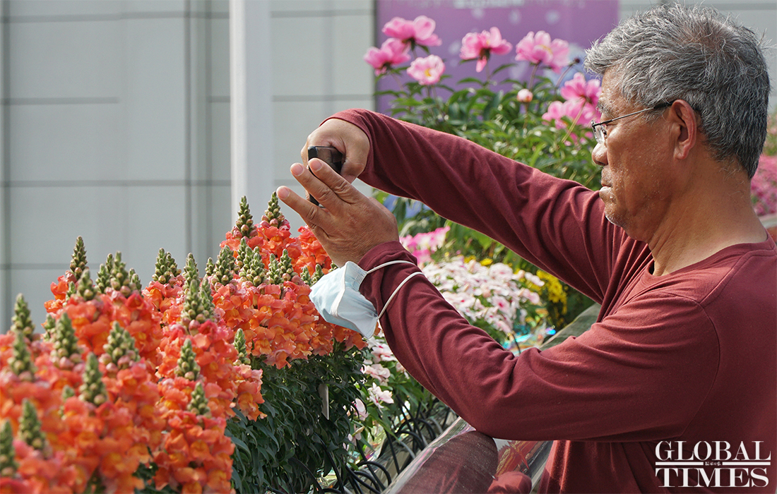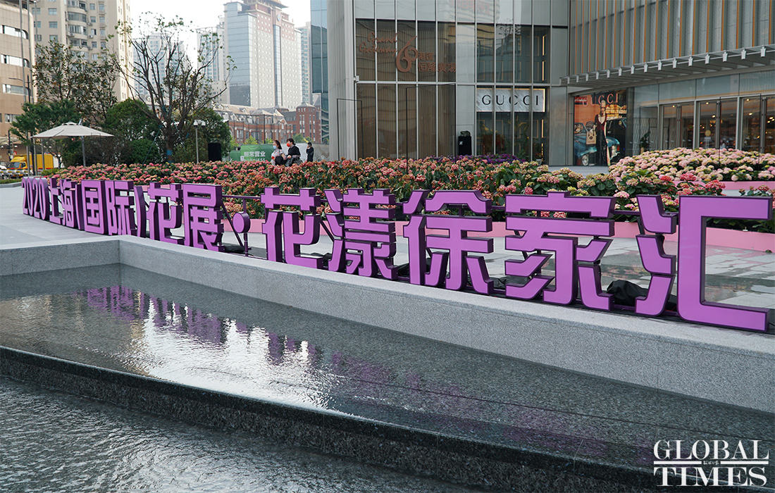 As a venue for the 2020 Shanghai International Flower Show and to welcome the upcoming May Day holiday, flower beds have been installed at Shanghai’s Xujiahui business district. The flower beds occupy 300 square meters and attracted many tourists on April 30, 2020. Photos: Lu Ting/GT