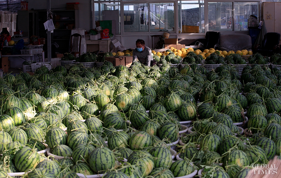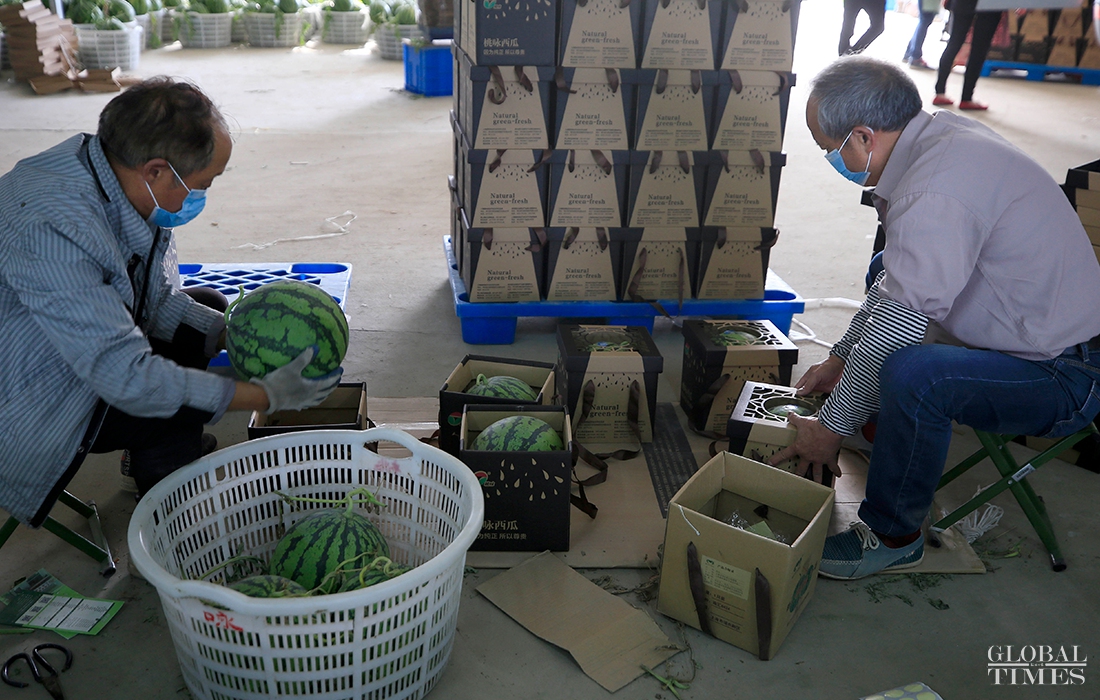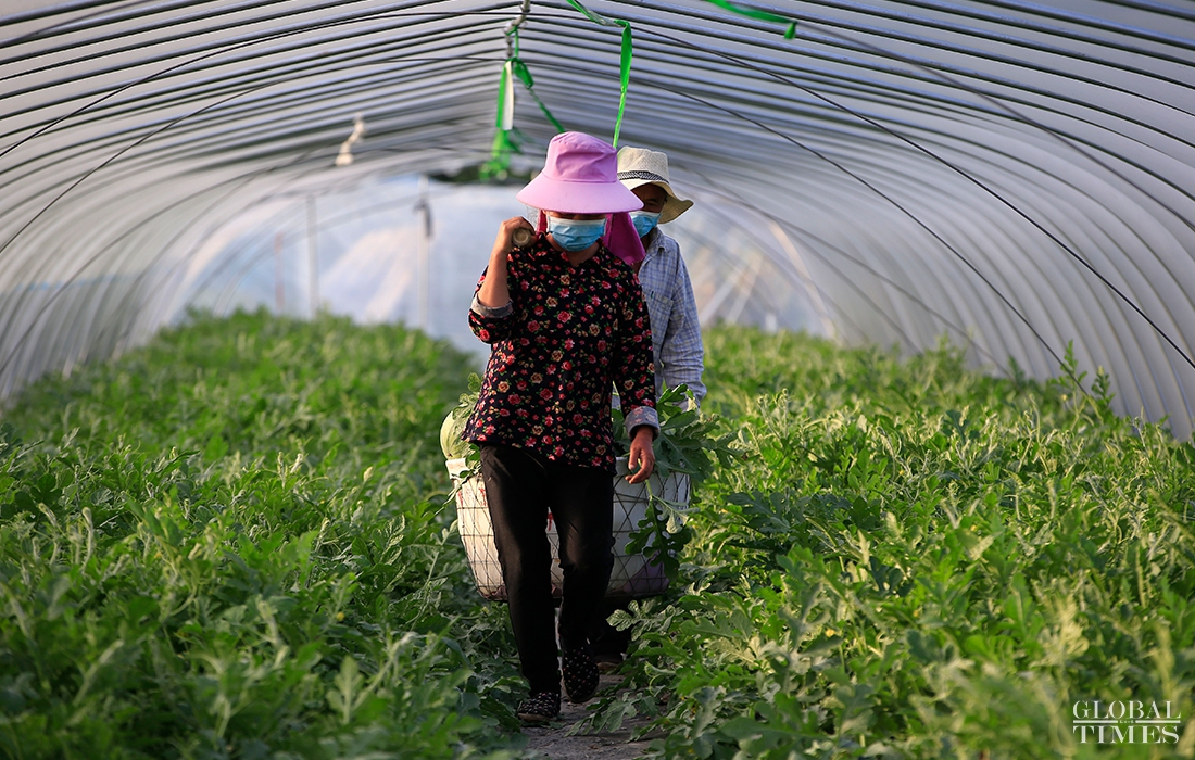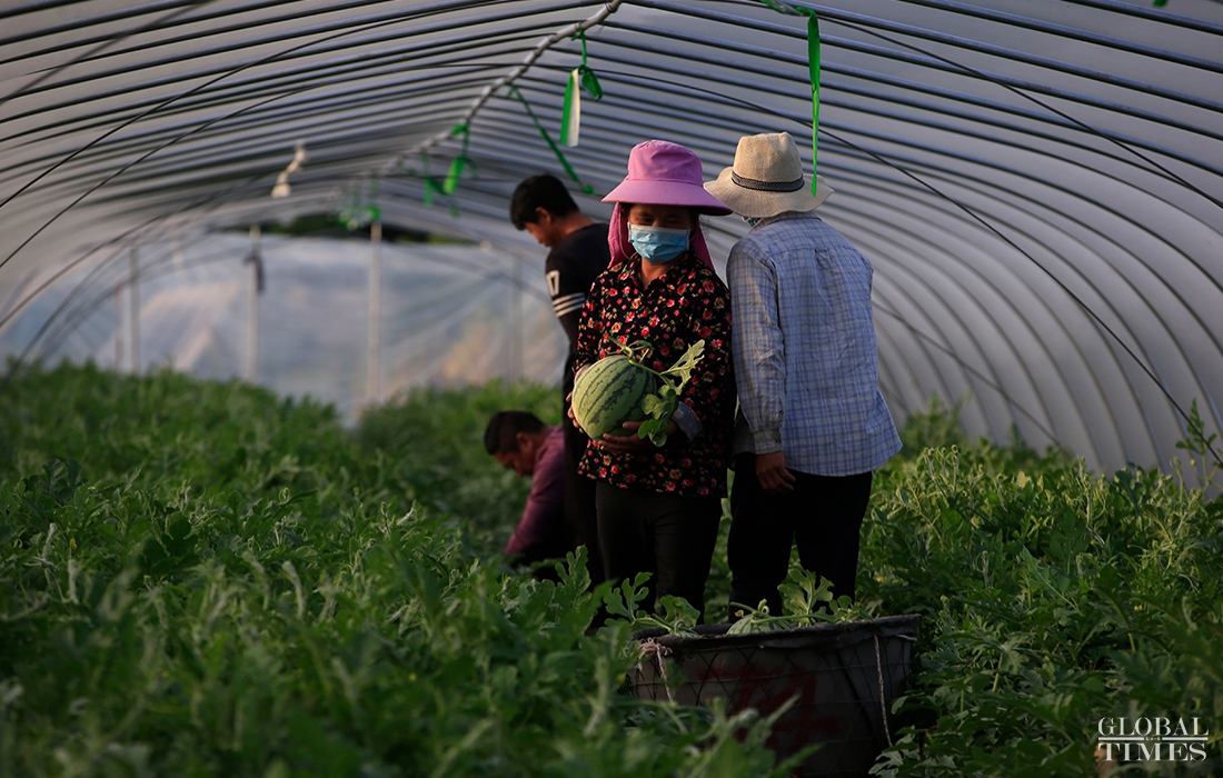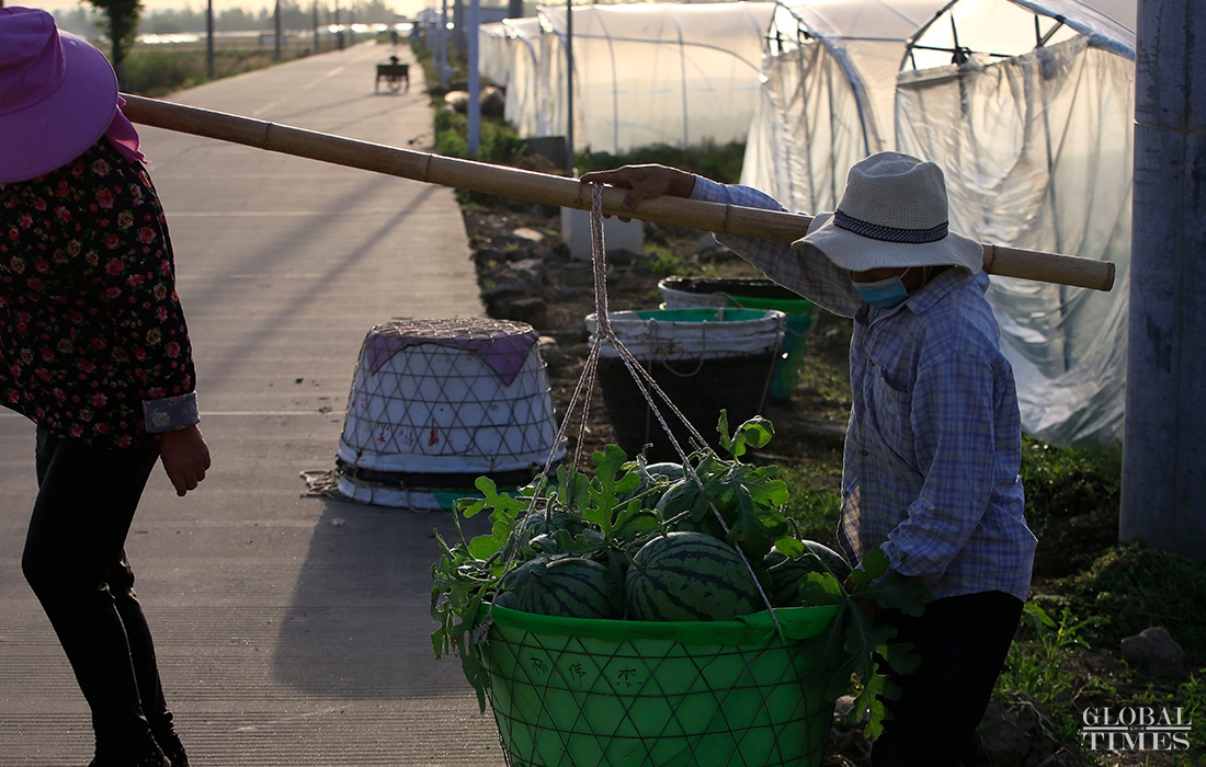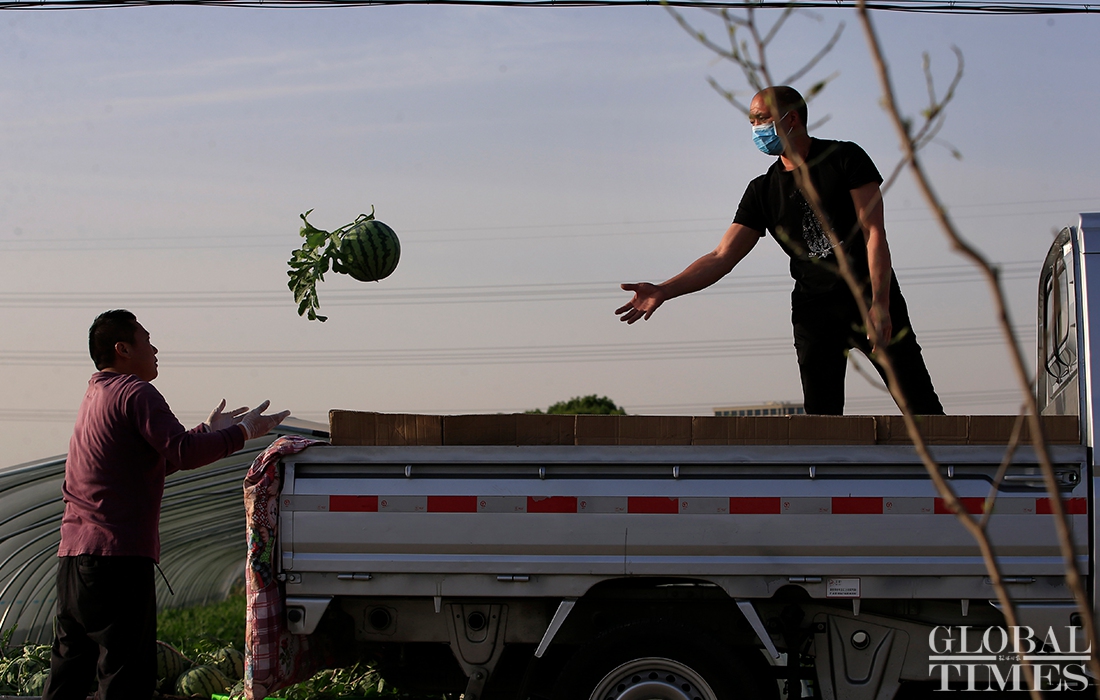 On the outskirts of Xinchang Town in Shanghai, watermelon growers pick freshly ripe watermelons in the morning hours. In the wake of the coronavirus epidemic, several watermelon farmers are unable to work normally. Labor shortages led to an increased income, and watermelon prices rose slightly. However, sales of watermelons are almost the same as last year.