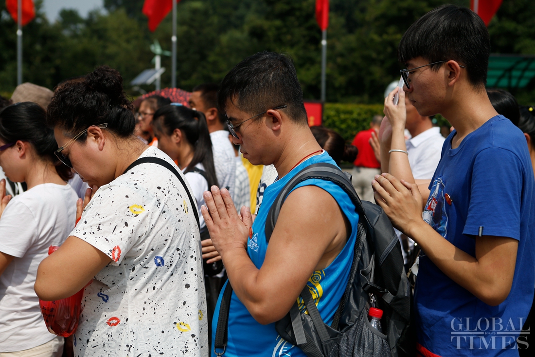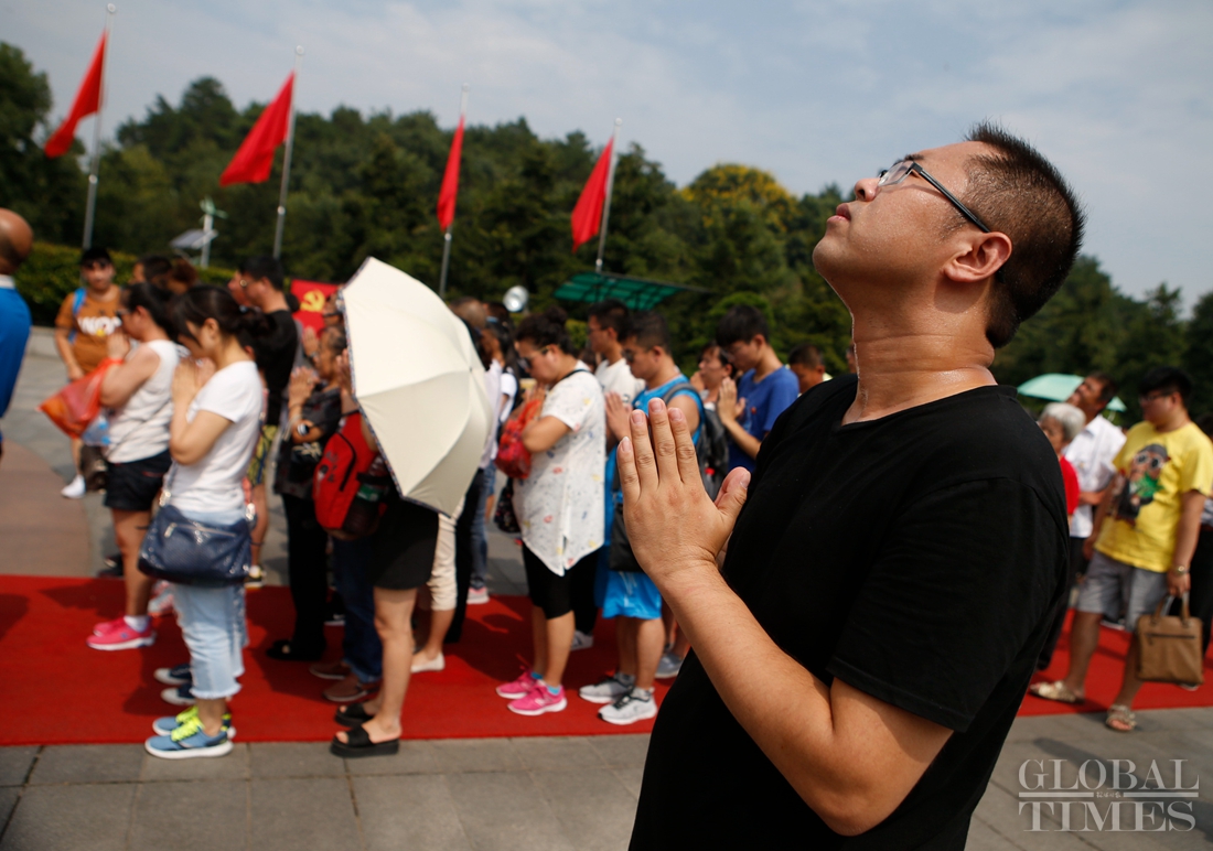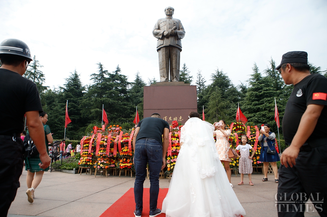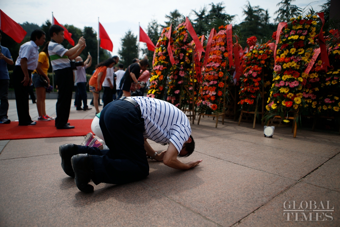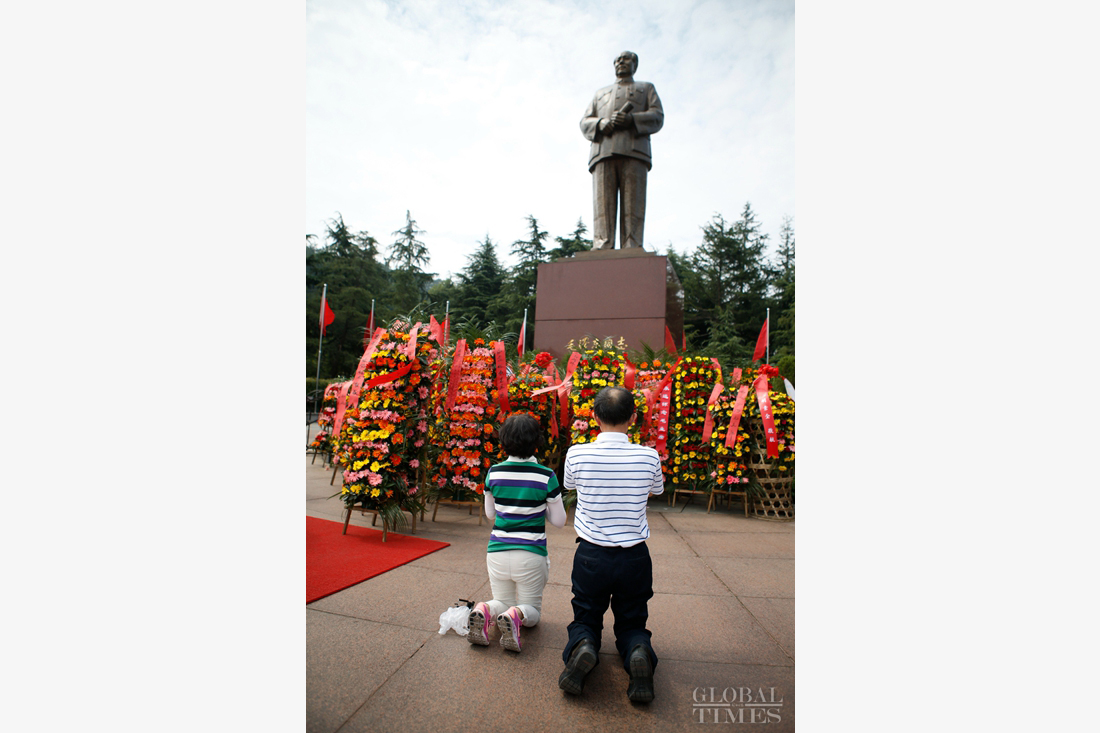 Two visitors kneel as they show their respects to Mao Zedong at the Mao Zedong Bronze Statue Square in Shaoshan, Hunan Province on September 8. The flower baskets in front of the statue are laid in commemoration of the great leader. Shaoshan is the hometown of Mao Zedong, and with the 40th anniversary of Mao's death falling on September 9, the town has seen a huge influx of domestic tourists. Photo: Li Hao/GT
