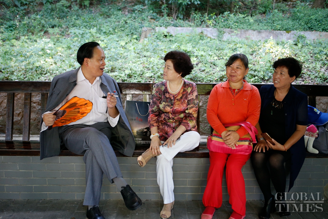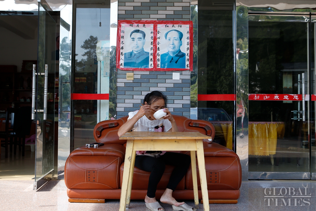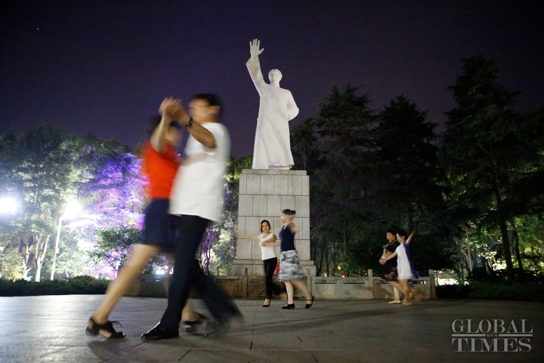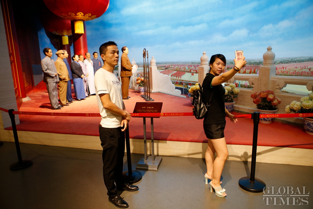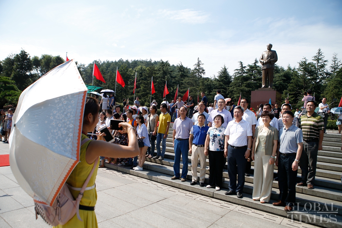 Two visitors kneel as they show their respects to Mao Zedong at the Mao Zedong Bronze Statue Square in Shaoshan, Hunan Province on September 8. The flower baskets in front of the statue are laid in commemoration of the great leader. Shaoshan is the hometown of Mao Zedong, and with the 40th anniversary of Mao's death falling on September 9, the town has seen a huge influx of domestic tourists. Photo: Li Hao/GT
