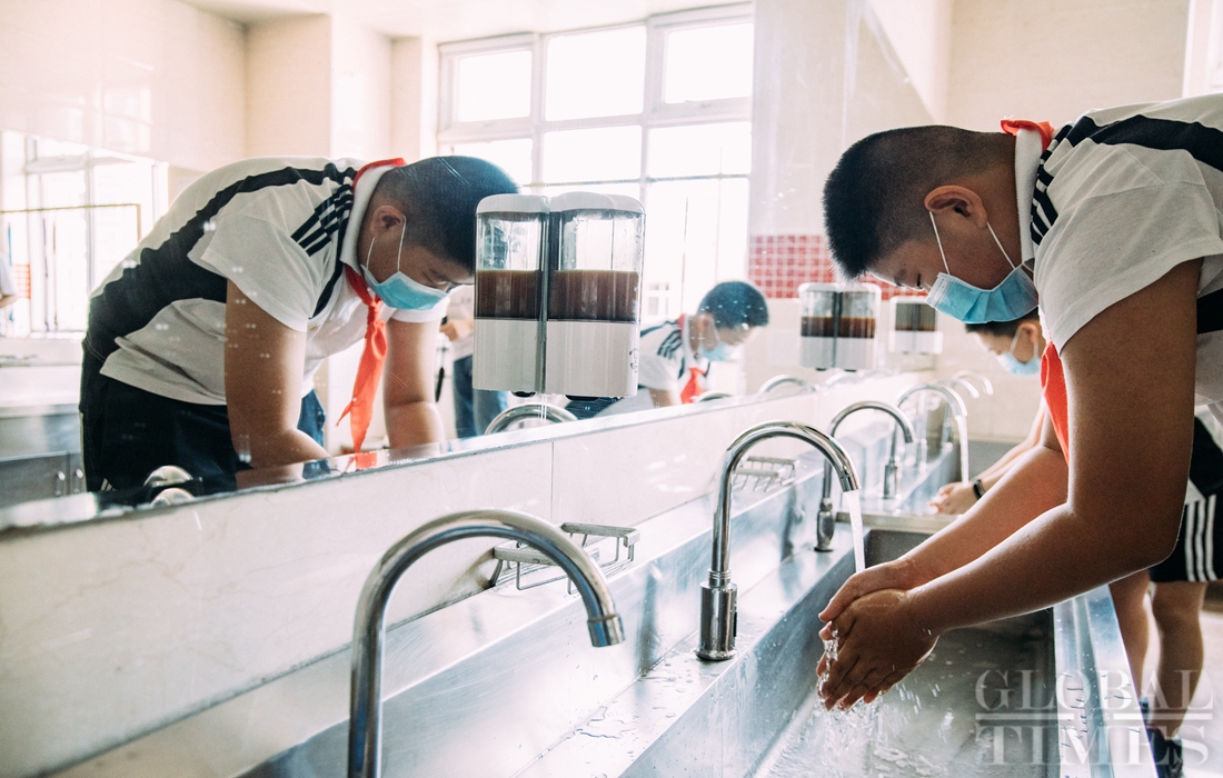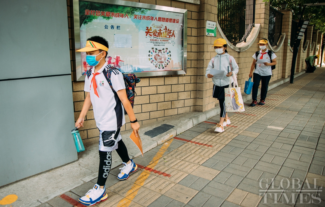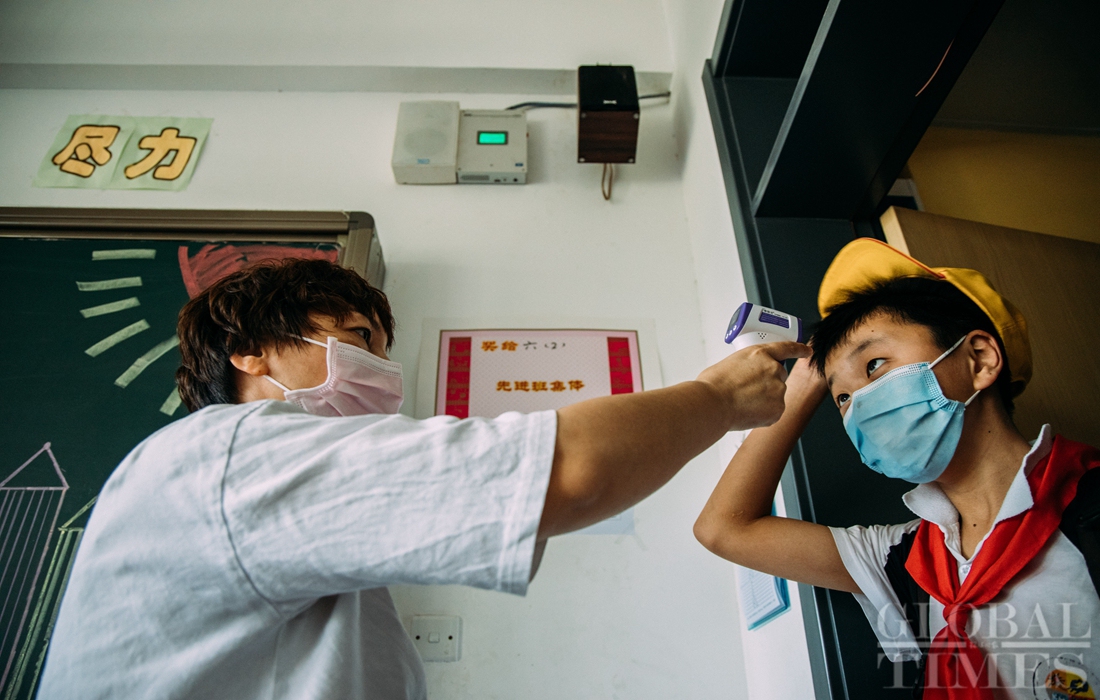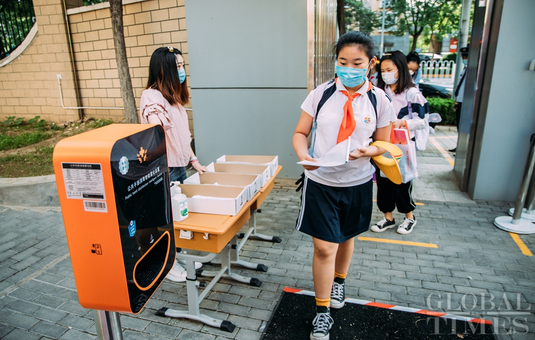 The first batch of students of Shijingshan Foreign Language Experimental Primary School in western Beijing returned to school on Monday, the Children’s Day. As classes restart, students must adhere to strict COVID-19 prevention and control codes, including temperature screening and social distancing. Facial recognition technology is also used to monitor students entering campus. Photos: Li Hao/GT