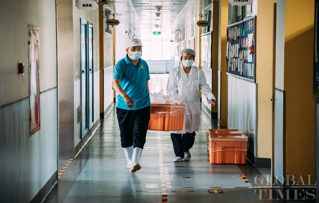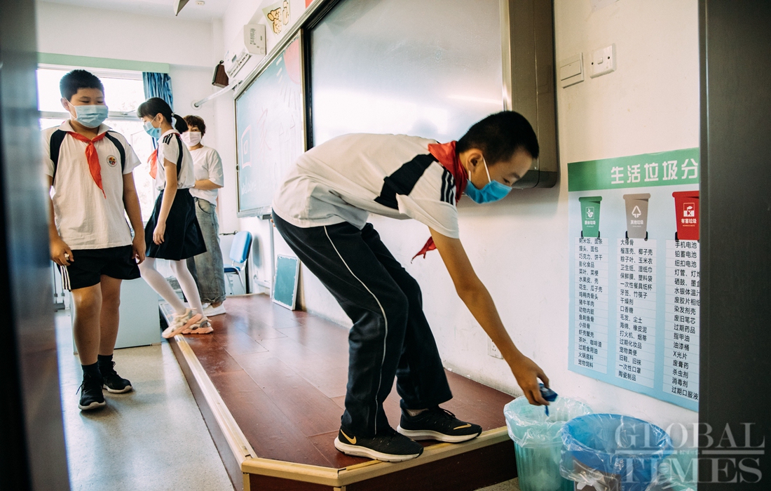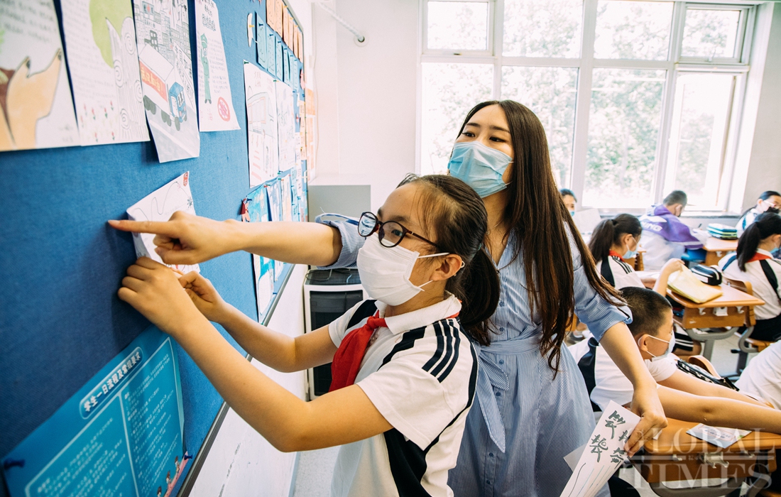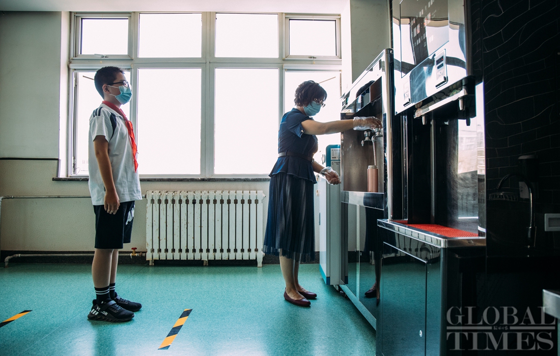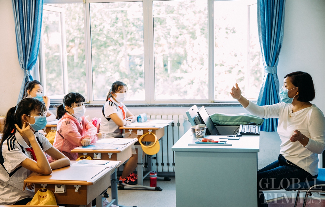 The first batch of students of Shijingshan Foreign Language Experimental Primary School in western Beijing returned to school on Monday, the Children’s Day. As classes restart, students must adhere to strict COVID-19 prevention and control codes, including temperature screening and social distancing. Facial recognition technology is also used to monitor students entering campus. Photos: Li Hao/GT