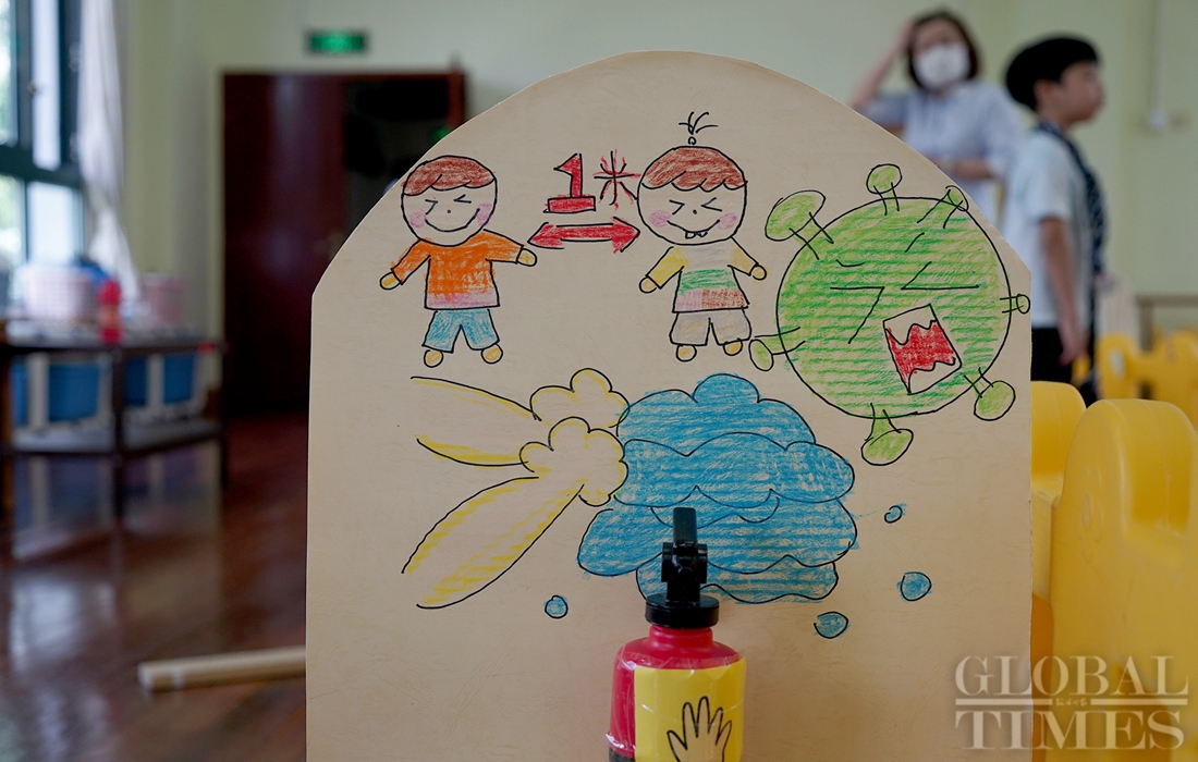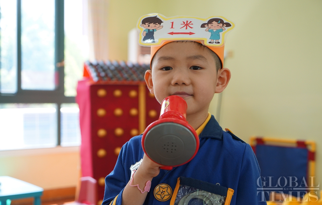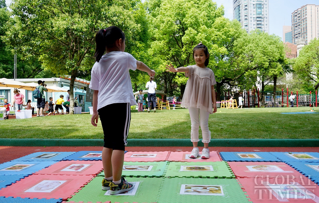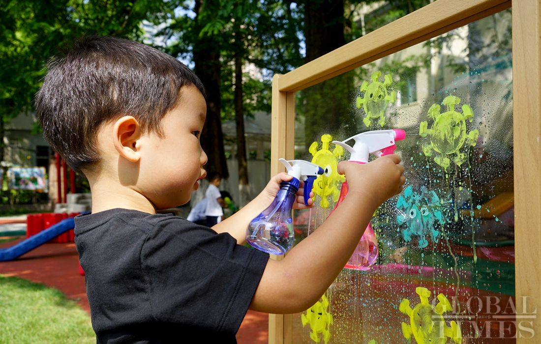 Nearly 2,000 kindergartens and nurseries in Shanghai reopened Tuesday. At the China Welfare Institute Nursery, where about 380 children aged from 2 to 6 have gone back to the campus, the children invented some interesting games in which they fight COVID-19. Students from the first to third grades in the city also returned to campus, following those who returned starting from April 27. Photos: Chen Xia