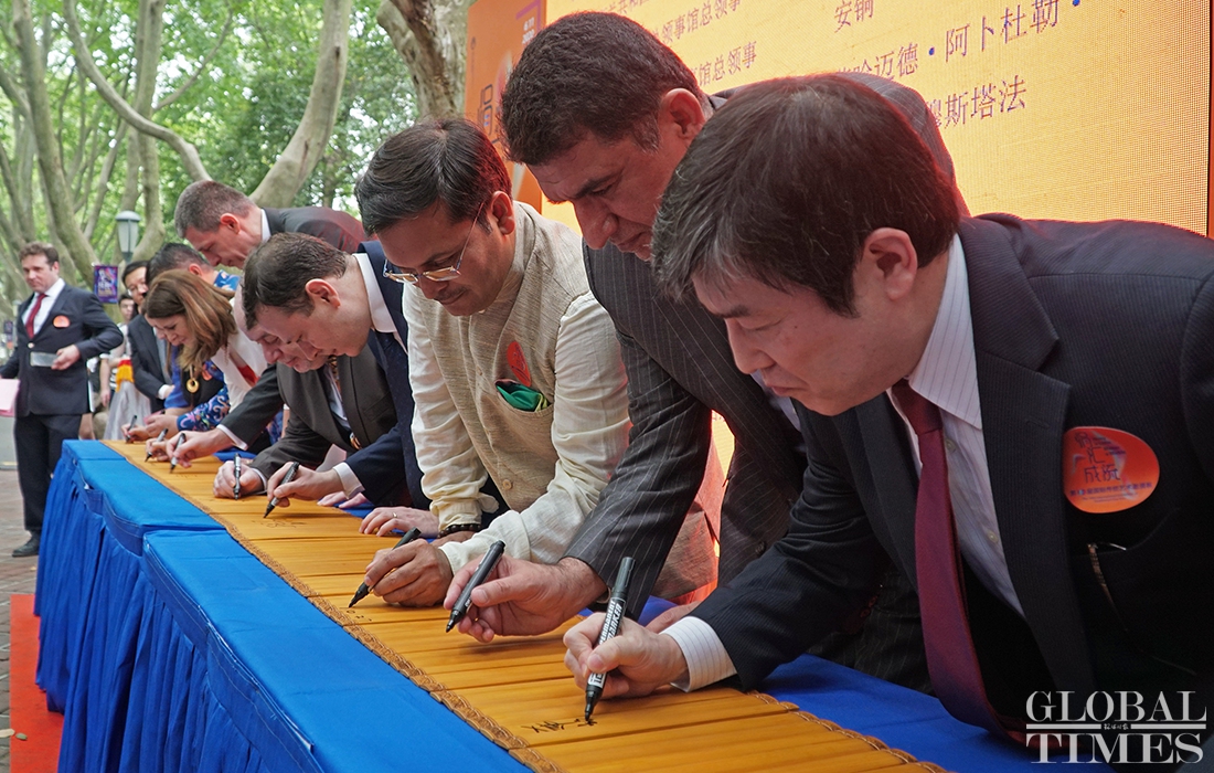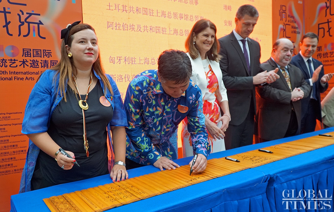 On Thursday, artists and inheritors of intangible cultural heritage from 22 countries and regions, including Japan, the US, Italy, and Tunisia gathered in Shanghai to discuss the protection of traditional culture. The month-long International Exhibition of Traditional Fine Arts, themed “Many a Little Makes a Mickle”, kicked off on the same day. Photos: Lu Ting/GT
