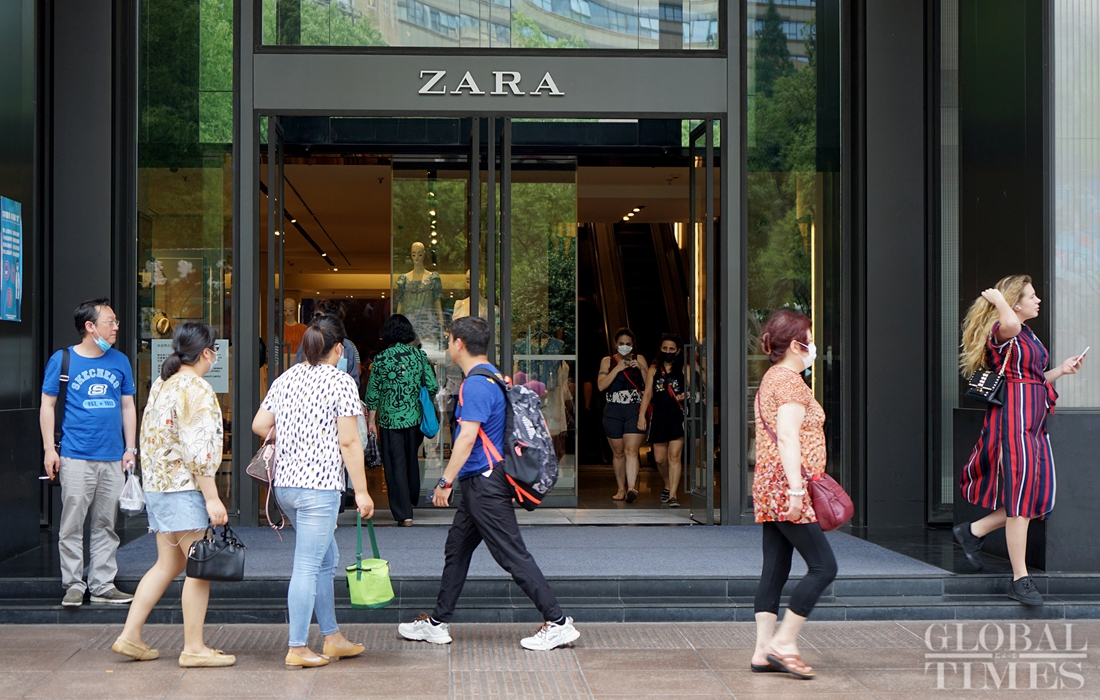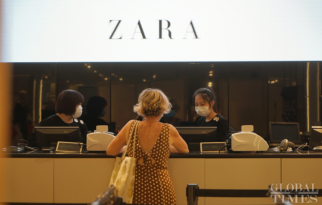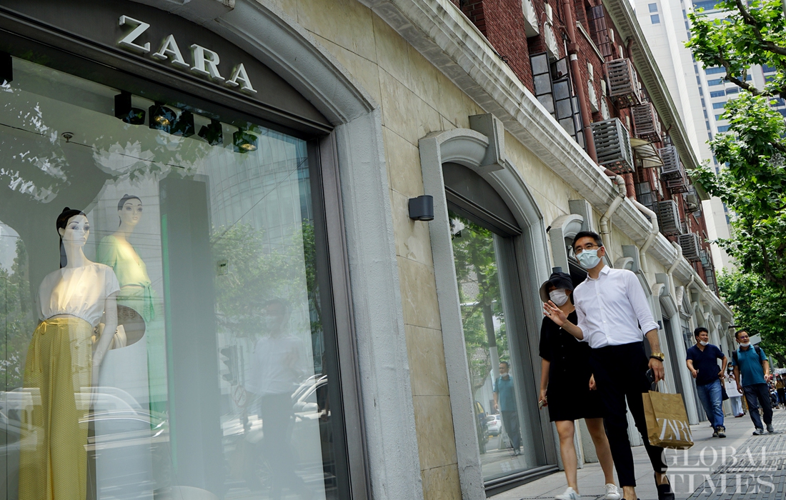 Customers select items in two Zara stores in Shanghai Friday. The Galicia-based Inditex plans to close about 1,200 stores worldwide within two years, accounting for 13 to 16 percent of all its stores. Multiple brands of the group, including Zara, Massimo Dutti and Pull & Bear, will be affected. Inditex suffered a net loss of 409 million euro ($463 million) in Q1 amid the coronavirus, reports said.