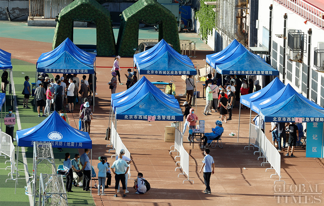 Thousands of people who have visited the Xinfadi Market are being tested for the coronavirus at the Guang’an sports center in Xicheng district and at You’an Hospital in Fengtai district in Beijing. The Beijing Xinfadi wholesale food Market became a new coronavirus hot spot after confirmed cases were recently reported in the capital and were all traced to the city's largest vegetables market. Eight people in Beijing were confirmed to have contracted COVID-19 on Sunday, bringing the number of COVID-19 cases in the capital to 51. Photos: Li Hao/GT