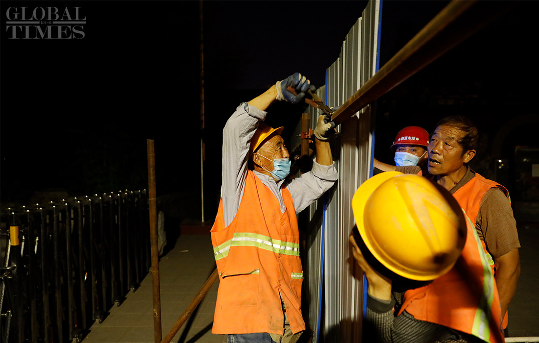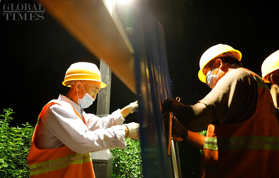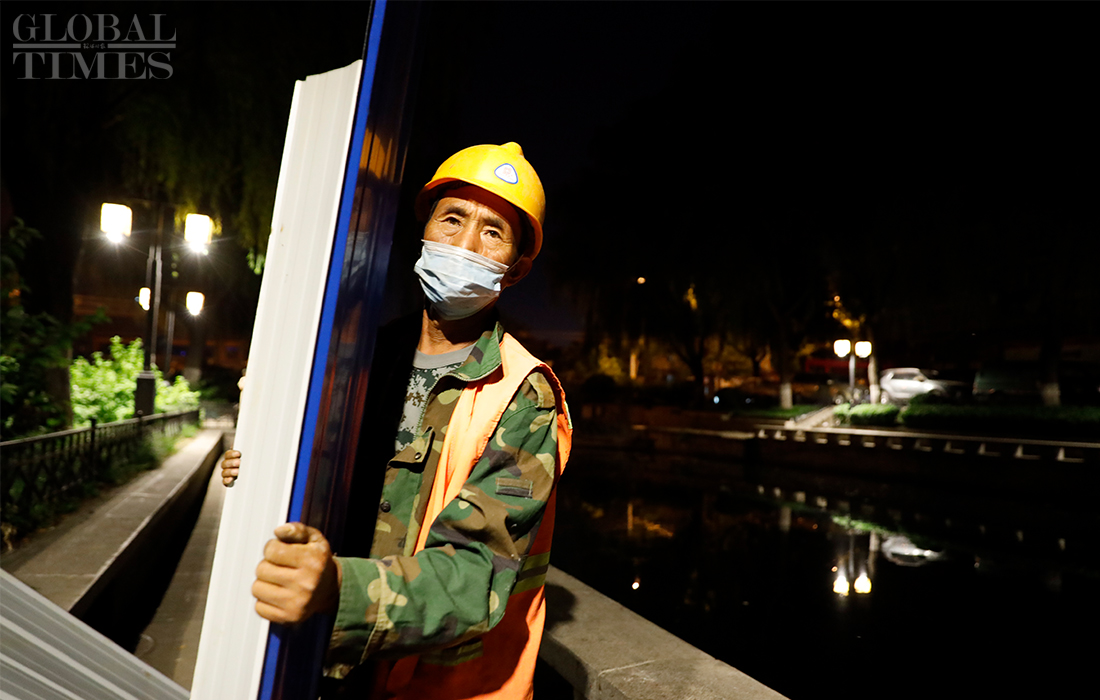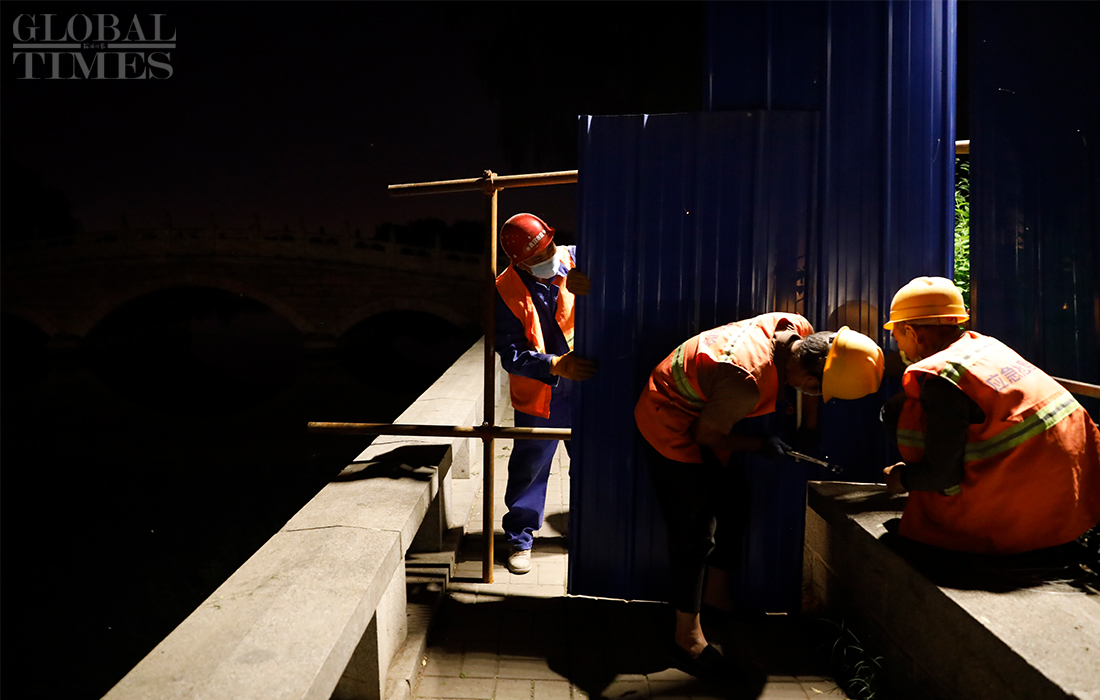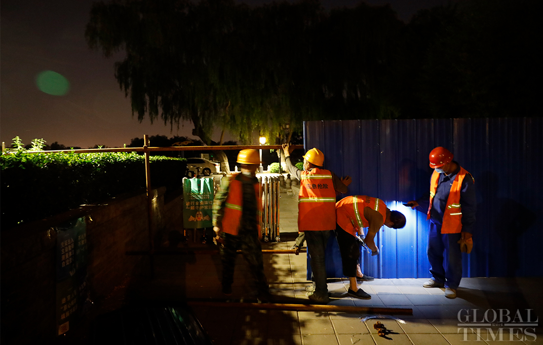 Workers install isolation fences at the Shichahai scenic area in Beijing’s Xicheng district overnight as all communities in the district raised their anti-epidemic measures to level 2 on Sunday. The Beijing Xinfadi wholesale food market became a new coronavirus hot spot as the confirmed cases in the capital were all traced to the market. Beijing has reported 79 COVID-19 active confirmed cases as of Monday. Photos: Li Hao/GT