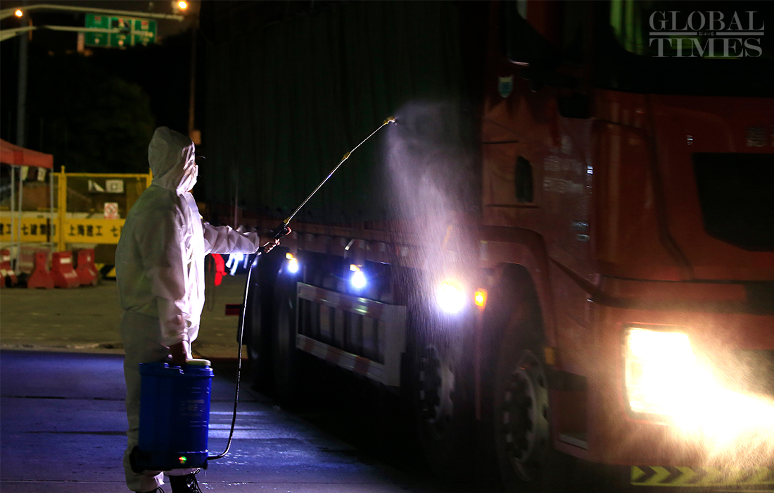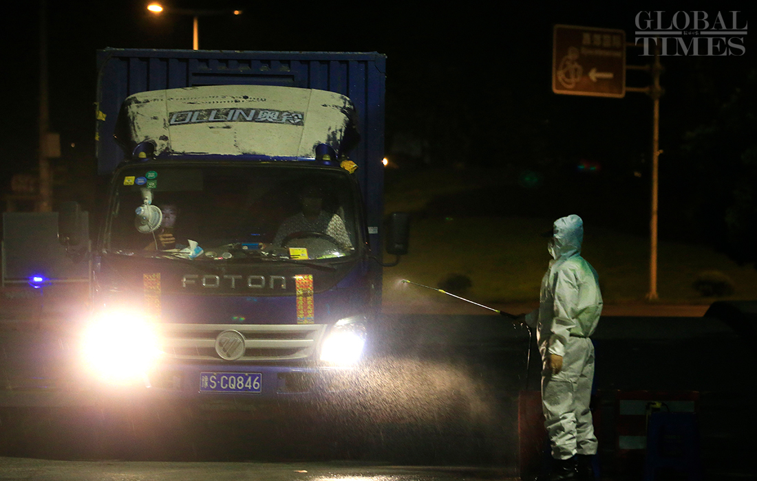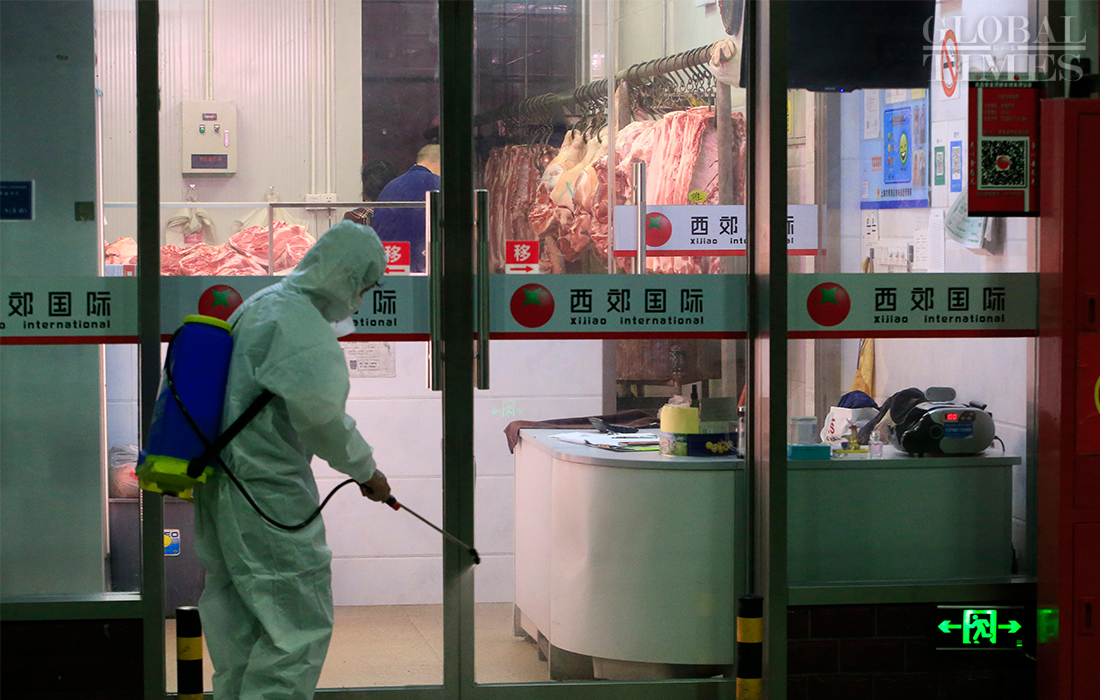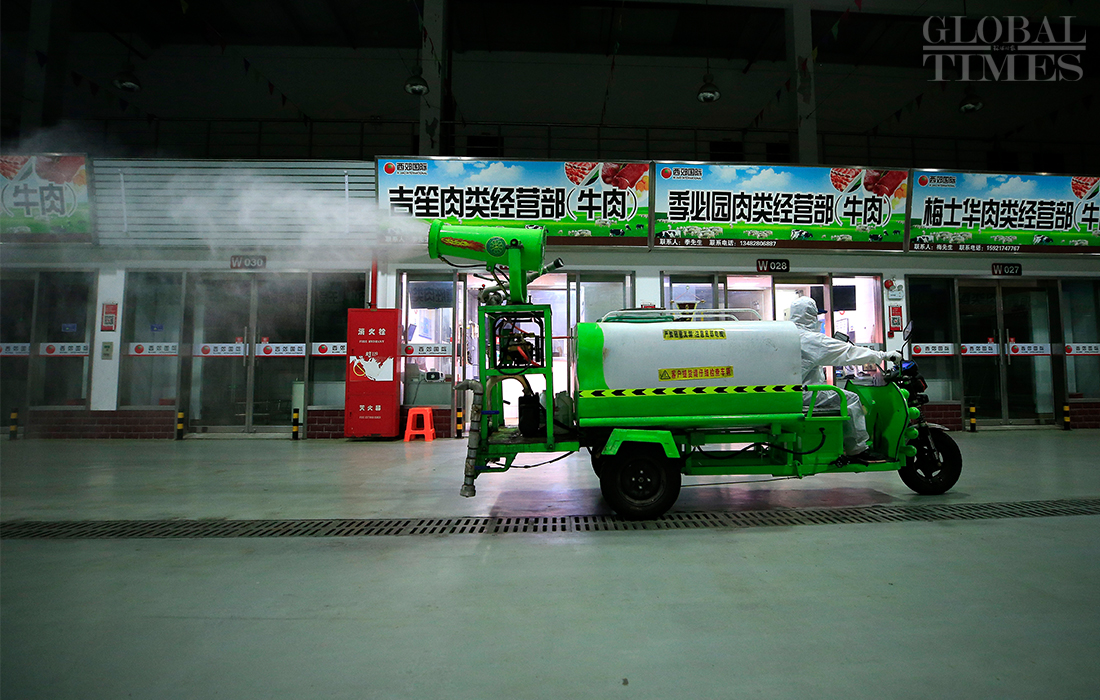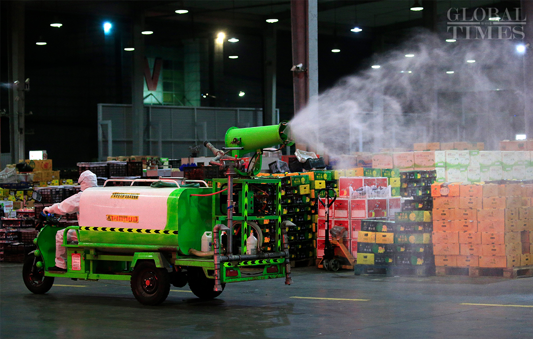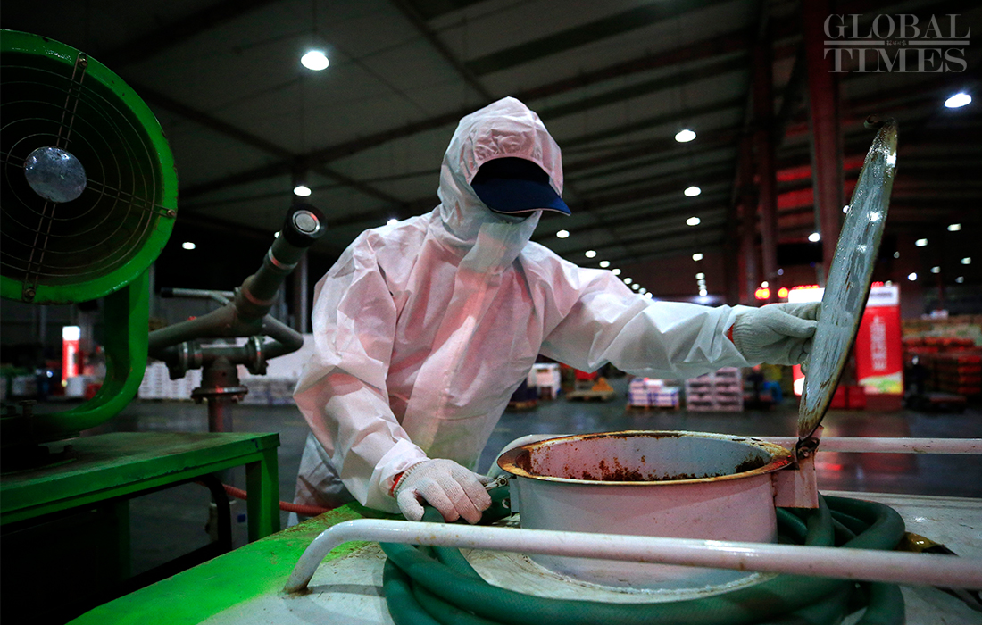 Shanghai’s wholesale food markets on Sunday began to comprehensively strengthen epidemic prevention and control measures, including disinfecting vehicles entering the market, public areas and chopping boards used to process raw meat. Photos: Yang Hui/GT