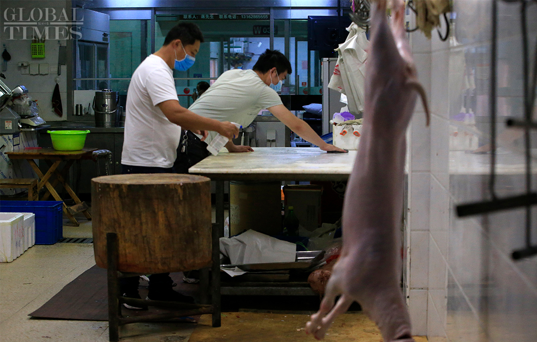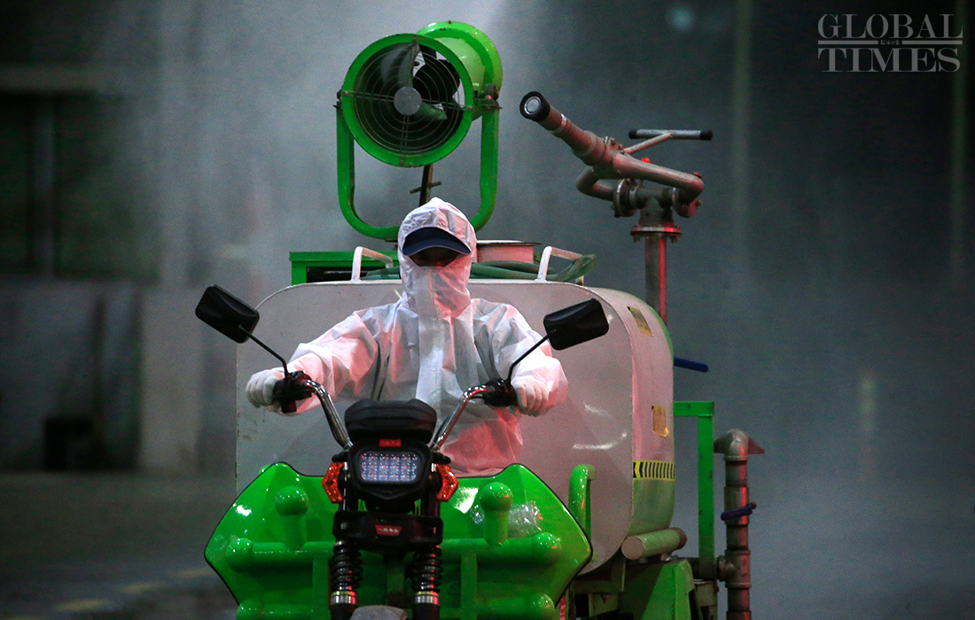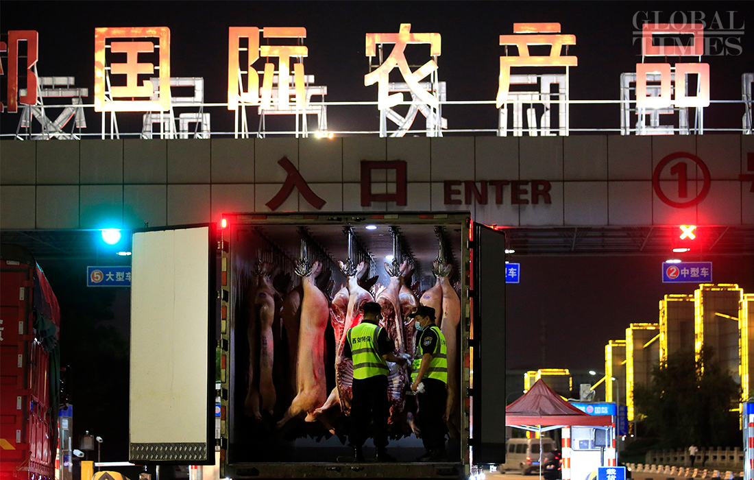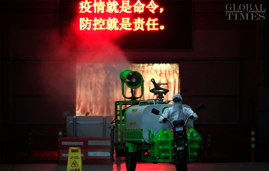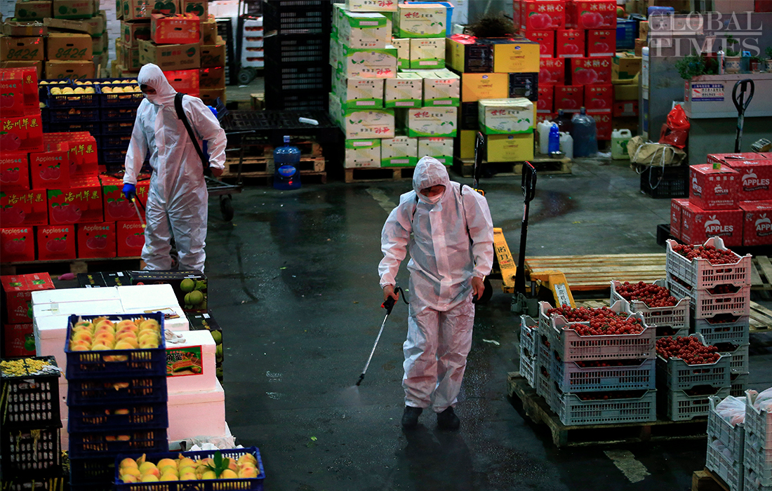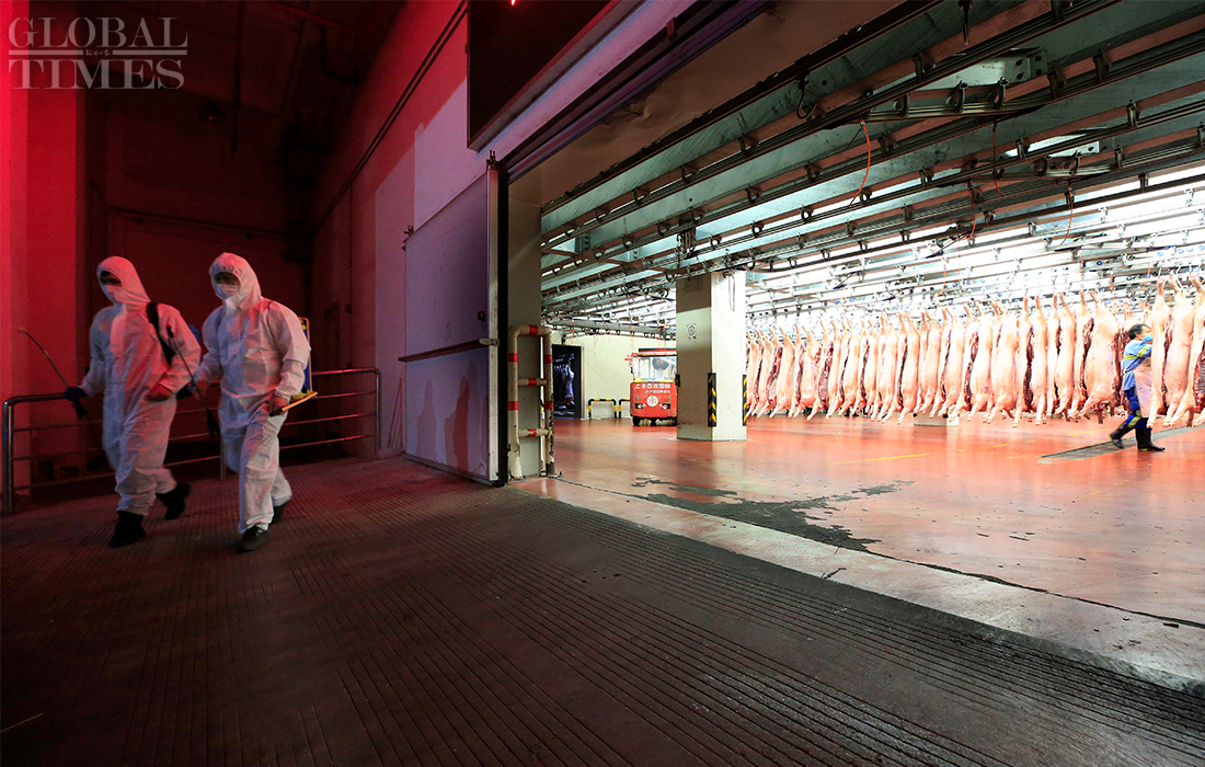 Shanghai’s wholesale food markets on Sunday began to comprehensively strengthen epidemic prevention and control measures, including disinfecting vehicles entering the market, public areas and chopping boards used to process raw meat. Photos: Yang Hui/GT