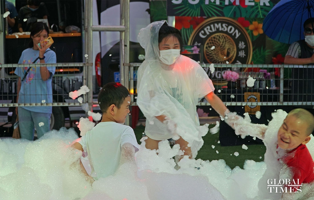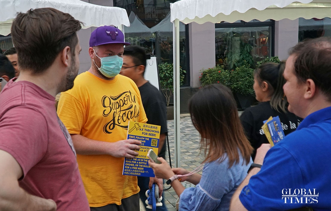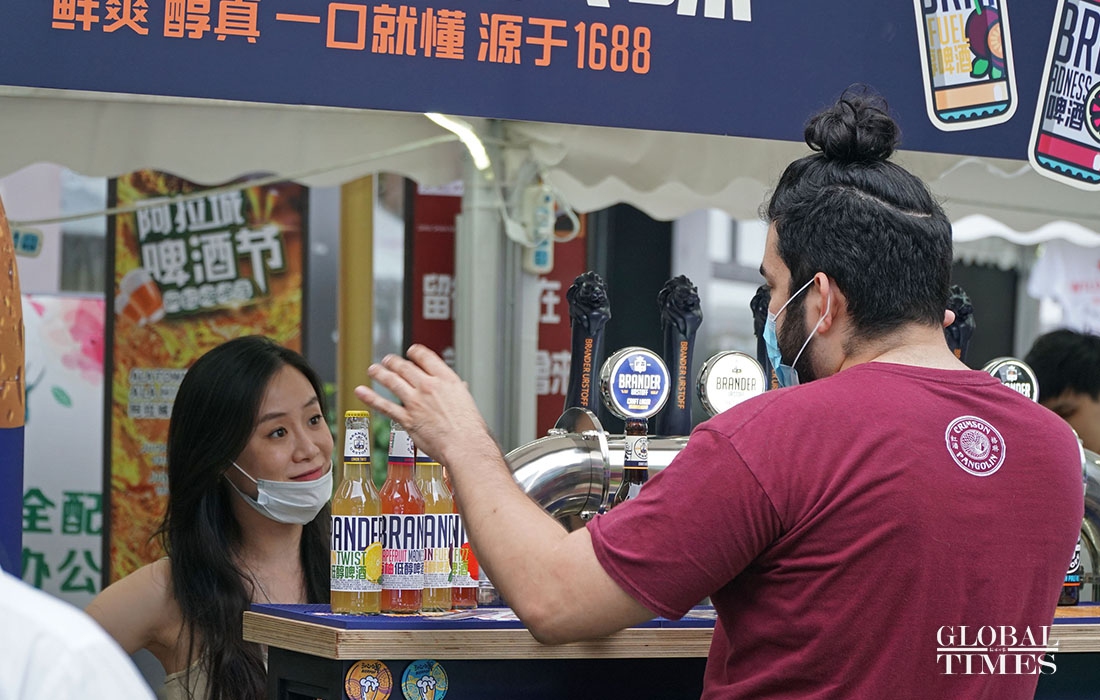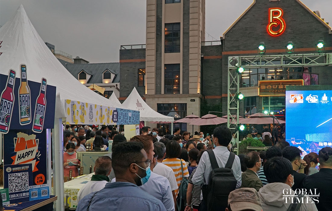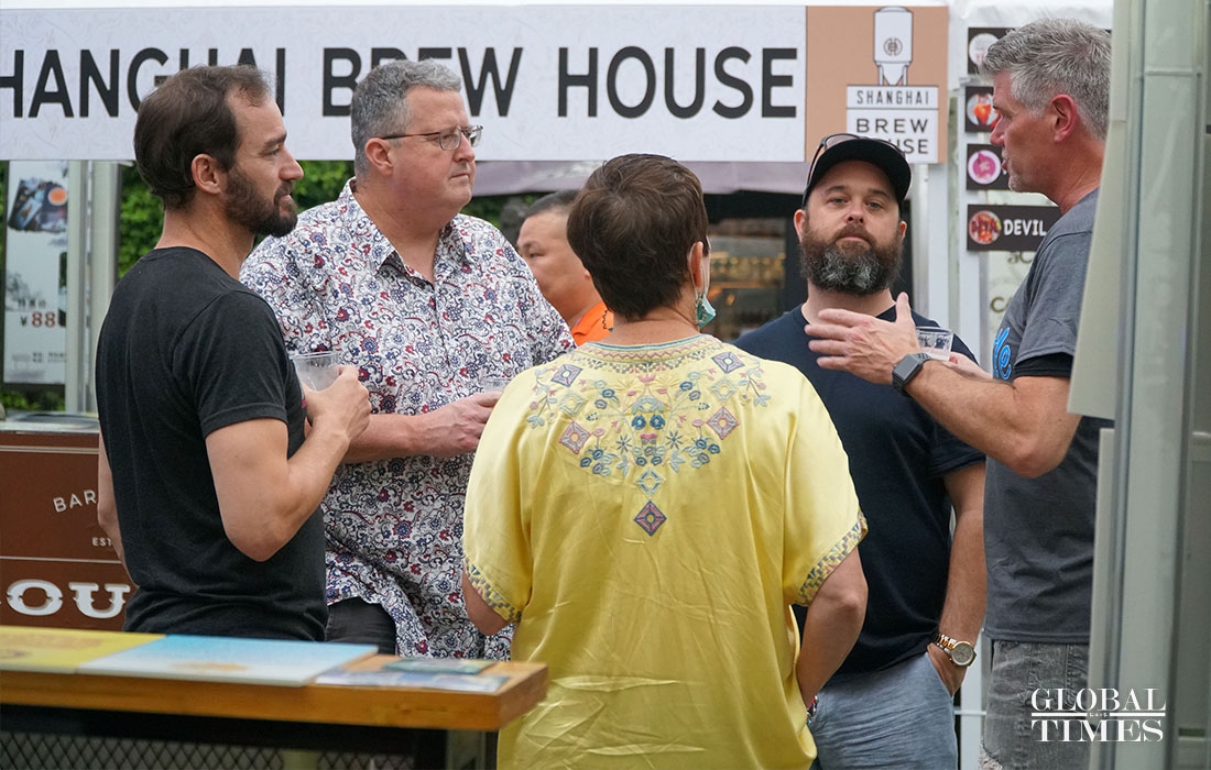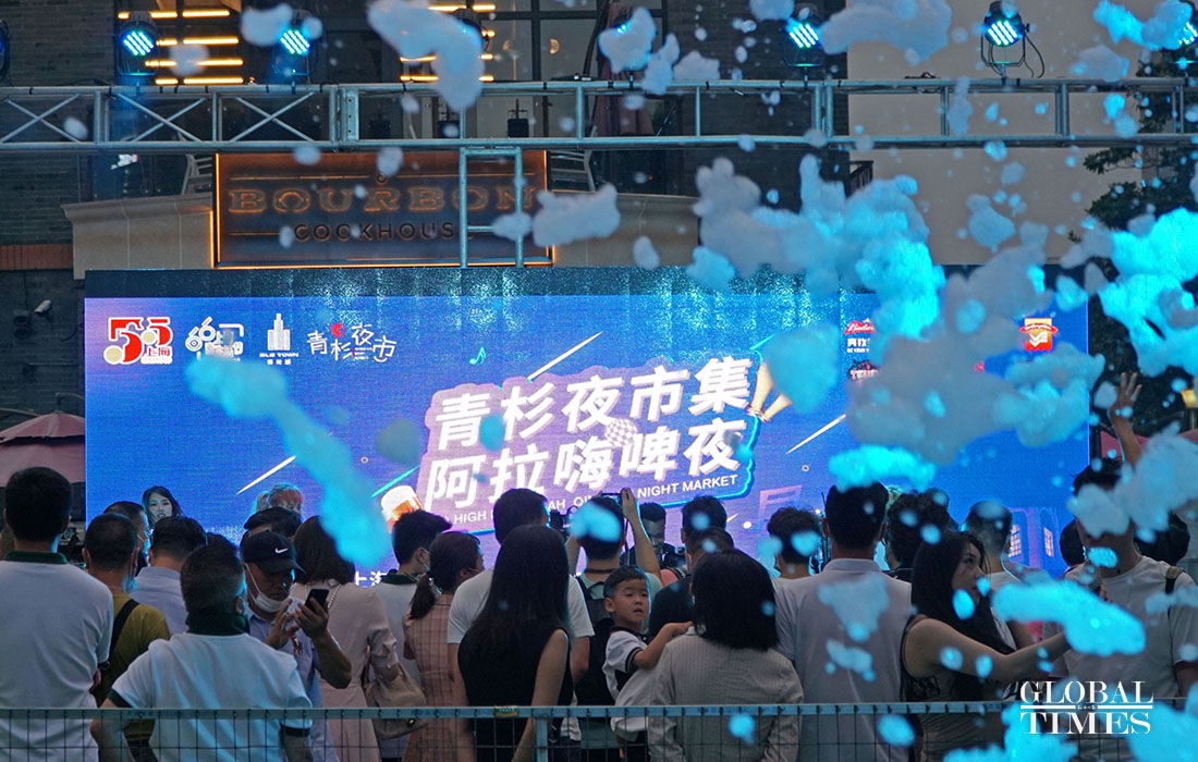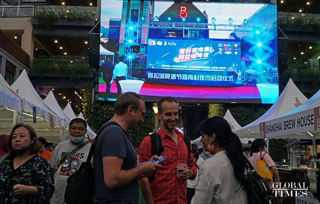 A beer festival kicked off on Friday and will run through this weekend and the next three weekends at the commercial center of Minhang district in Shanghai. Meanwhile, a night market held at the commercial center was also opened to the public on Friday. Local residents can enjoy finely brewed beer of all varieties, delicacies and music, as well as interactive activities during the events. (Photo: Lu Ting)