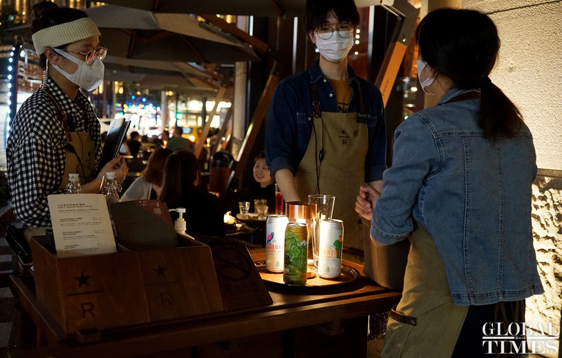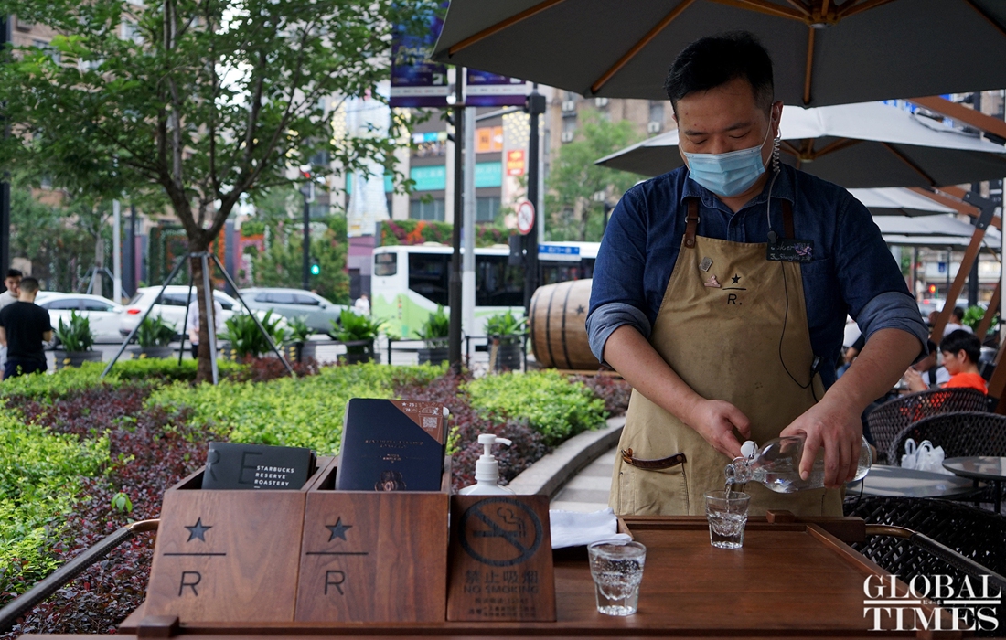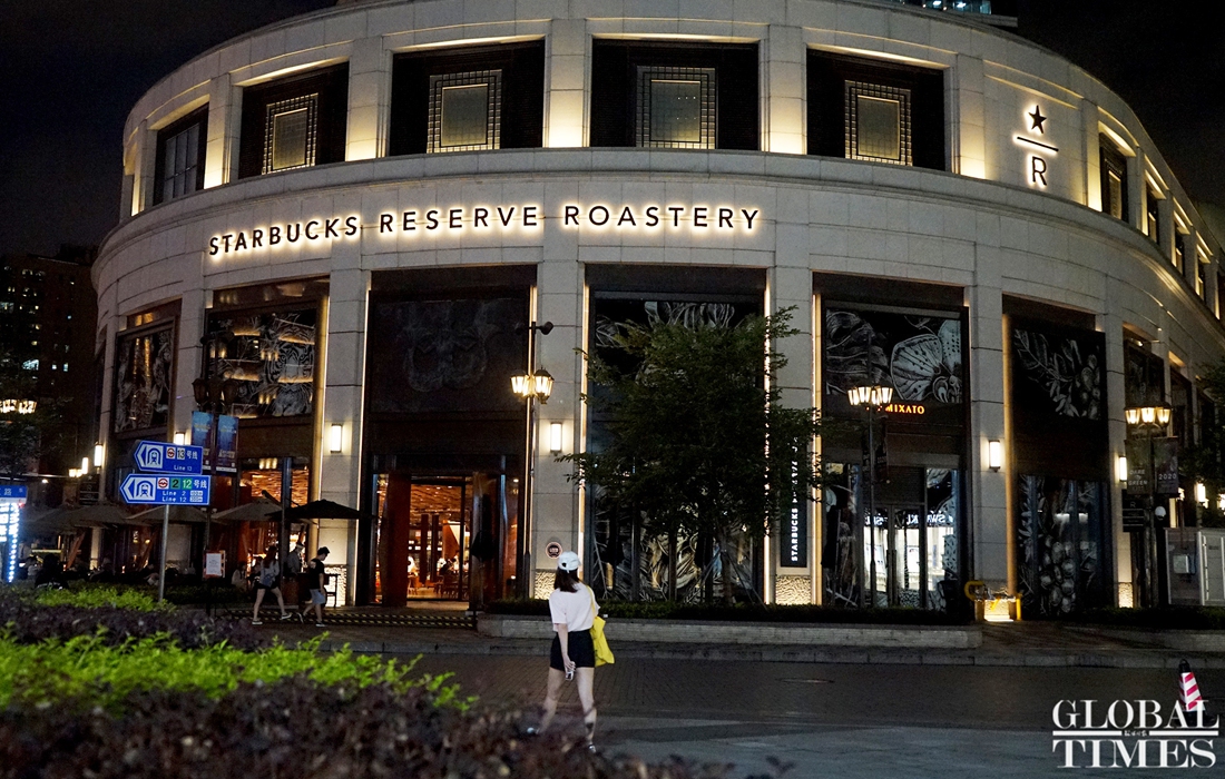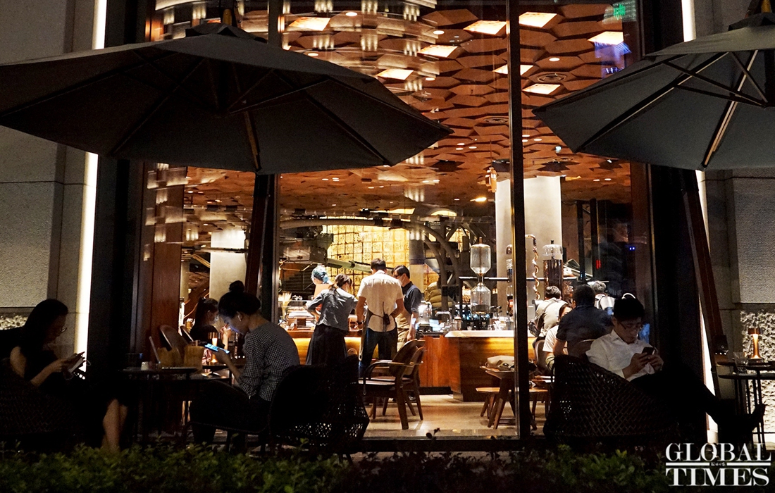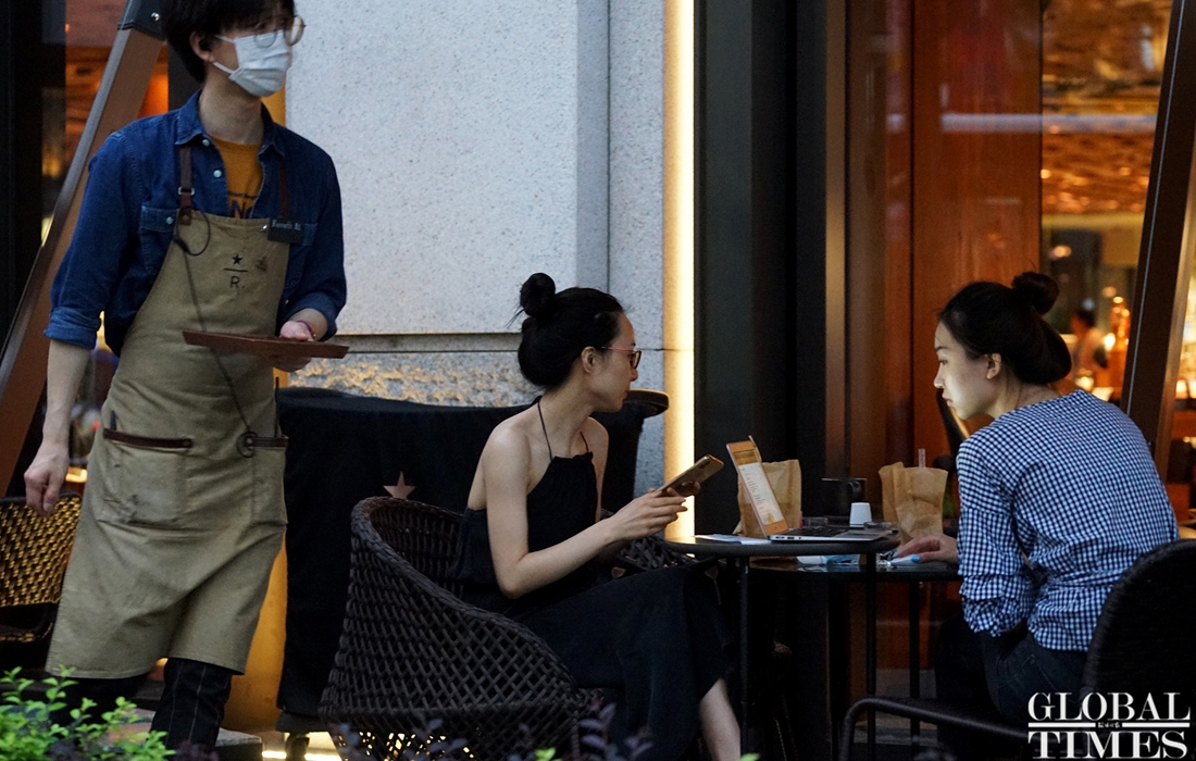 Consumers enjoy leisure time with a cup coffee at the world‘s largest Starbucks outlet, which is located in downtown Shanghai. The branch recently launched an outdoor cafe service from 8 am to 11 pm to serve its customers in the breeze and nice temperatures of summer. (Photos: Chen Xia/GT)