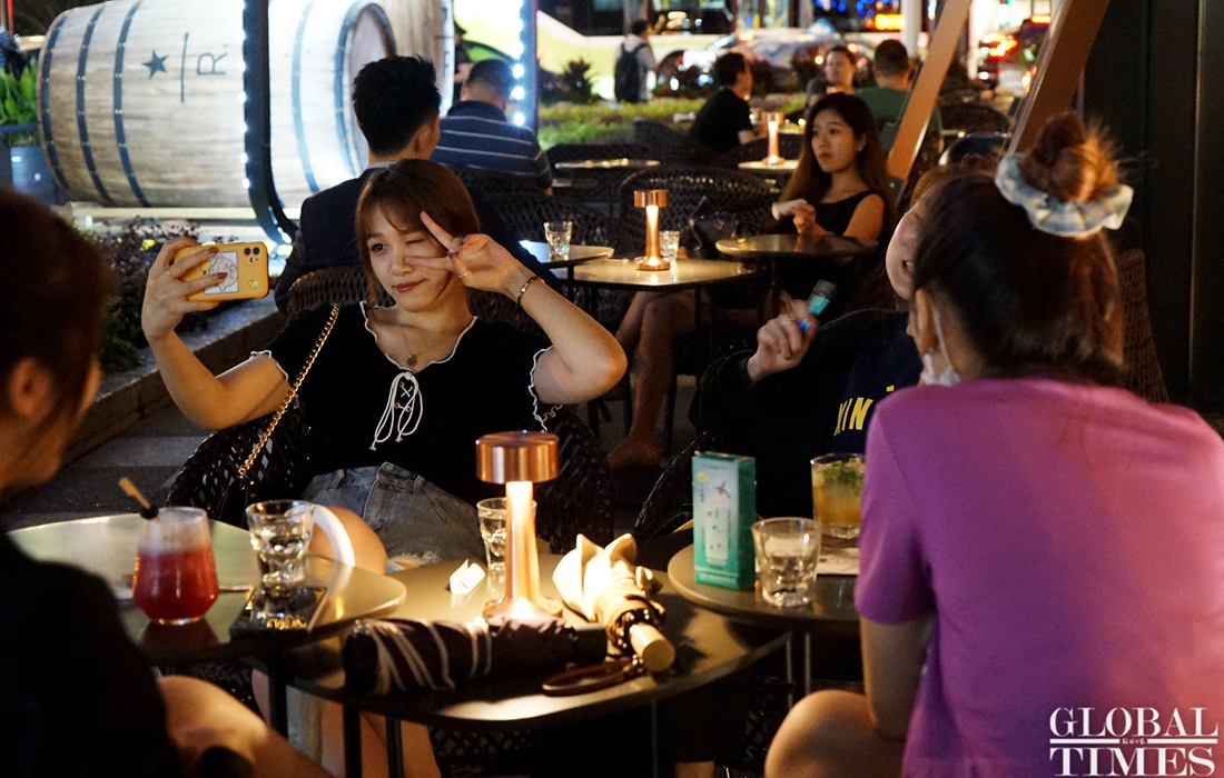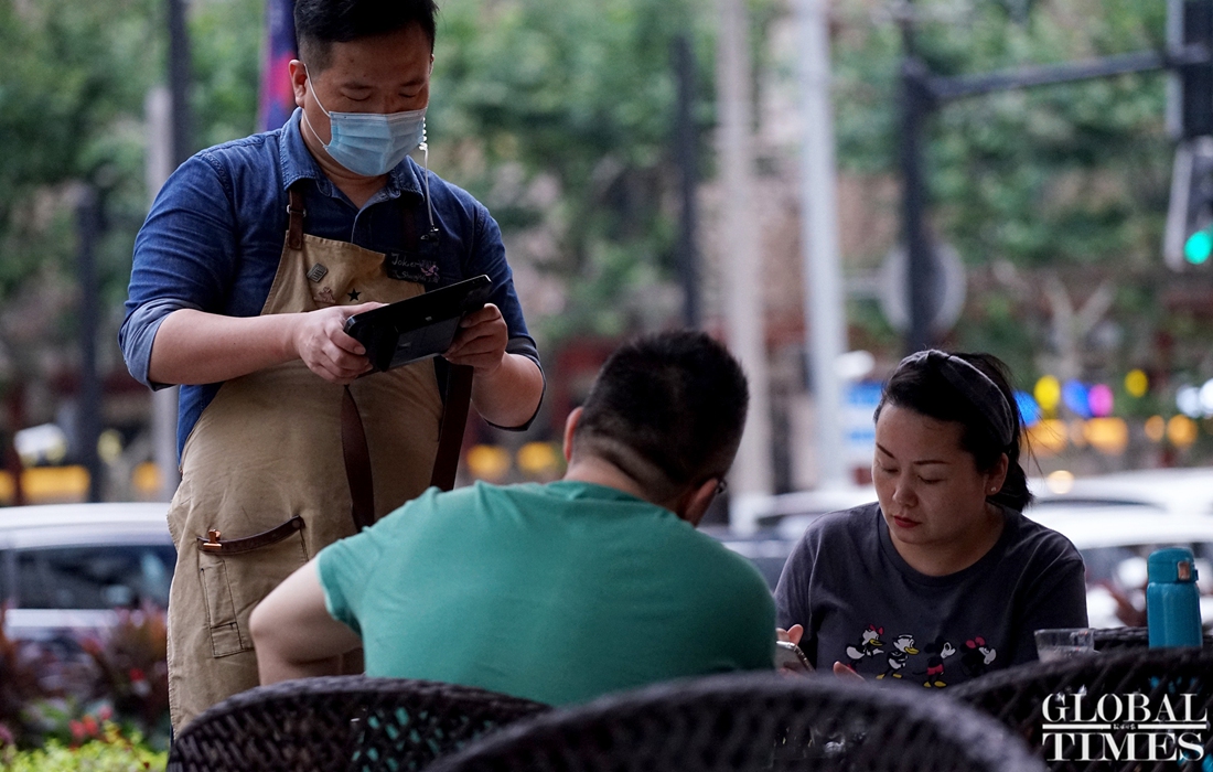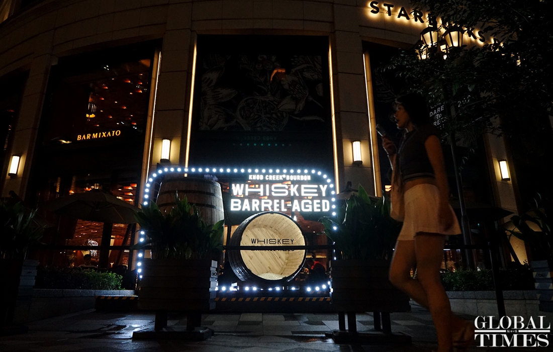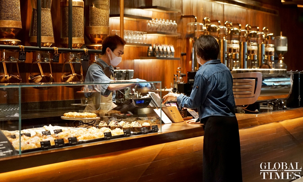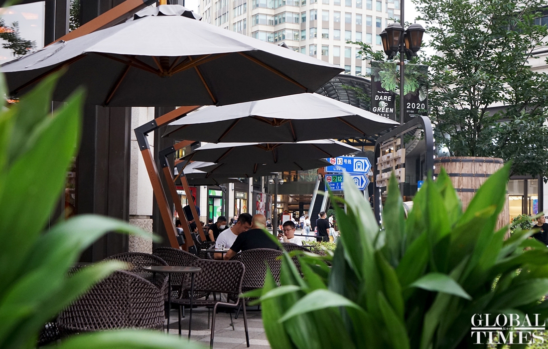 Consumers enjoy leisure time with a cup coffee at the world‘s largest Starbucks outlet, which is located in downtown Shanghai. The branch recently launched an outdoor cafe service from 8 am to 11 pm to serve its customers in the breeze and nice temperatures of summer. (Photos: Chen Xia/GT)